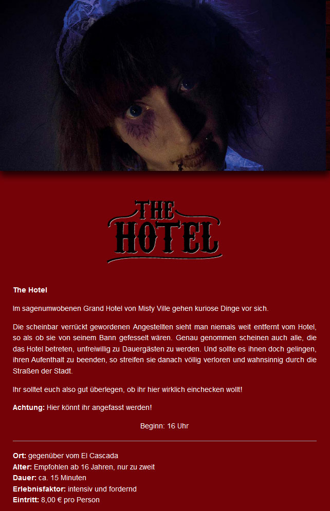 Die Horror-Attraktion "The Hotel" hat auch für den 20.10.2018 kein Bett mehr frei. ALLE Zimmer sind belegt!!!