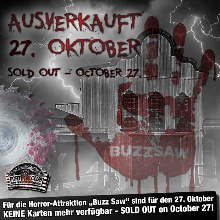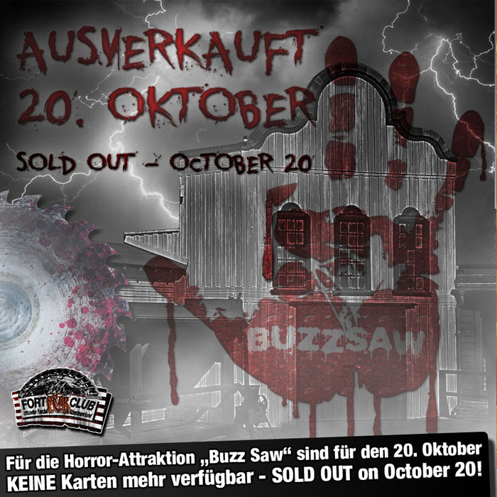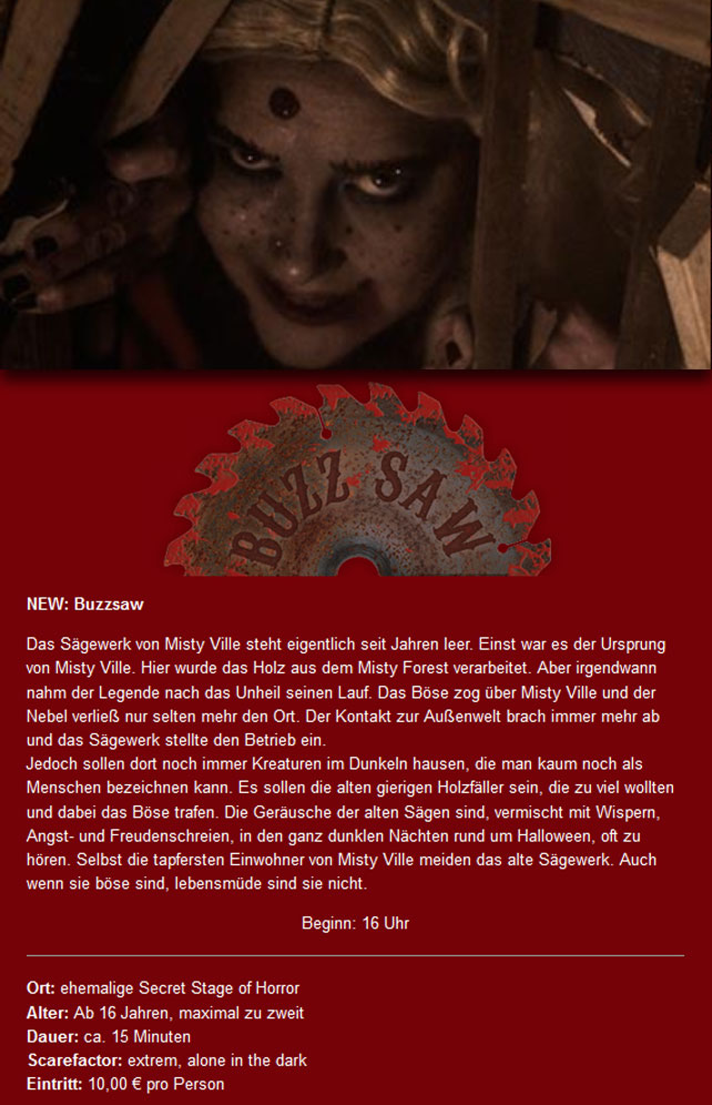 Die erste Maze, "The Hotel", ist bereits an zwei der drei Daten AUSVERKAUFT! Für das neue Extrem-Maze "Buzzsaw" sind am 20. und 27.10 nur noch ein "kläglicher" Rest an Karten frei.