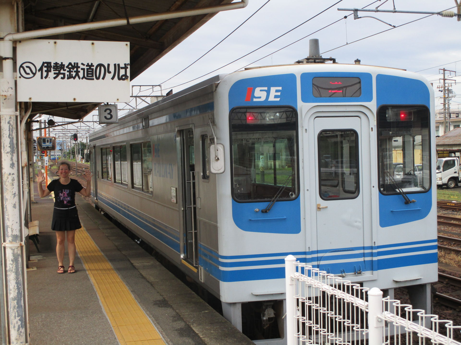 Wir fuhren natürlich so weit wie möglich mit der Kansai Main Line von JR, sodass wir am Bahnhof Kawarada umsteigen sollten. Eine ziemlich kleine Station in einem Ortsteil von Yokkaichi, an der es augenscheinlich noch keinerlei Zugangskontrolle gibt. Man kann den Bahnsteig also offenbar einfach so betreten, ohne sein Ticket oder gar eine IC Card an einem Gate verifizieren zu müssen. Auch einen Mitarbeiter, der unseren Railpass geprüft hätte, konnten wir nirgendwo erspähen. Brauchten wir aber eh nicht, da wir schließlich nur umsteigen wollten. Also ging es am Ende des Bahnsteigs die Treppe hoch, aber nicht nach links über die Brücke, sondern nach rechts wieder ein Stück runter und mit einem Tunnel in den abzweigenden Bahndamm hinein. Zwischen den Gleisen dann wieder hinaus ans Tageslicht auf den allerhöchstens 50 Meter langen Bahnsteig (mit etwas tieferer und noch einfacher gehaltener "Notverlängerung" etwa das Doppelte). Dementsprechend war natürlich auch der "Zug" dimensioniert, der uns hier wenig später aufsammelte. Leider habe ich diesen nicht fotografiert, weshalb ich mal frecherweise auf ein Bild aus dem Notizblocktagebuch von speedfreak und turbine zurückgreife: