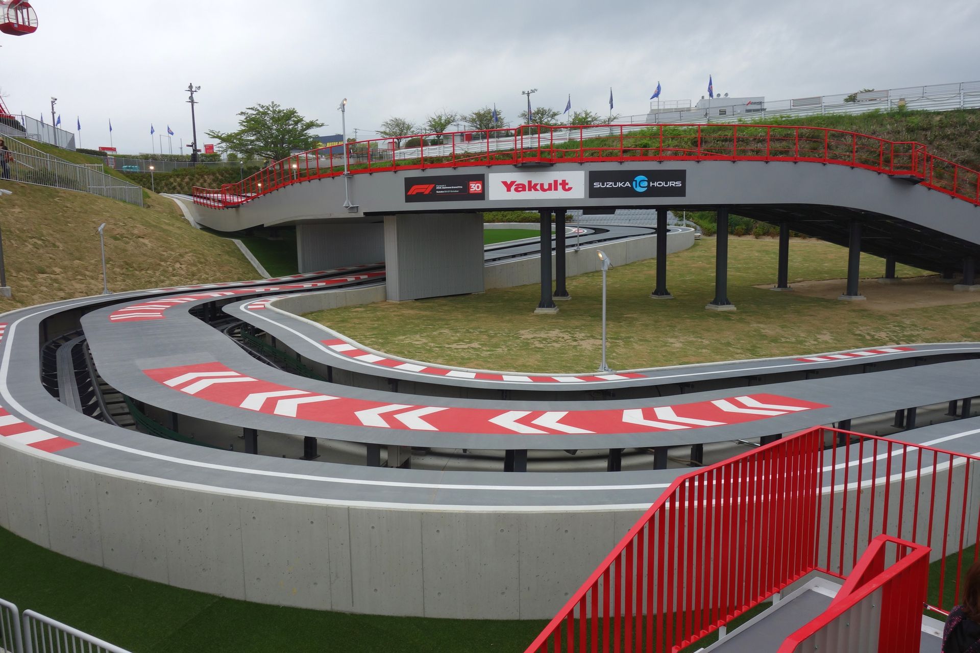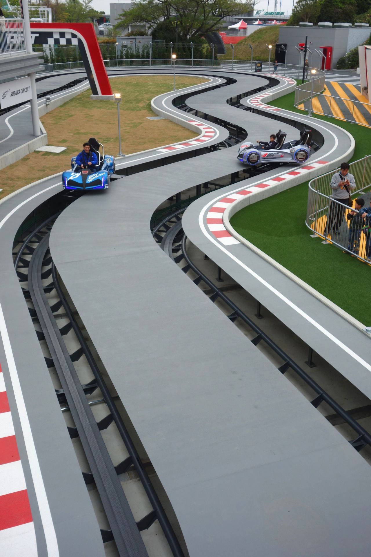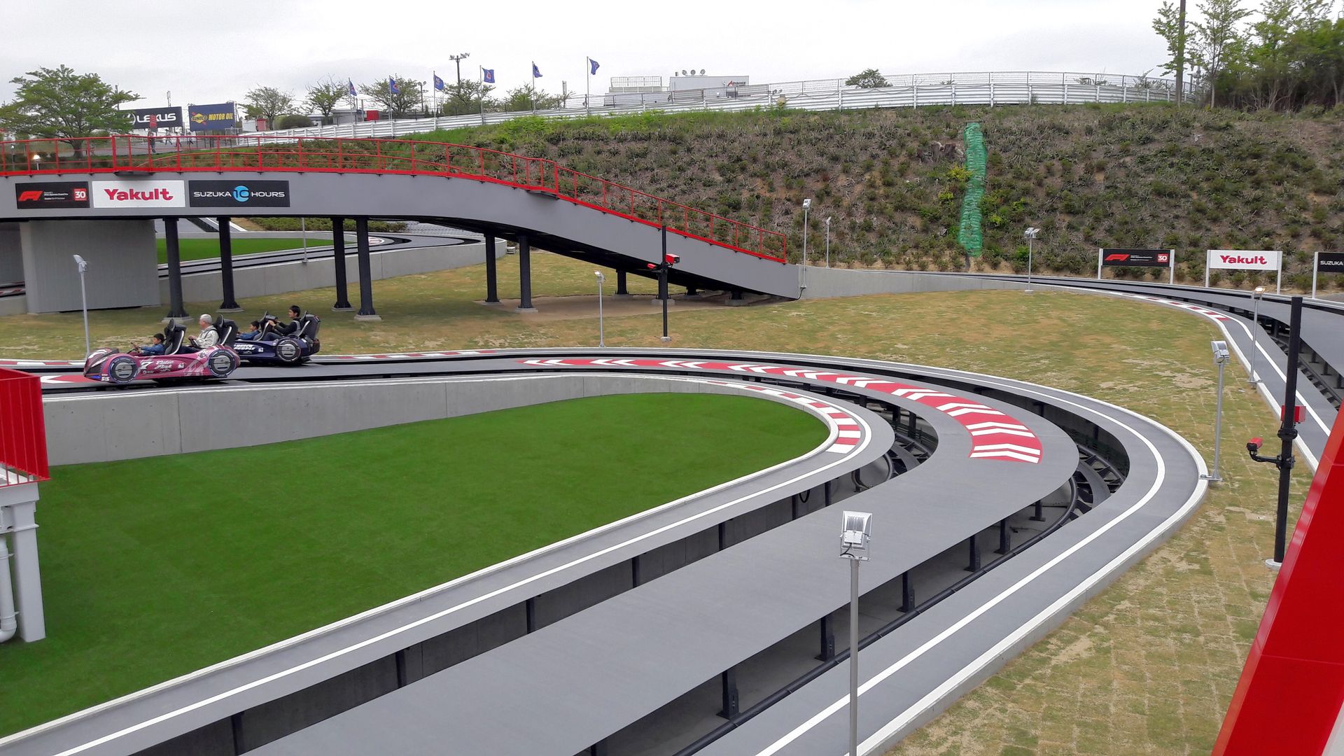 Für 1500 Yen Aufpreis kann man sich einen der limitierten Plätze erkaufen und dann in einem Elektro-Kart über die echte Rennstrecke fahren. Mit Video-Einweisung durch Ex-Formel-1-Pilot und Indi-500-Gewinner Takuma Sato. Allerdings befährt man nur den East Circuit, muss also nach den berühmten "Esses" in der Dunlop-Kurve rechts abbiegen und auf die Start-Ziel-Gerade zurückkehren. Das Ganze auch nur mit atemberaubenden 30 km/h Spitzengeschwindigkeit. Aber man fährt halt über eine echte Rennstrecke, die schon fast ein dutzend Weltmeisterschaften in der Formel 1 entschieden hat und deren einzigartiges Layout mit Überführung einfach legendär ist.