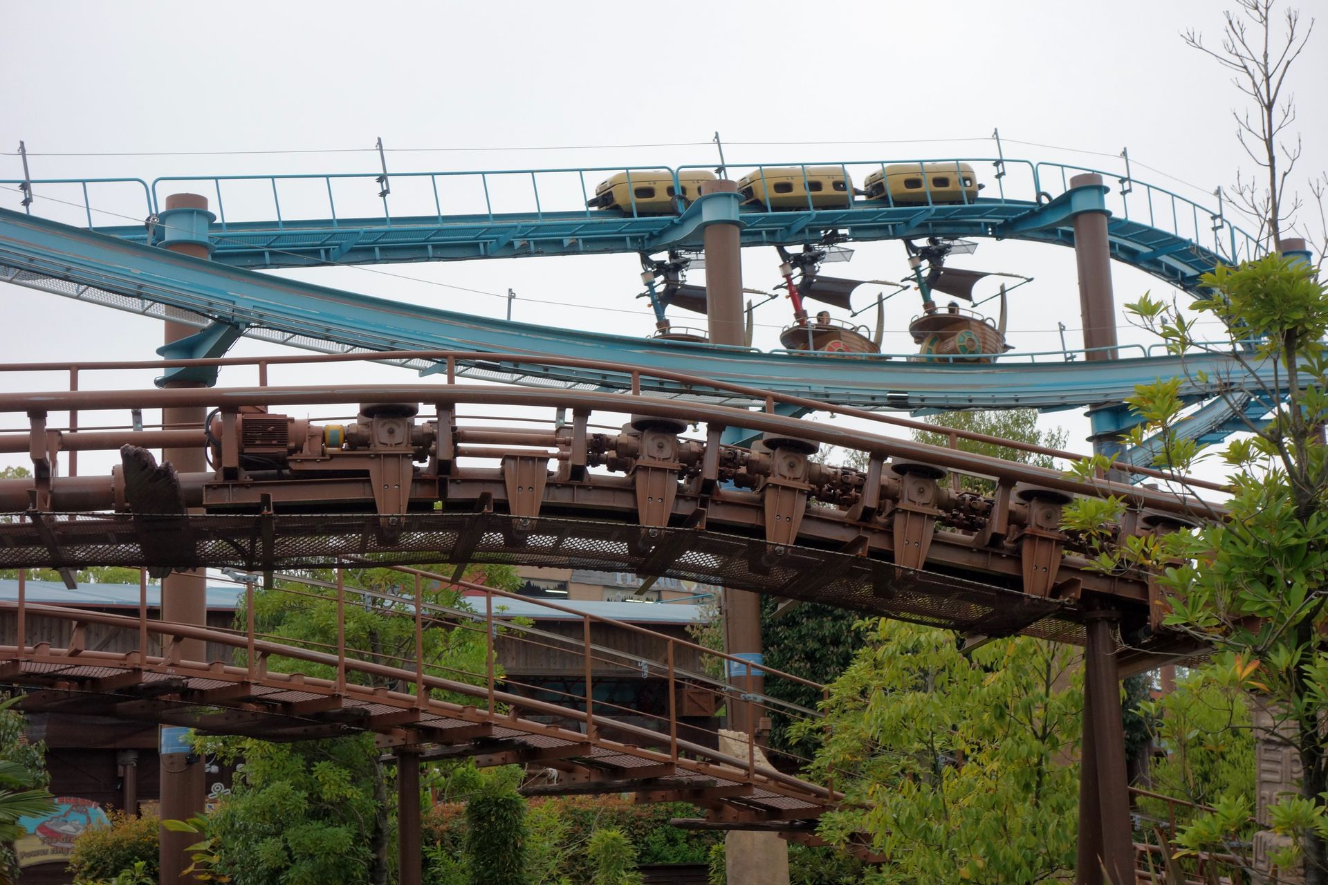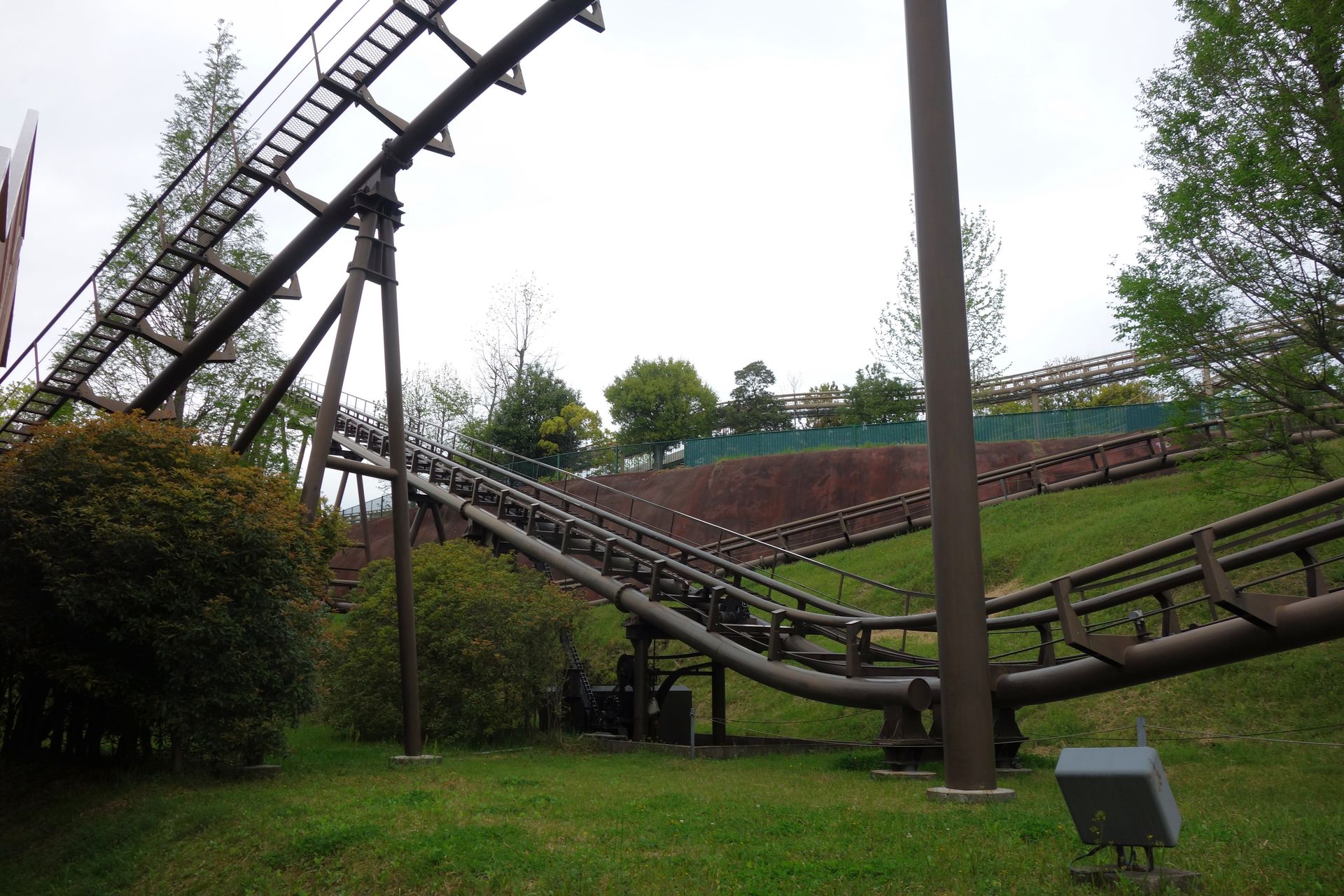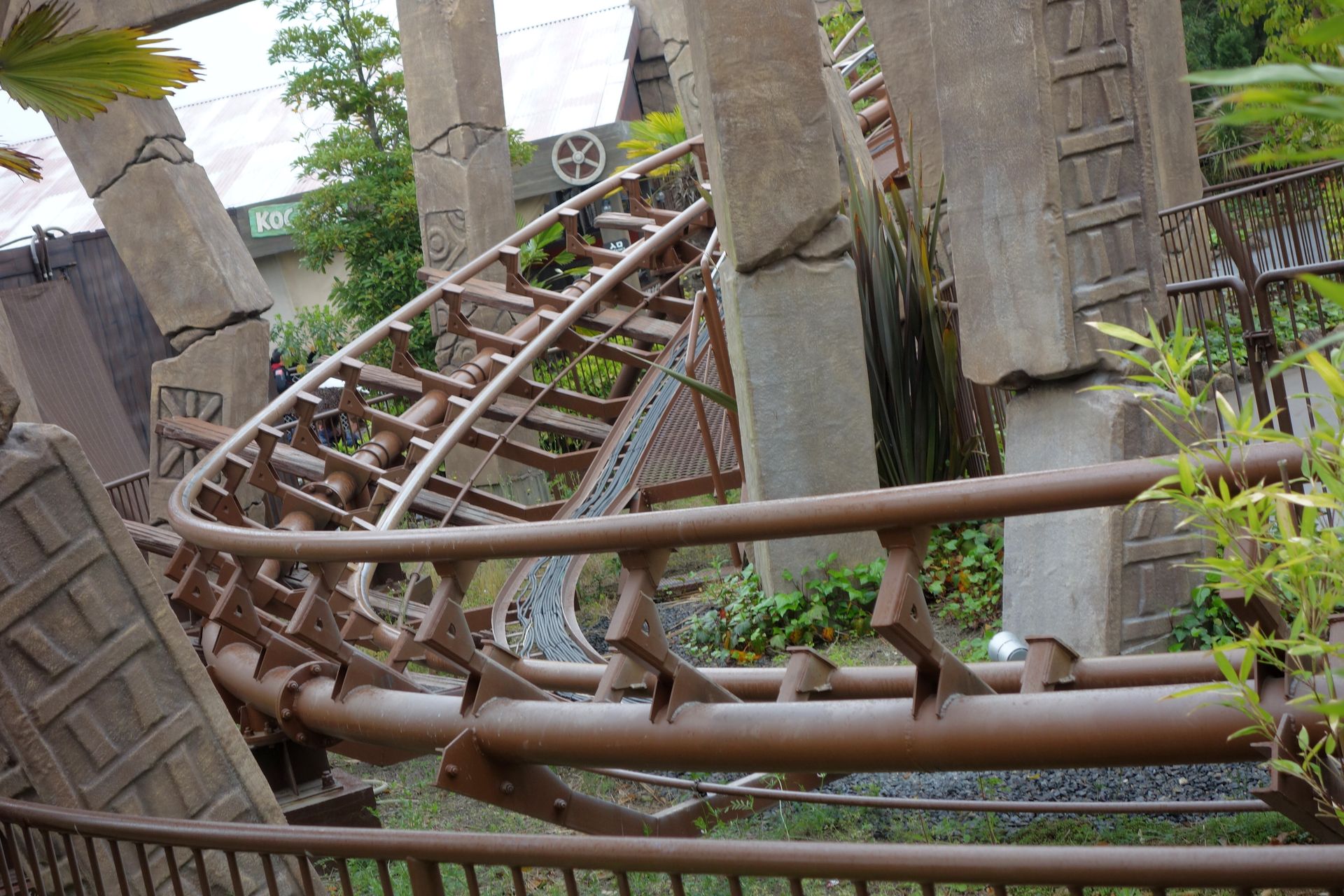 Mit den diversen Anstiegen und Abfahrten über dem Adventure Village hatte die durchaus achterbahnige Züge. Als Counter wären wir aber wohl besser die Hochbahn (Den-Den-Mushi) hinter dem Rocky Coaster gefahren. Die ist zwar genauso Powered, hat aber ein ähnliches Schienenprofil wie Duel GP und gemäß Onride-Video wird die gewellte Passage, die man auf dem Bild weiter oben erahnen kann, völlig frei befahren. Und Bremsen sind auf der Strecke auch montiert. Rein vom Video hätte ich das noch eher als Count deklarieren wollen als Duel GP. Aber wir hatten ja leider keine Zeit mehr für diesen Teil des Parks.