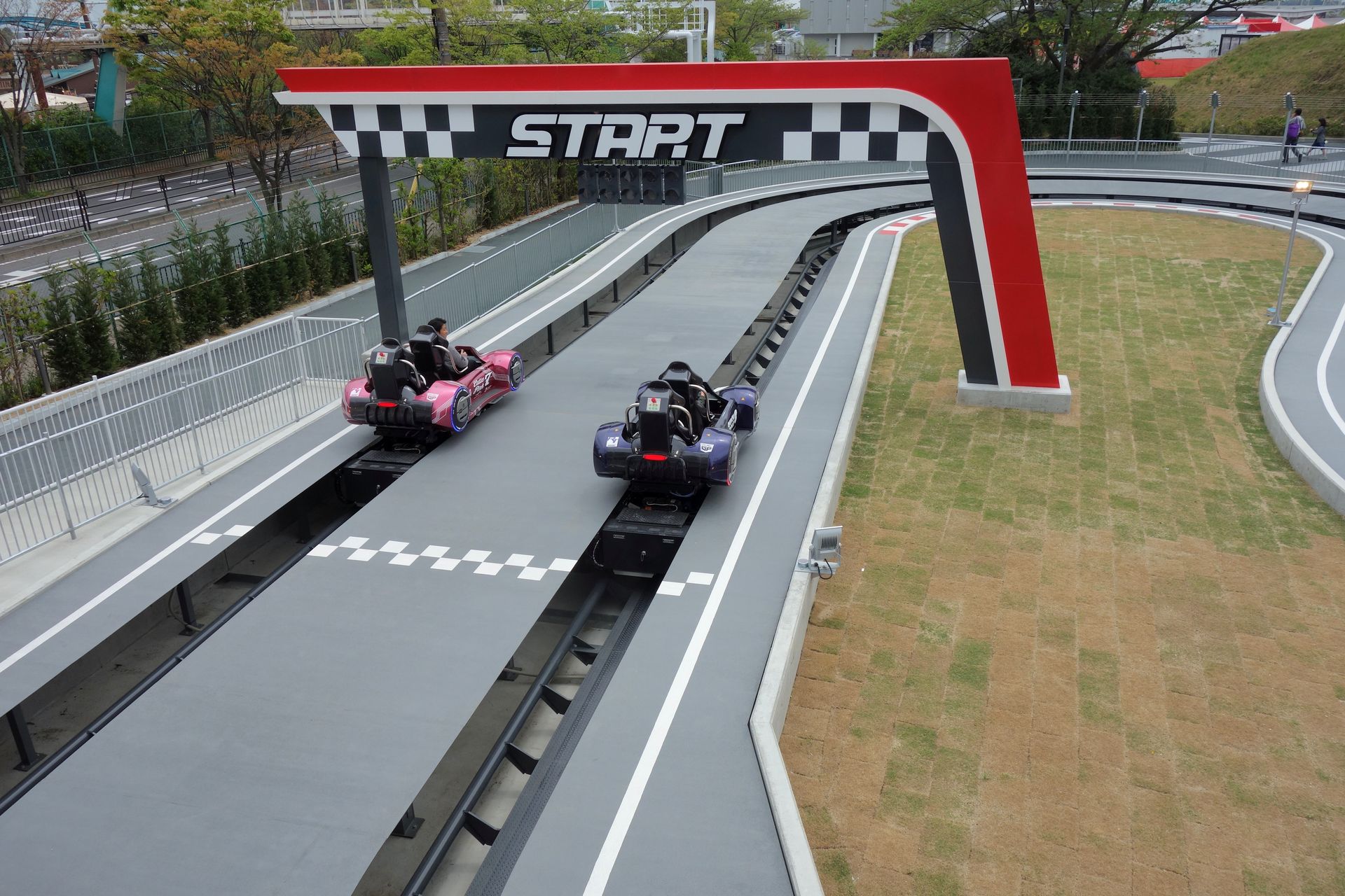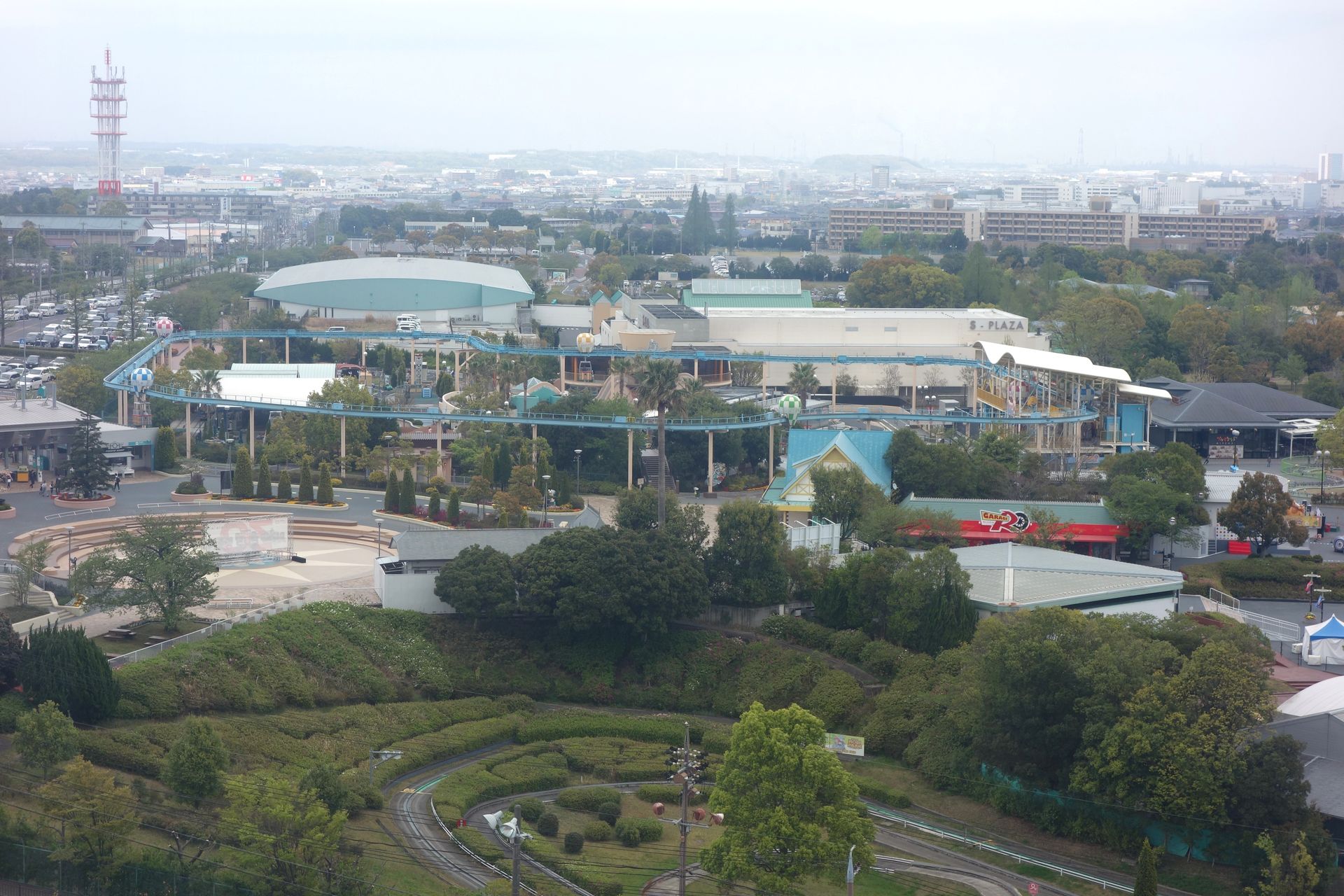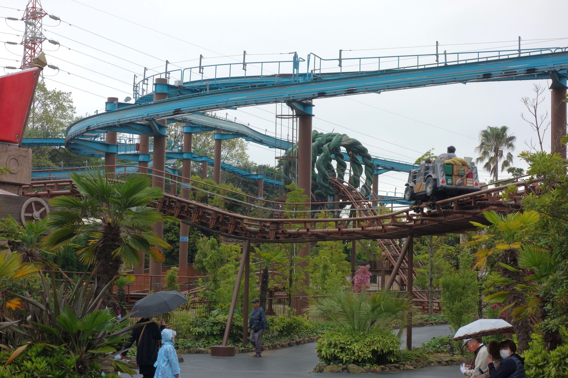 Mit den diversen Anstiegen und Abfahrten über dem Adventure Village hatte die durchaus achterbahnige Züge. Als Counter wären wir aber wohl besser die Hochbahn (Den-Den-Mushi) hinter dem Rocky Coaster gefahren. Die ist zwar genauso Powered, hat aber ein ähnliches Schienenprofil wie Duel GP und gemäß Onride-Video wird die gewellte Passage, die man auf dem Bild weiter oben erahnen kann, völlig frei befahren. Und Bremsen sind auf der Strecke auch montiert. Rein vom Video hätte ich das noch eher als Count deklarieren wollen als Duel GP. Aber wir hatten ja leider keine Zeit mehr für diesen Teil des Parks.