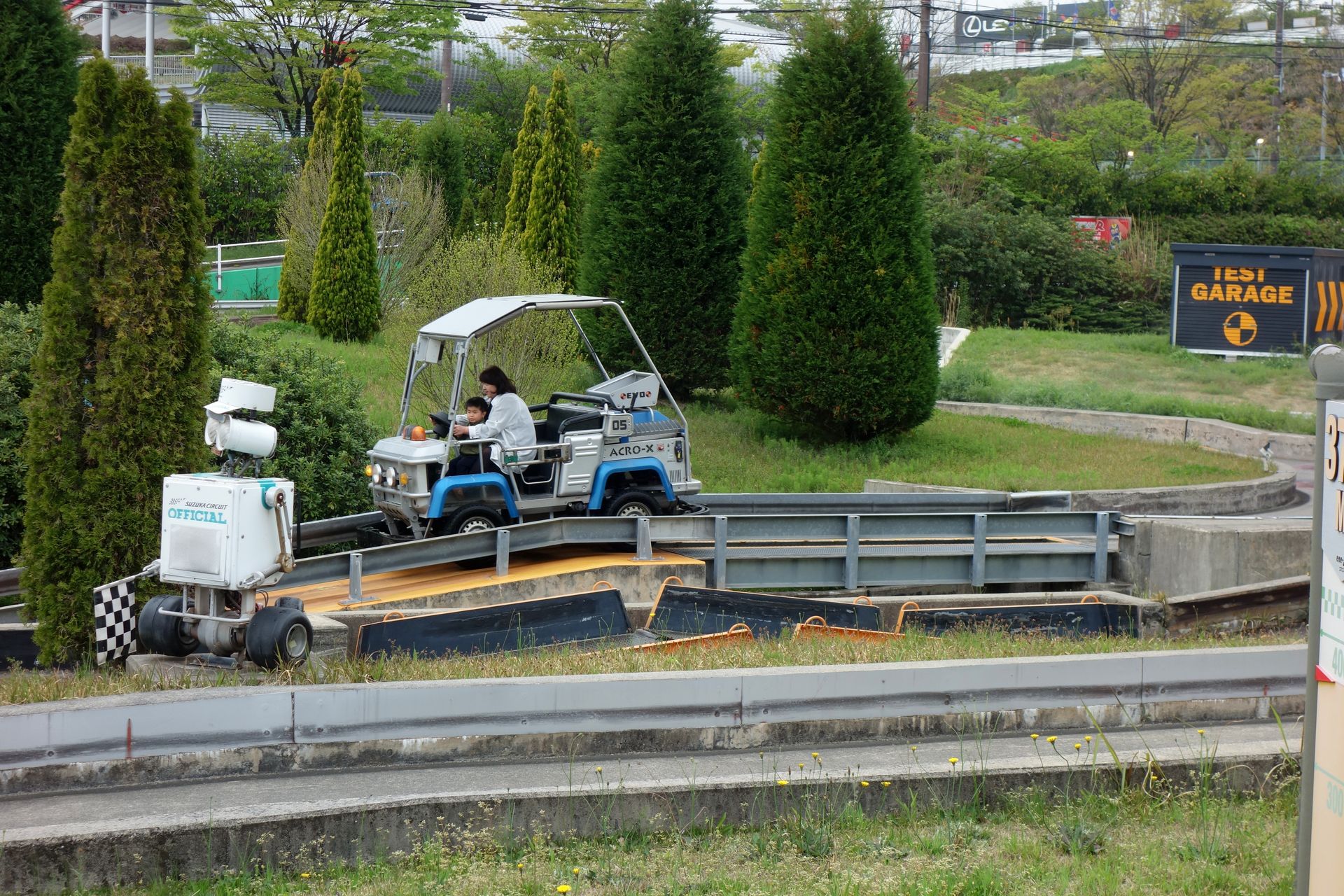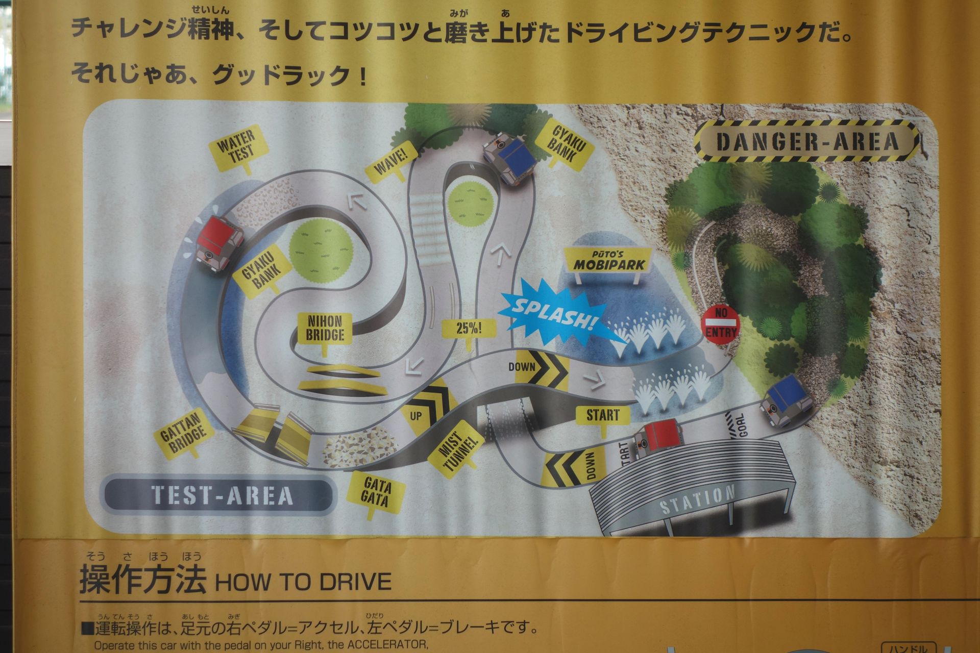 Jawohl, wer ein Rennen besuchen will, der muss zwangsläufig durch den Freizeitpark. Der Ticketpreis enthält also immer auch den Eintritt für den Park, die Attraktionen müssen aber natürlich extra bezahlt werden. Der Grund für den Park waren übrigens die sogenannten "Kaminari", welche in den 50ern mit ihren modifizierten Motorrädern mit enormem Lärm über die öffentlichen Straßen heizten. Das war nicht nur gefährlich, sondern störte auch die übrige Bevölkerung. Also erdachte sich Honda Freizeitparks, welche diesen Kaminari verschiedene Rundkurse boten, auf denen sie sich in Zeitfahren messen konnten. Gleichzeitig sollten diverse andere Attraktionen für die ganze Familie schon bei den jüngsten Besuchern die Begeisterung für den Motorsport - und insbesondere natürlich für Honda - wecken. Insgesamt waren wohl über 60 Standorte im Gespräch, letztlich wurden allerdings nur vier Parks realisiert. Ikoma Tech (1961) wurde bereits 1965 wieder geschlossen, Asaka Tech (1964) schloss 1973. Der Ur-Park Tama Tech (1961) hielt immerhin bis 2009 durch, dann war auch dort wegen sinkender Besucherzahlen Schluss. Geblieben ist lediglich der Motopia Park am Suzuka Circuit, welcher 1963 - ein Jahr nach der Strecke selbst - eröffnet wurde. Der Eintritt samt Motopia Passport für unlimitierte Fahrten kostet 4300 Yen. Die Kassiererin erkannte jedoch, dass wir Ausländer sein mussten, und bat um die Vorlage des Reisepasses. Damit zahlten wir nämlich 200 Yen weniger. Nicht die Welt, aber man spart ja, wo man kann. Der Passport ist übrigens kein Wristband, sondern wirklich ein Passport. Man bekommt also eine Plastikkarte, die man an den Attraktionen vorzeigen muss. Fand ich doch etwas ungünstig, da man das Kärtchen jedes Mal aufs neue rauskramen musste und ständig Angst hatte, es zu verlieren.