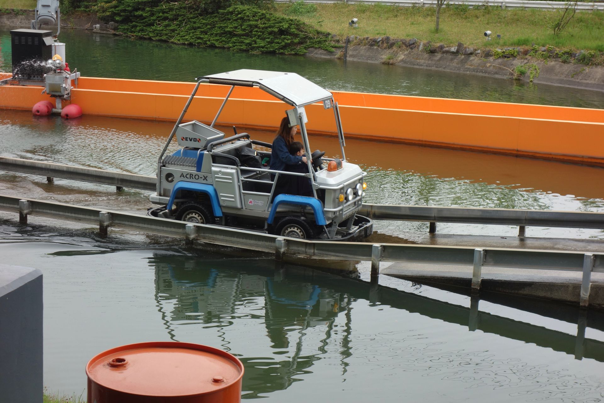 Die Schlusskurve führt dann durch die Danger Area, welche mit diversen Unebenheiten gespickt ist. Und für alle diese Prüfungen gibt es Punkte. Bei Fehlern werden wieder Punkte abgezogen. Leider hatten wir nur eine Einweisung in die Steuerung des Fahrzeugs bekommen. Worauf es bei den einzelnen Tests ankommt, wussten wir dagegen nicht. Dennoch erreichten wir alle genügend Punkte für den Führerschein der Klasse A (70-99 Punkte), die nötigen 100 Punkte für die Klasse S verpassten wir aber. Bei mir scheiterte es am Spurhalten in der Danger Area, da habe ich die Kurve einmal etwas zu eng genommen. Die weiteren Fehler sind mir wie gesagt nicht bekannt, ich hatte auch erst gegen Ende mitbekommen, dass auf dem Bildschirm im Fahrzeug die Aufgaben und die erreichten Punkte angezeigt wurden...