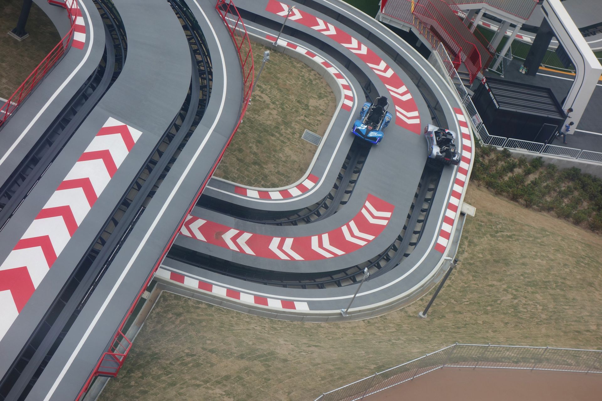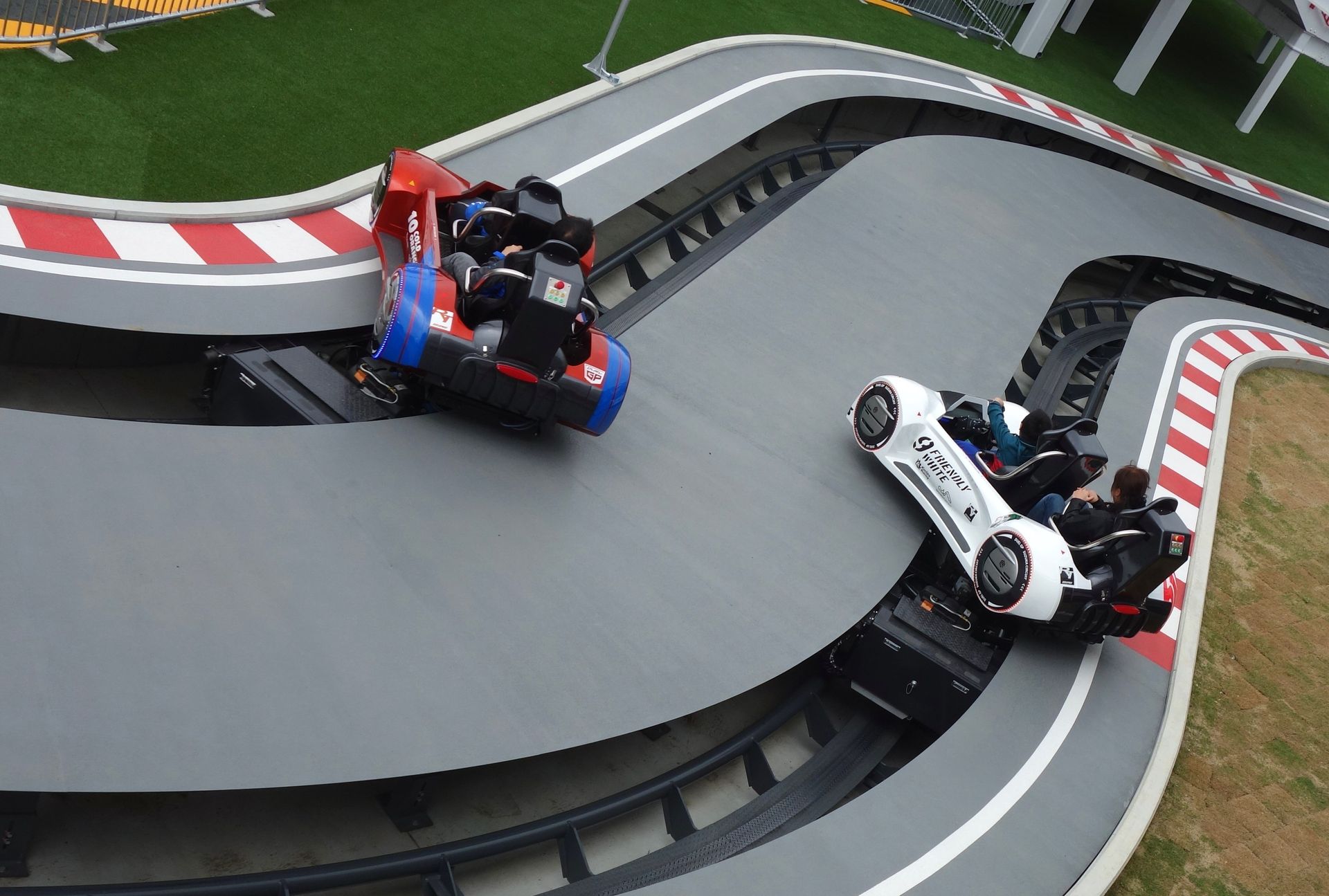 Die Schiene sieht natürlich sehr nach Achterbahn aus, leider konnte ich noch immer keinen Hersteller herausfinden. Natürlich ist es maximal ein Powered Coaster, noch dazu mit weitestgehend gleichbleibendem Tempo. Nur auf der Brücke dreht das Ding eben voll auf. Ungewöhnlich für einen Powered Coaster sind aber wohl die Bremsschwerter, also da reicht die Motorbremse wohl nicht aus um die Schwerkraft auszugleichen. Gerade dieser Teil fühlte sich einfach nach Achterbahn an. Der Rest zugegebenermaßen nicht ganz so sehr, aber da machte das Driften halt einfach Spaß - was sicherlich besser passt als beim "Drifting Coaster", den ich noch nicht testen konnte.