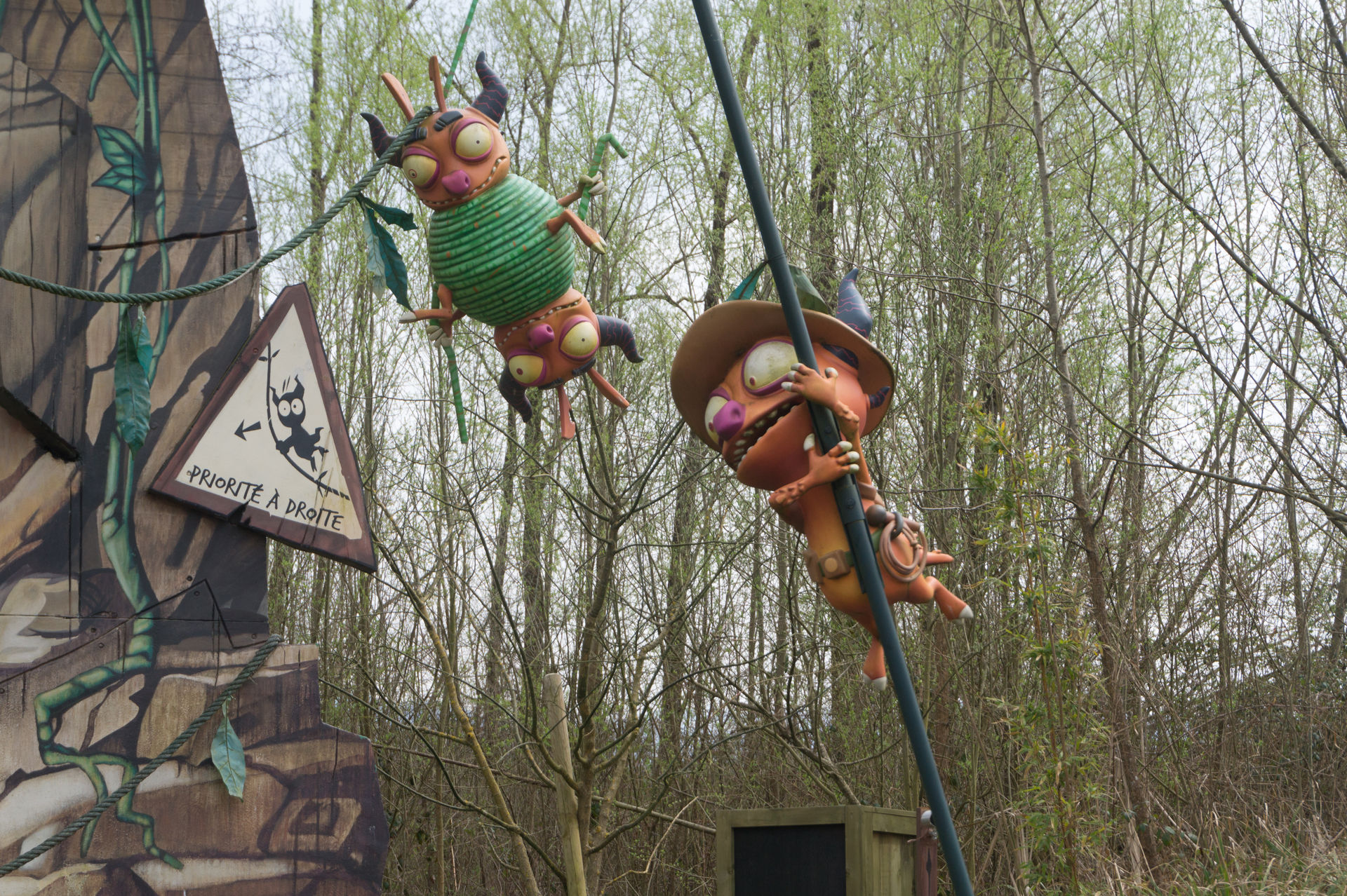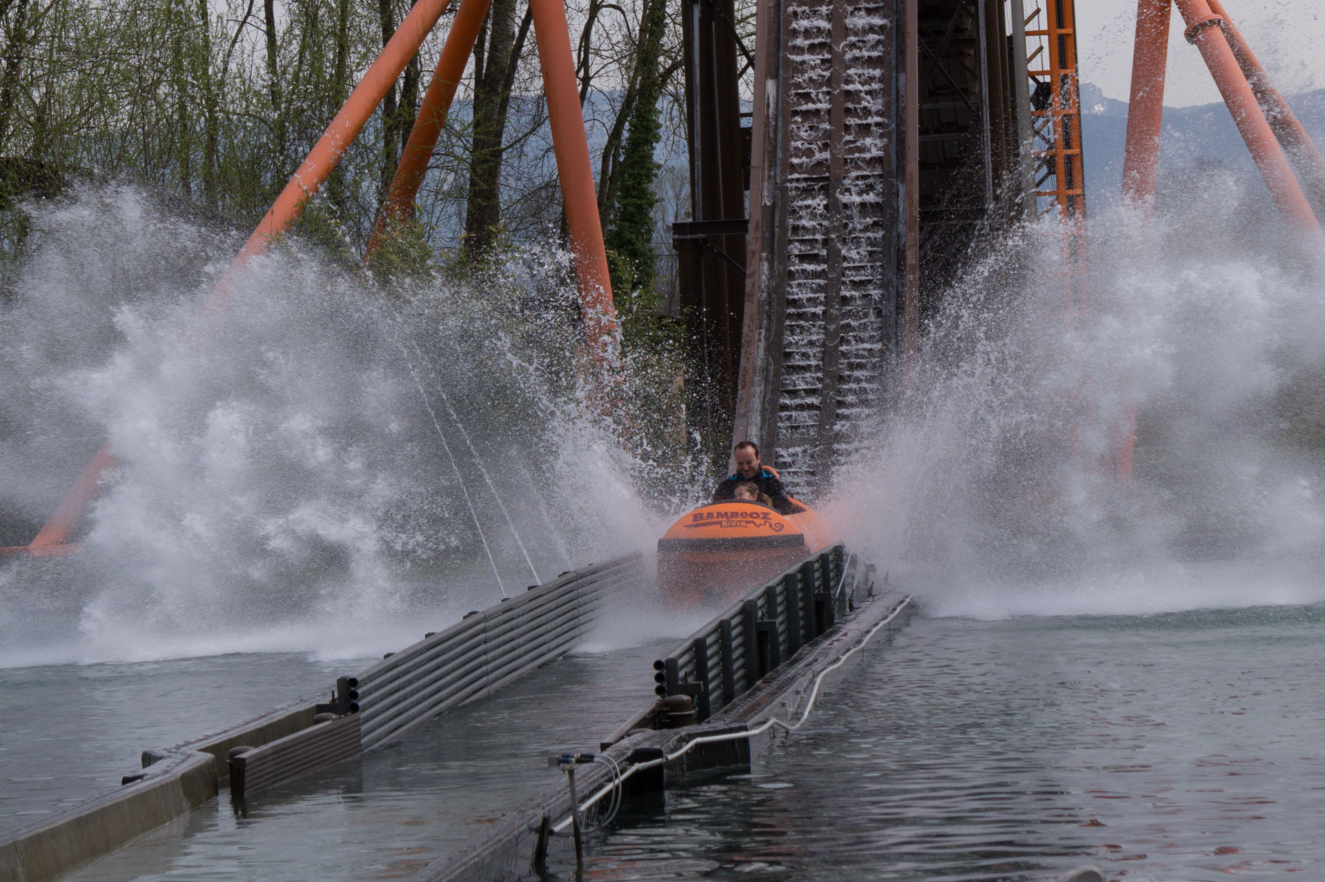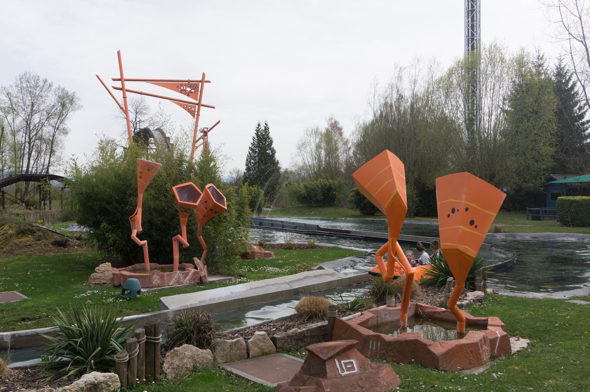 Direkt gegenüber dem Eingang zum Bad steht die moderne Wildwasserbahn Bambooz River aus dem Hause Interlink und Soquet. Im Jahr 2012 errichtet war diese Anlage die erste neue Attraktion seit dem Rebranding. Die Fahrstrecke steht dabei relativ nackt in der Gegend herum, wird aber durch größere Stahlskulpturen eindrucksvoll geschmückt. Die Fahrt weißt zwei Schussfahrten unterschiedlicher Höhe auf, wobei die kleinere zudem eine doppelte Abfahrt vorweisen kann. Beide machen nass. Tatsächlich kann einem der Bambooz River regelrecht soaken, das ist durchaus toll und erwünscht. Leider aber darf man keine der Wasserfahrten in den französischen CDA Parks allein fahren, weswegen ich es nur bei einer Fahrt beließ und was vor allem bei der nächsten Anlage auf unserem Parkrundgang seltsam anmutet.