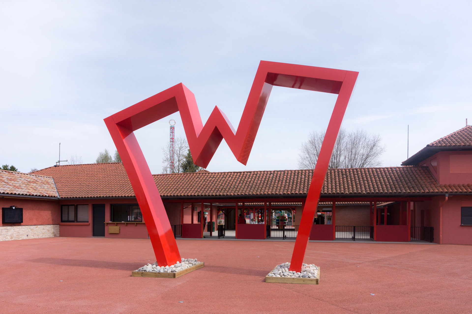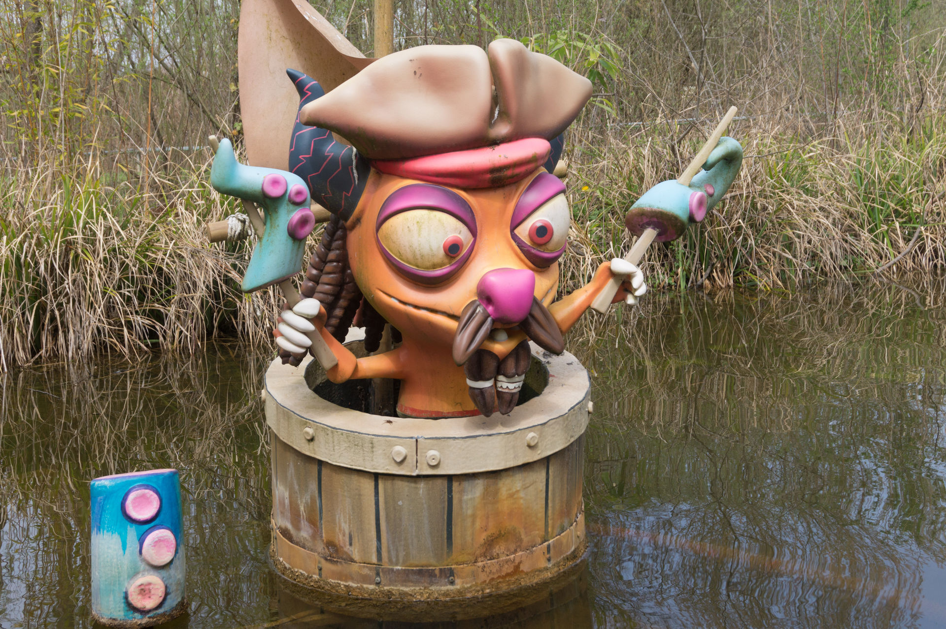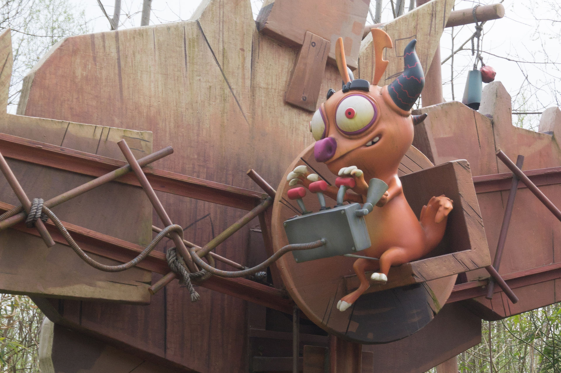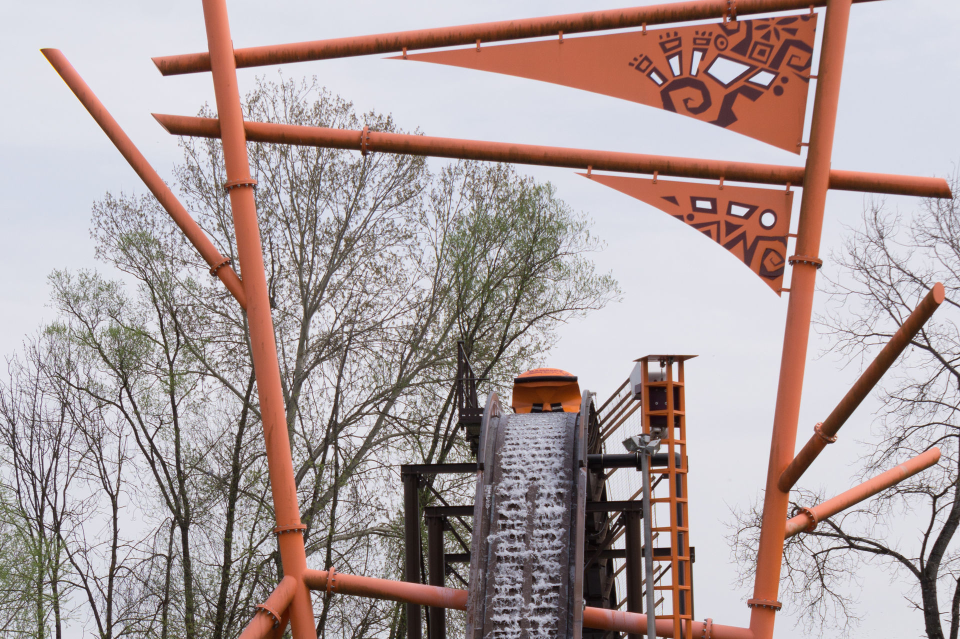 Direkt gegenüber dem Eingang zum Bad steht die moderne Wildwasserbahn Bambooz River aus dem Hause Interlink und Soquet. Im Jahr 2012 errichtet war diese Anlage die erste neue Attraktion seit dem Rebranding. Die Fahrstrecke steht dabei relativ nackt in der Gegend herum, wird aber durch größere Stahlskulpturen eindrucksvoll geschmückt. Die Fahrt weißt zwei Schussfahrten unterschiedlicher Höhe auf, wobei die kleinere zudem eine doppelte Abfahrt vorweisen kann. Beide machen nass. Tatsächlich kann einem der Bambooz River regelrecht soaken, das ist durchaus toll und erwünscht. Leider aber darf man keine der Wasserfahrten in den französischen CDA Parks allein fahren, weswegen ich es nur bei einer Fahrt beließ und was vor allem bei der nächsten Anlage auf unserem Parkrundgang seltsam anmutet.