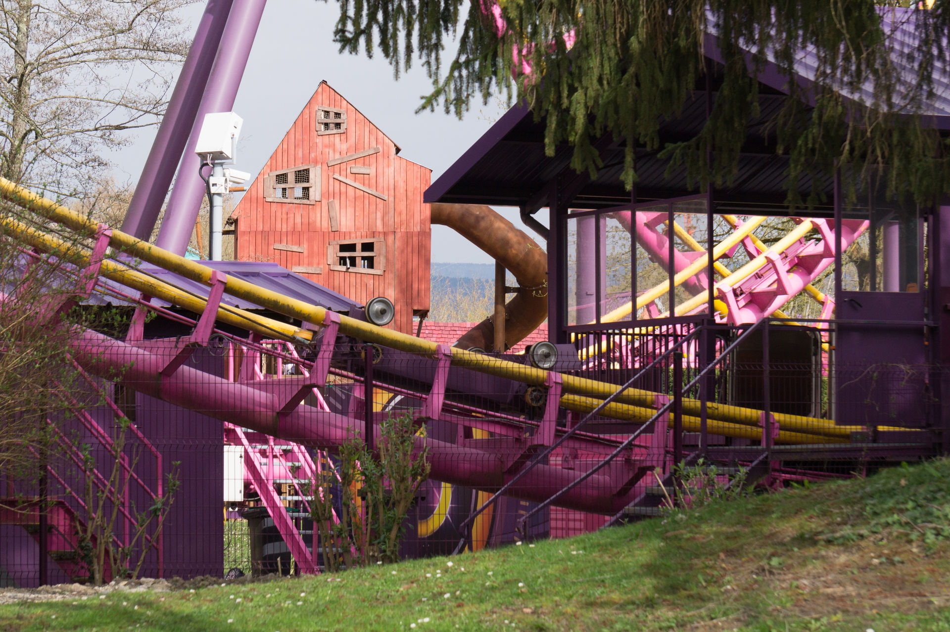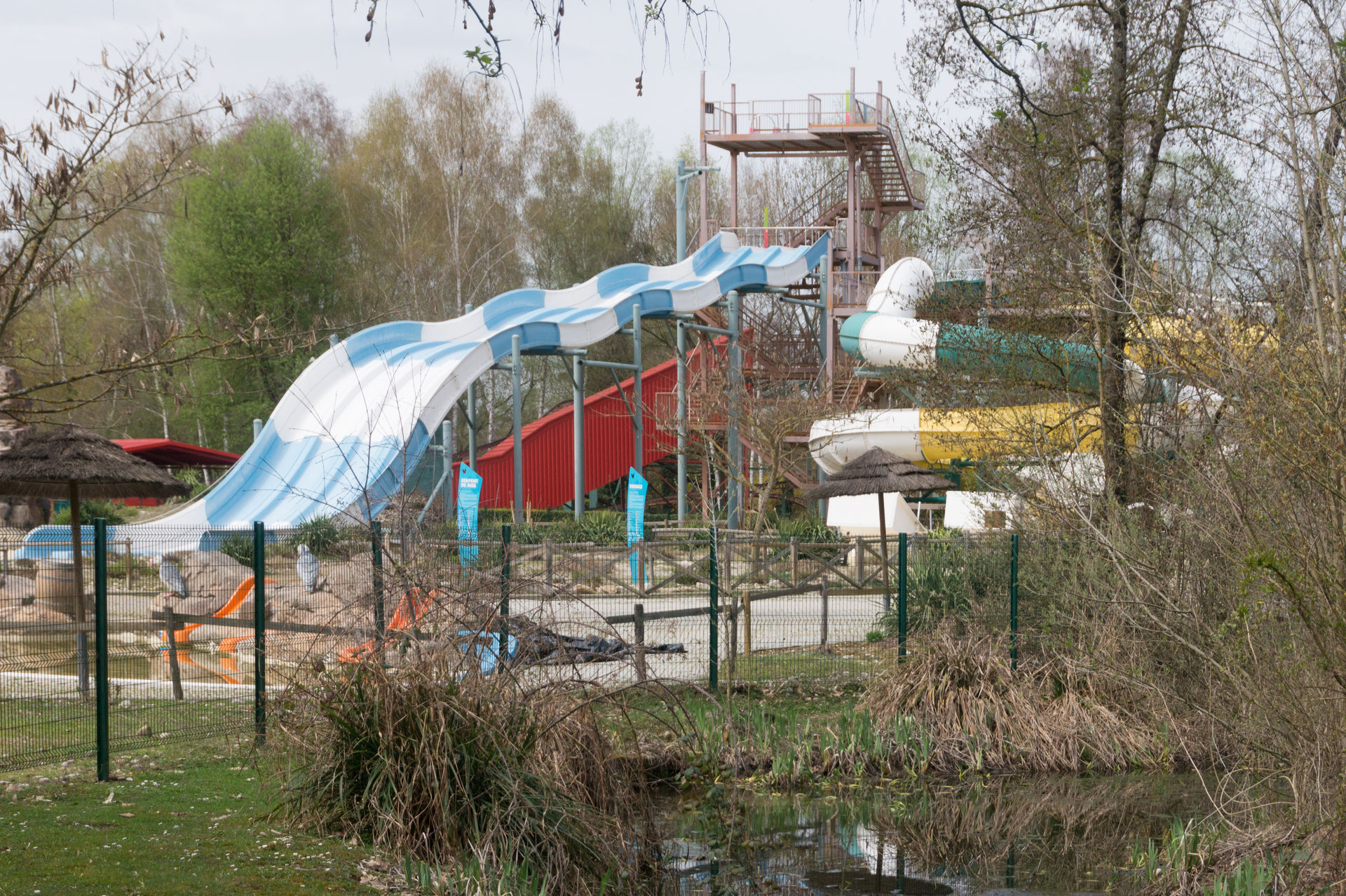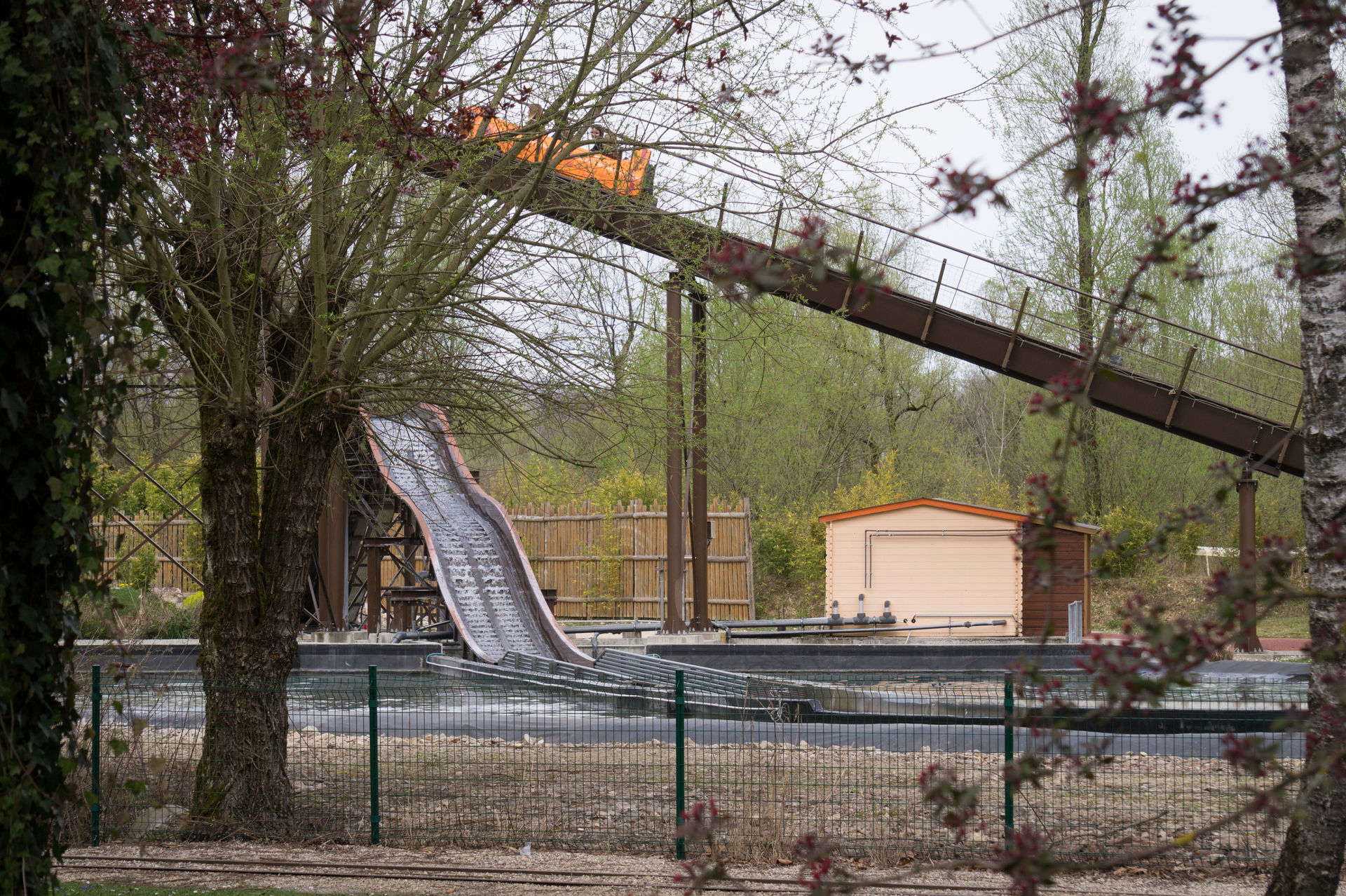 Den Wegen folgend überschreiten wir mal eben die Gleise der Parkeisenbahn und sehen uns dann den Wasserpark Aqualibi ein wenig von außen an. Dieser war entsprechend zur Jahreszeit noch nicht in Betrieb und auch die interessant wirkende Rutsche Coursaire lag auf einem Gelände neben dem Wasserpark herum. Eigentlich wollte ich immer mal nach Walibi Rhône-Alpes um den Park mitsamt Wasserpark auszutesten, nun war ich etwas zu früh dran. Das macht jedoch nichts, denn der Wasserpark wird ggbfs. demnächst ein weiteres Mal massiv erweitert, um dann als eigenständiger Wasserpark wie auch in Wavre die Gäste unterhalten. Die besagte Röhrenrutsche mit dem sich stetig verengenden Kurvendurchmesser interessiert mich wirklich sehr.
