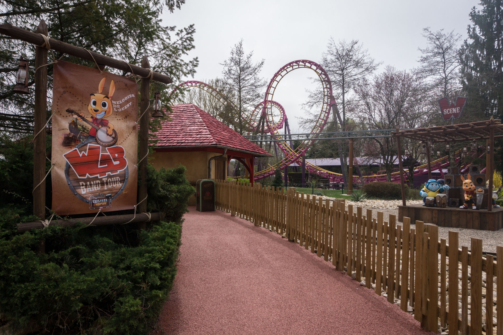 Vorbei am Zamperla Barnyard Volt-O-Vent zieht es uns nun in Richtung der Wilden Maus Woodstock Express. Dieses italienisches Mausachterbahnkonstrukt aus dem Hause Zamperla bietet dabei ein ähnliches Fahrvergnügen wie die Anlagen von L&T Systems, jedoch mit einem kleinen, aber überaus feinen Unterschied gleich zu Beginn der Fahrt. Während die anderen Mäuse nämlich ihre Fahrgäste in einer Rechtskurve in den Lifthügel der Anlage geleiten schießt die Zamperla Maus in einem kurzen Gefälle aus der Station heraus, ehe es im Lift dann einmal ordentlich Rumms macht. Da ich besagtes Verhalten bereits aus Walibi Sud-Ouest kannte war ich dementsprechend vorbeireitet und stützte mich bis zum besagten Moment von der Rückenstütze ab. Hierauf folgte dann eine absolut butterweiche Fahrt, für die ich mich immer wieder gerne angestellt habe.