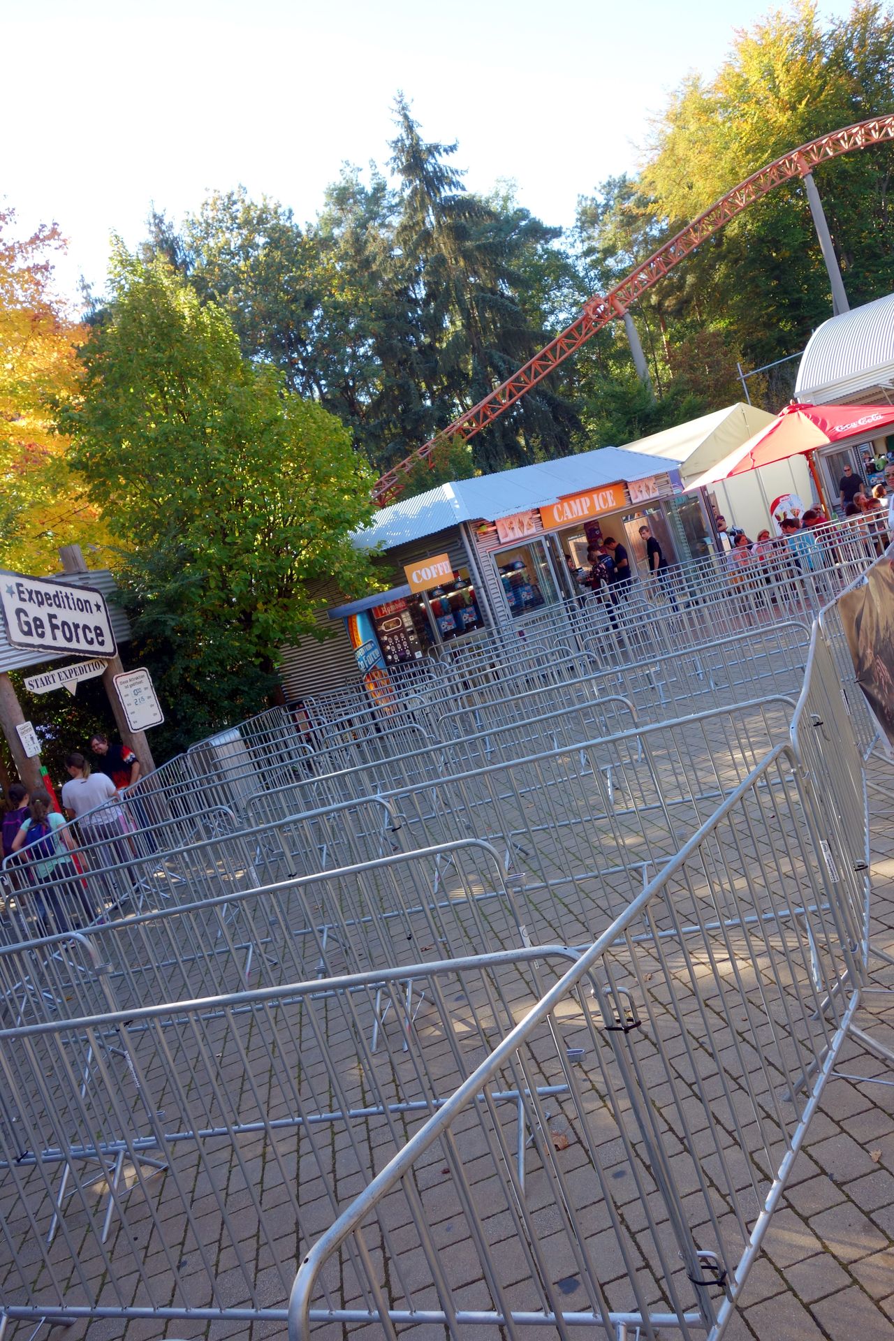 Nachdem die Halle also ausgiebig begutachtet wurde, begab ich mich nochmal zum Free Fall Tower. Dort war der Wartebereich aber doch ein klein wenig voller geworden und so richtig voran ging es auch nicht mehr. Ich vermutete daher, dass Nicolas gerade in der Pause war und ging erstmal weiter zu Expedition GeForce, wo ich mich auf das Schlimmste einstellte. Der erste Schock: Vor dem eigentlichen Wartebereich war noch ein recht großer Zick-Zack-Bereich aus Zäunen aufgebaut.