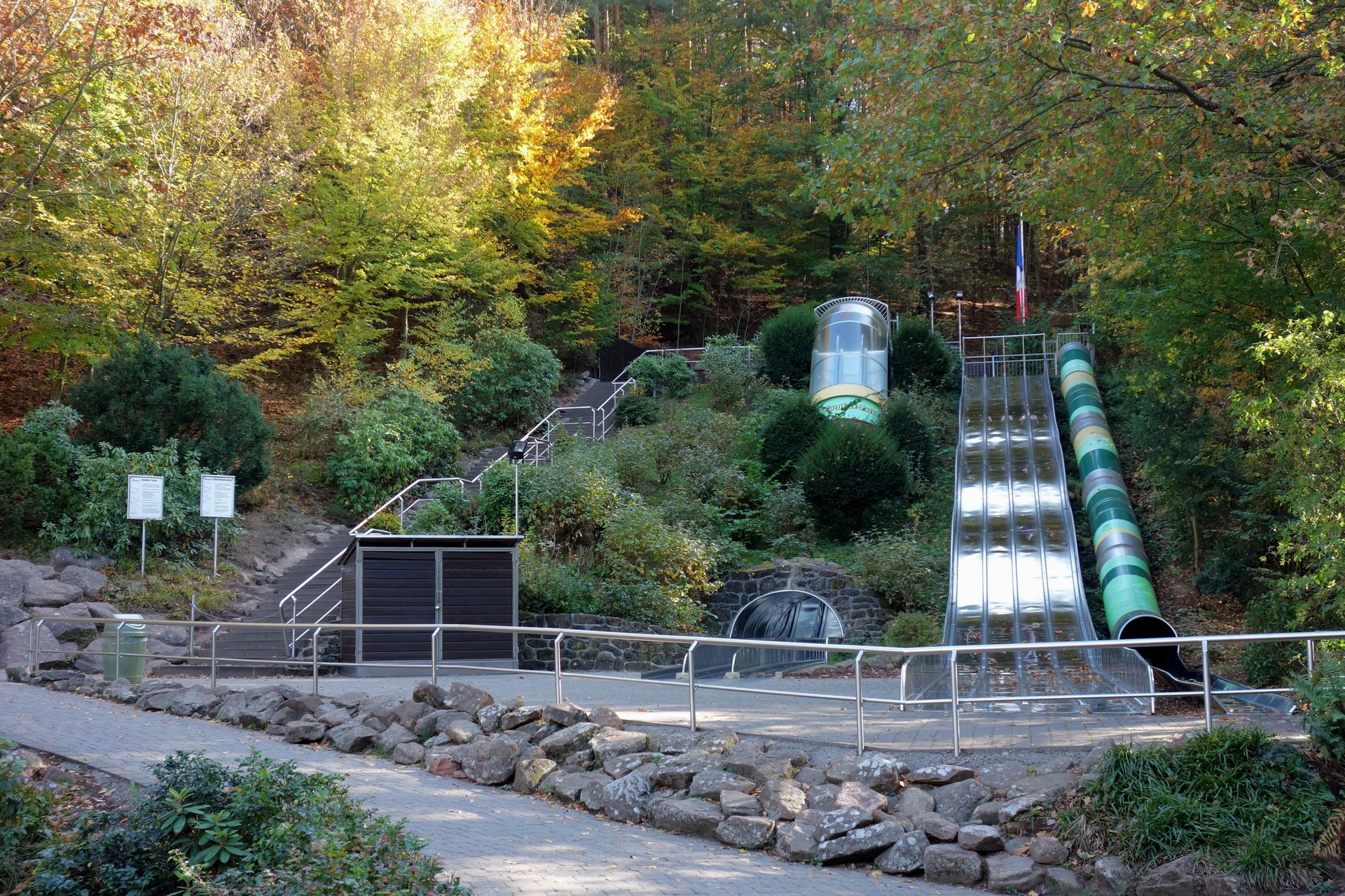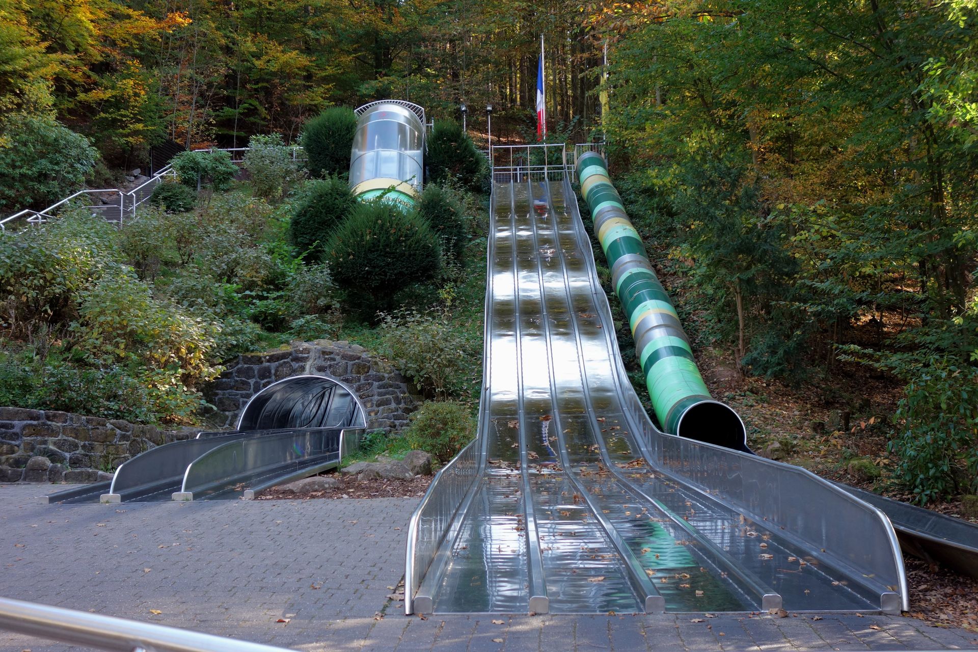 Die Freifallrutsche ist identisch mit der im Eifelpark, die Wellenrutsche hier aus Metall statt Plastik und die Röhrenrutsche auch nur gerade.