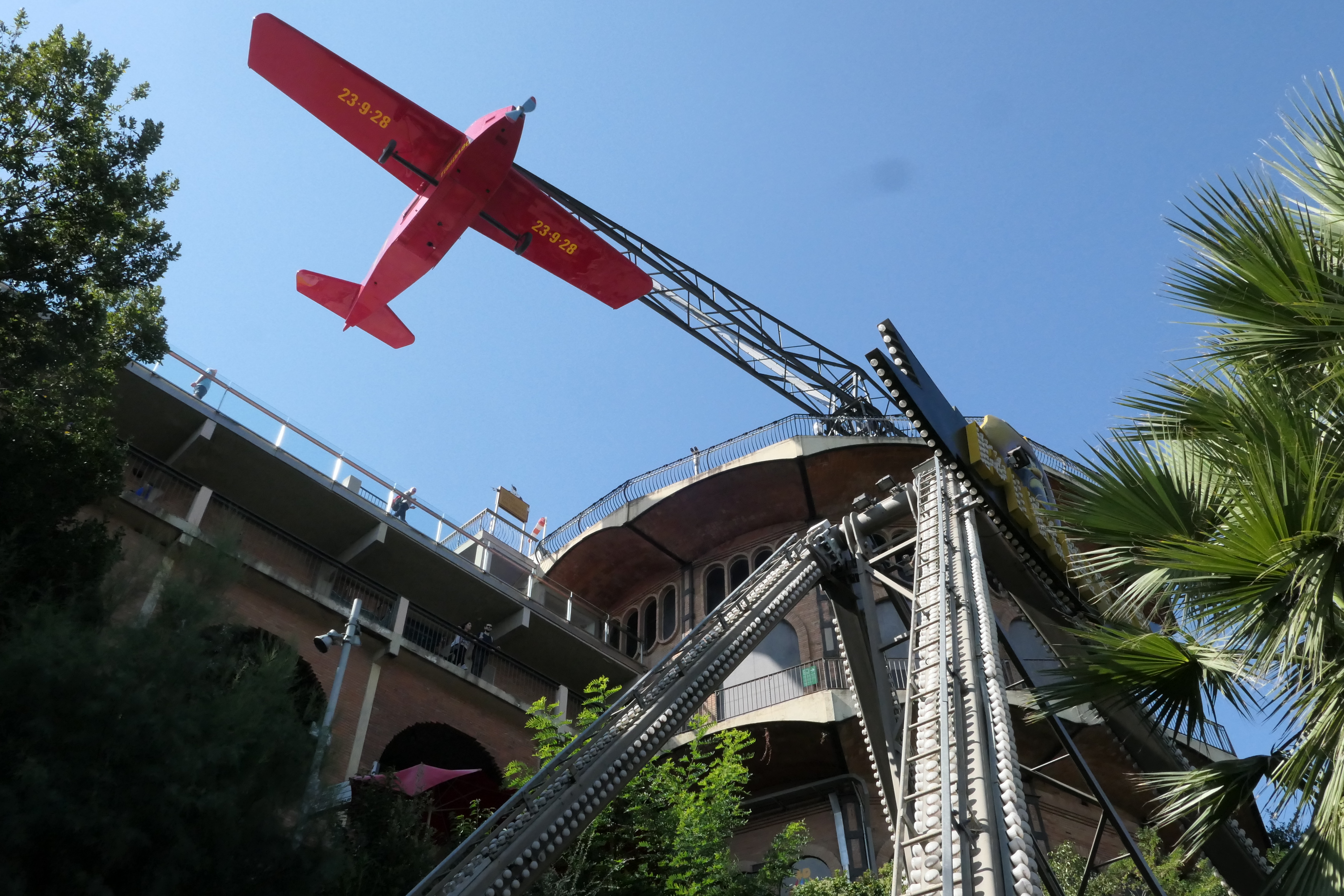 In Barcelona in den Reisebus gestiegen ging es erstmal bergauf zum ersten Park der kleinen Tour: Tibidabo auf dem Dach Barcelonas. Der Park liegt wunderschön auf dem höchsten Berg der Stadt, und bietet dementsprechend ein Panorama auf die Stadt vom allerfeinsten. Der obere Bereich des kleinen Parks ist dabei öffentlich zugänglich und auch für nicht-Freizeitparkfans sehr zu empfehlen. Hier gibt es die sehr skurrile Flugzeugfahrt, die