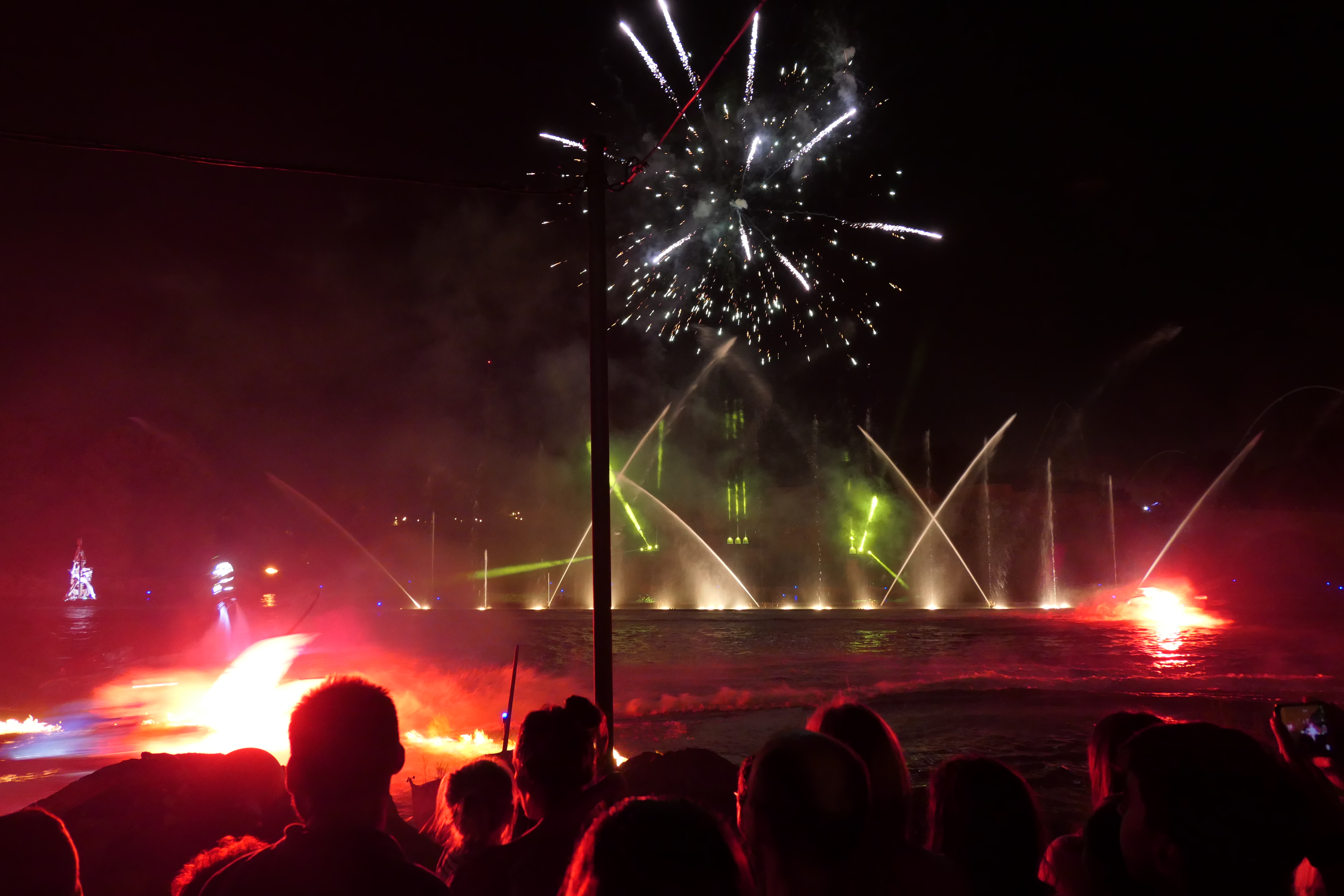 Wasser, Feuer, Licht, Projektionen auf Wasserflächen, Szenenboote und Jetpack-Tänzer: Gute Show!