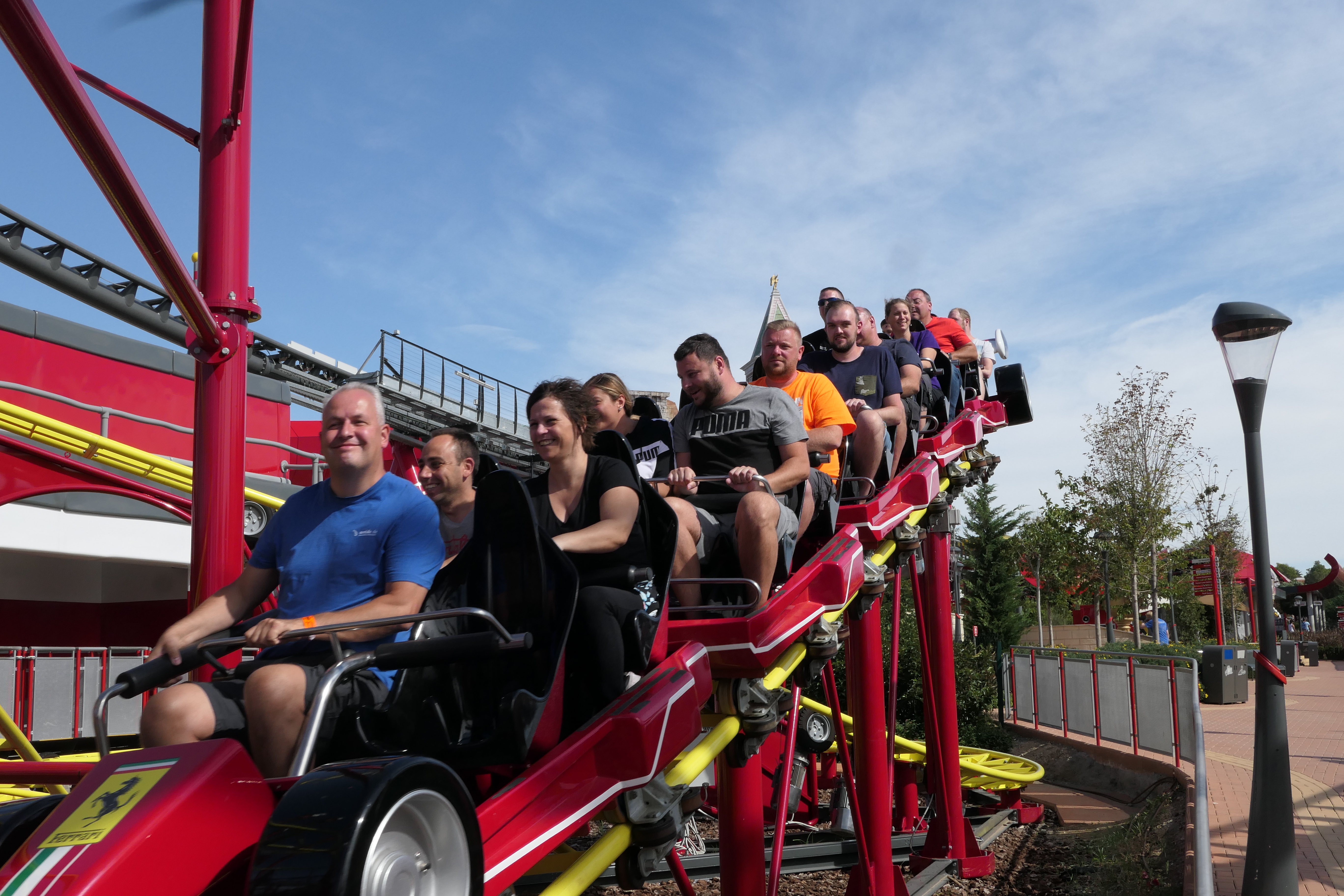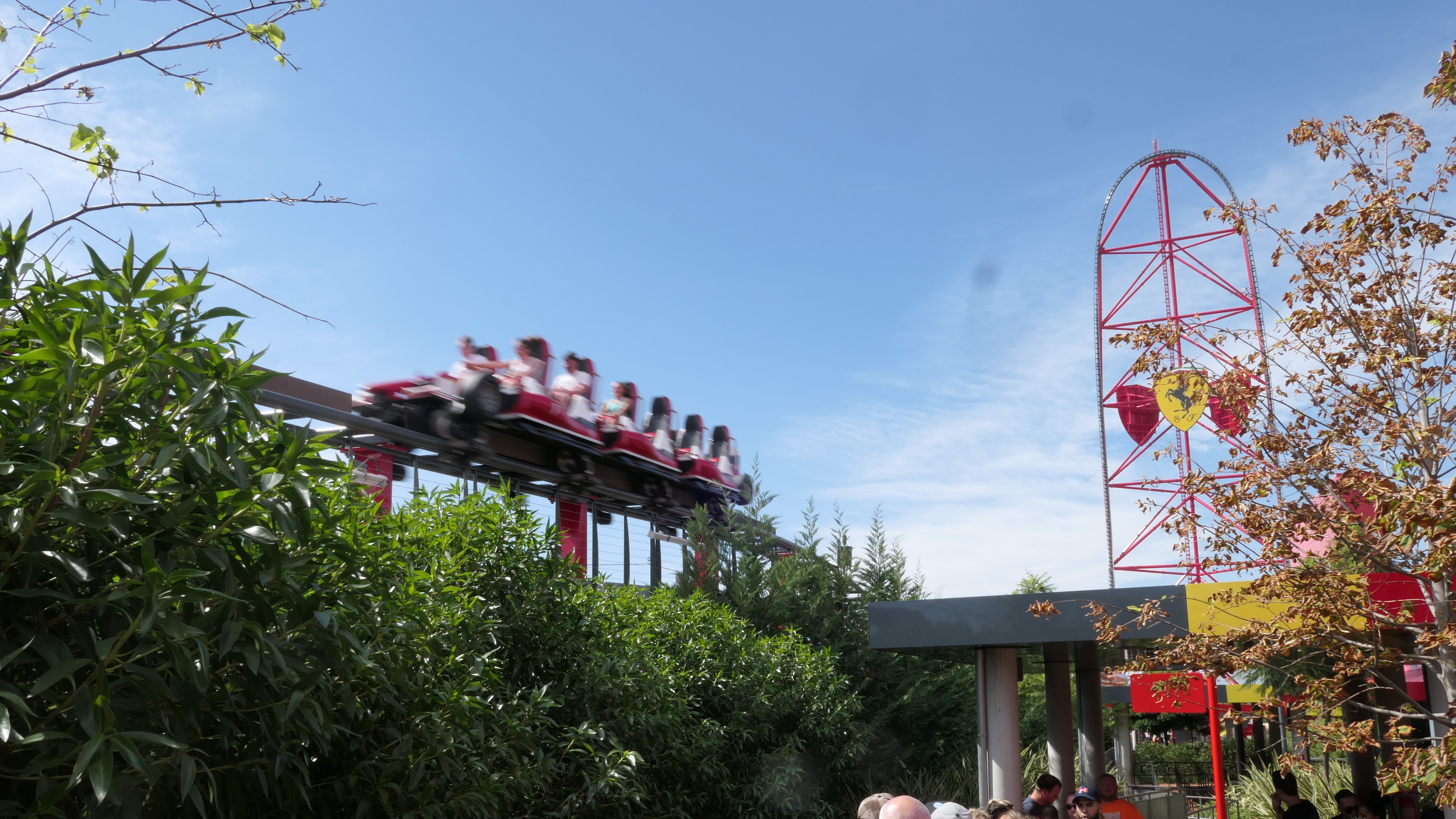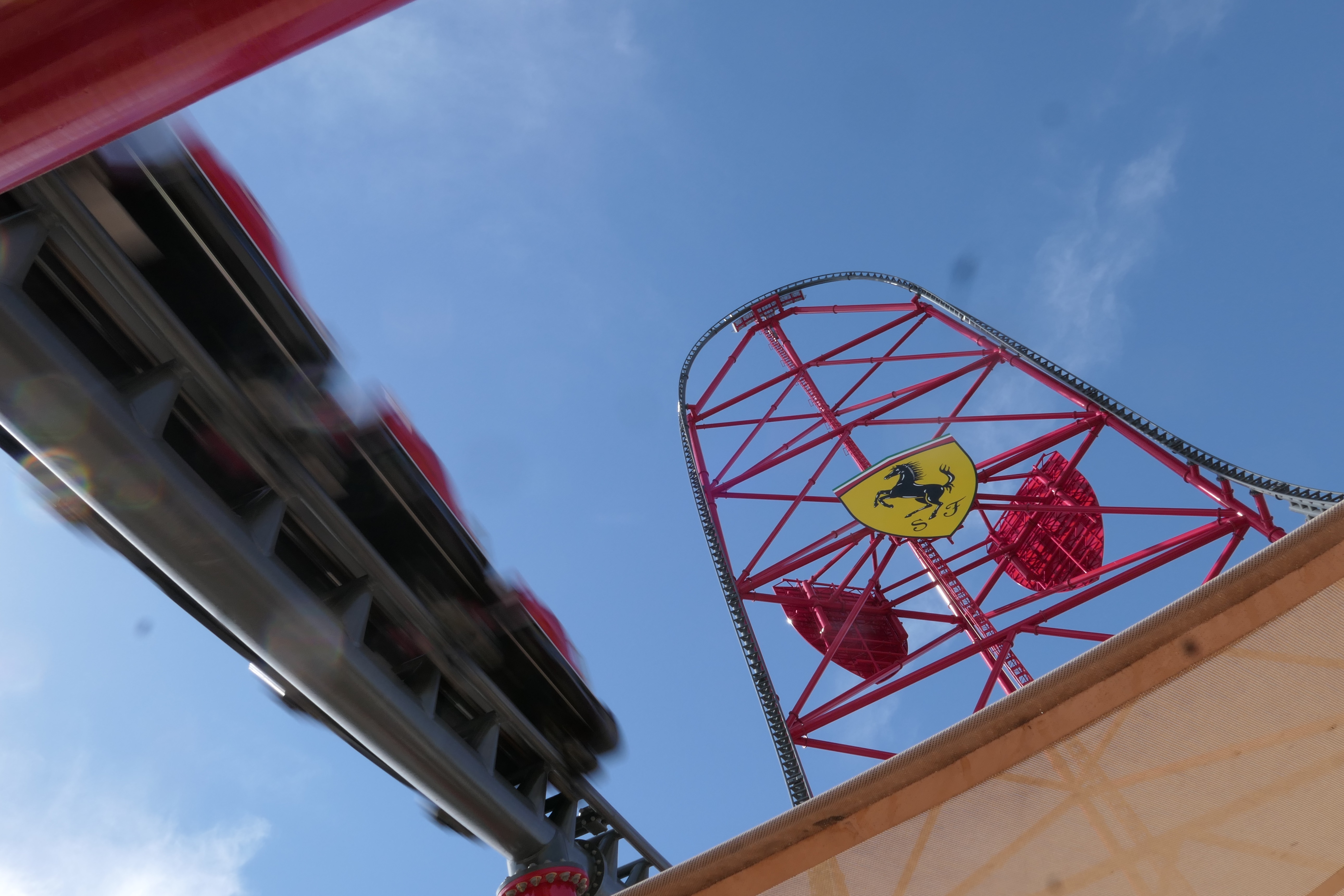 Am letzten (richtigen) Tag ging es noch gegen Mittag ins Ferrari Land um Formula Rossa zu fahren. Äh, Red Force… Leider haben wir einen schlechten Zeitpunkt erwischt, denn die Wartezeit betrug letztendlich 80 Minuten für die 20 sekündige Fahrt, und damit deutlich mehr als bspw. wenig später. Außerdem wurde der Zug aufgrund des starken Windes jeweils nur mit 6 anstatt 12 Fahrgästen beladen. Aber widmen wir uns der Bahn: