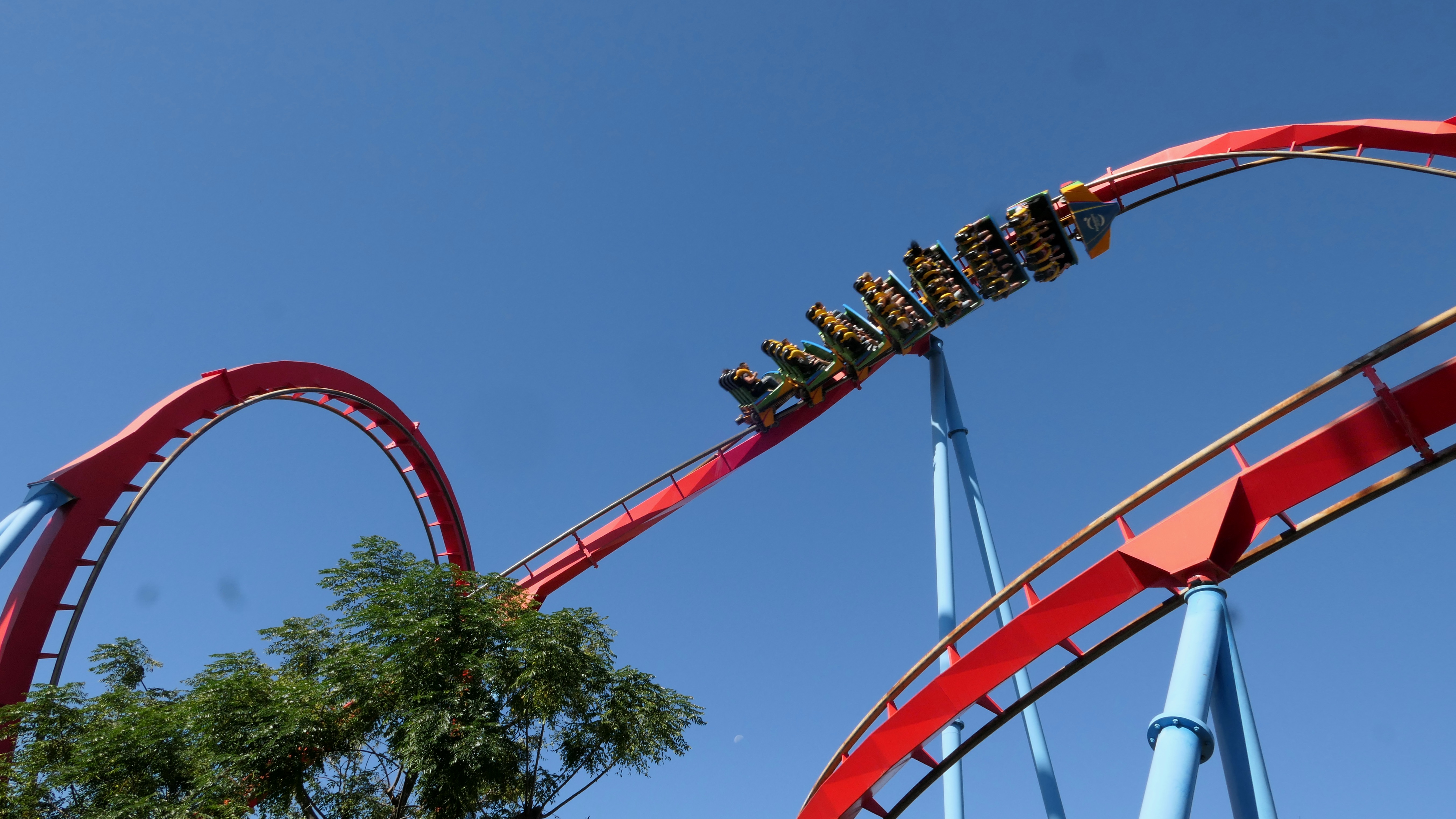Was war ich froh als wir wieder in PortAventura waren und mich nicht weiter das latente Gefühl verfolgte meine wertvolle Zeit unter der spanischen Sonne in einem uninspirierten Park von der Stange zu verschwenden! Ausstehend war nämlich noch das Finale auf Shambhala (ohne Absprache hat das offenbar ganz onride so gesehen) und zuvor die erste-Reihe Fahrten auf Furius Baco und Dragon Khan. Auf diesen drei Bahnen genossen wir Dank der Drängel-Pässe nicht nur Express-Zugang sondern einmalig auch Fahrten ganz vorne.