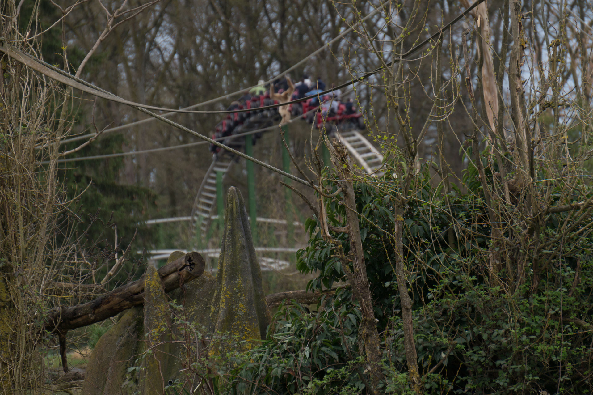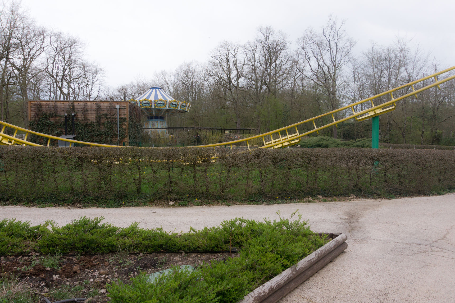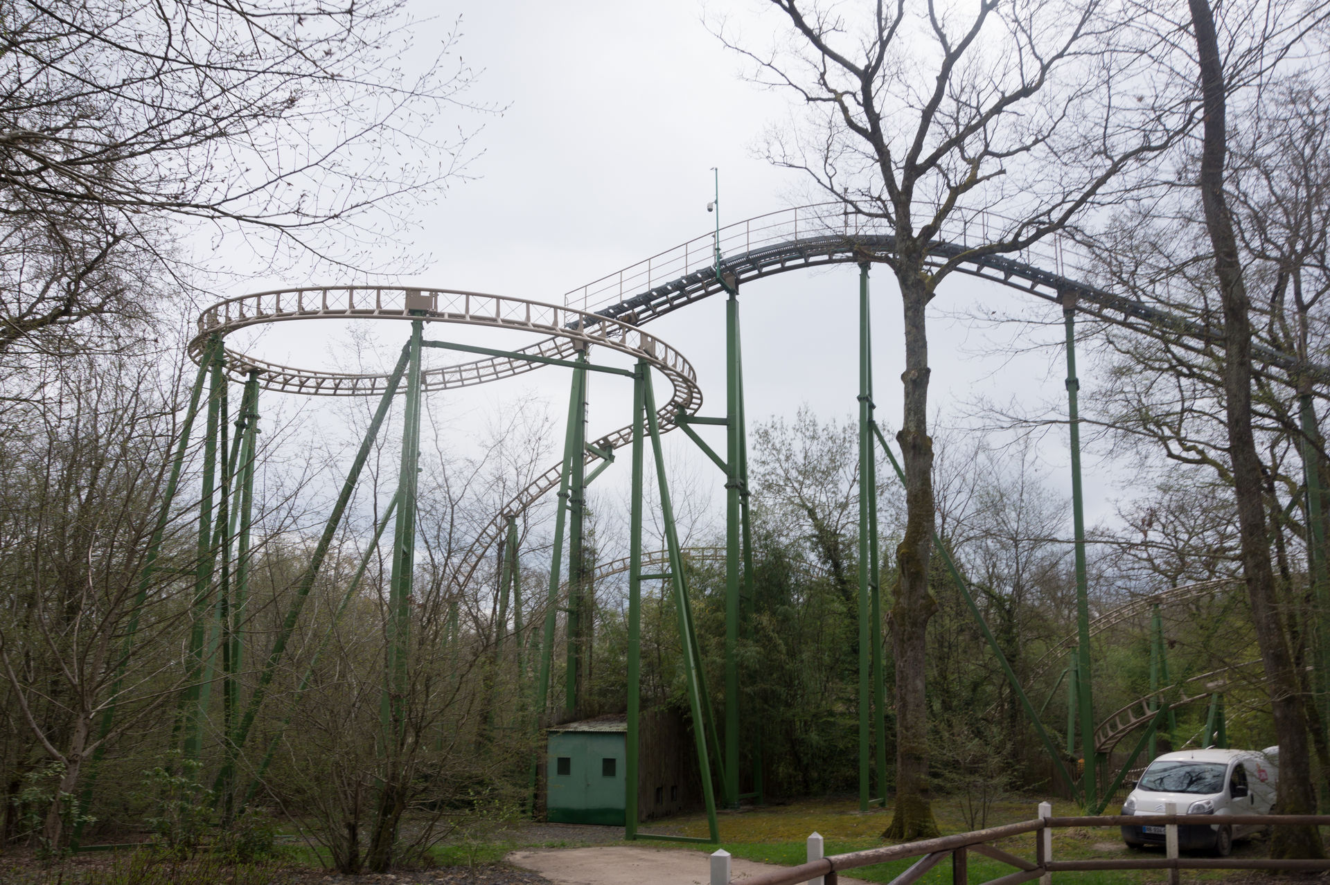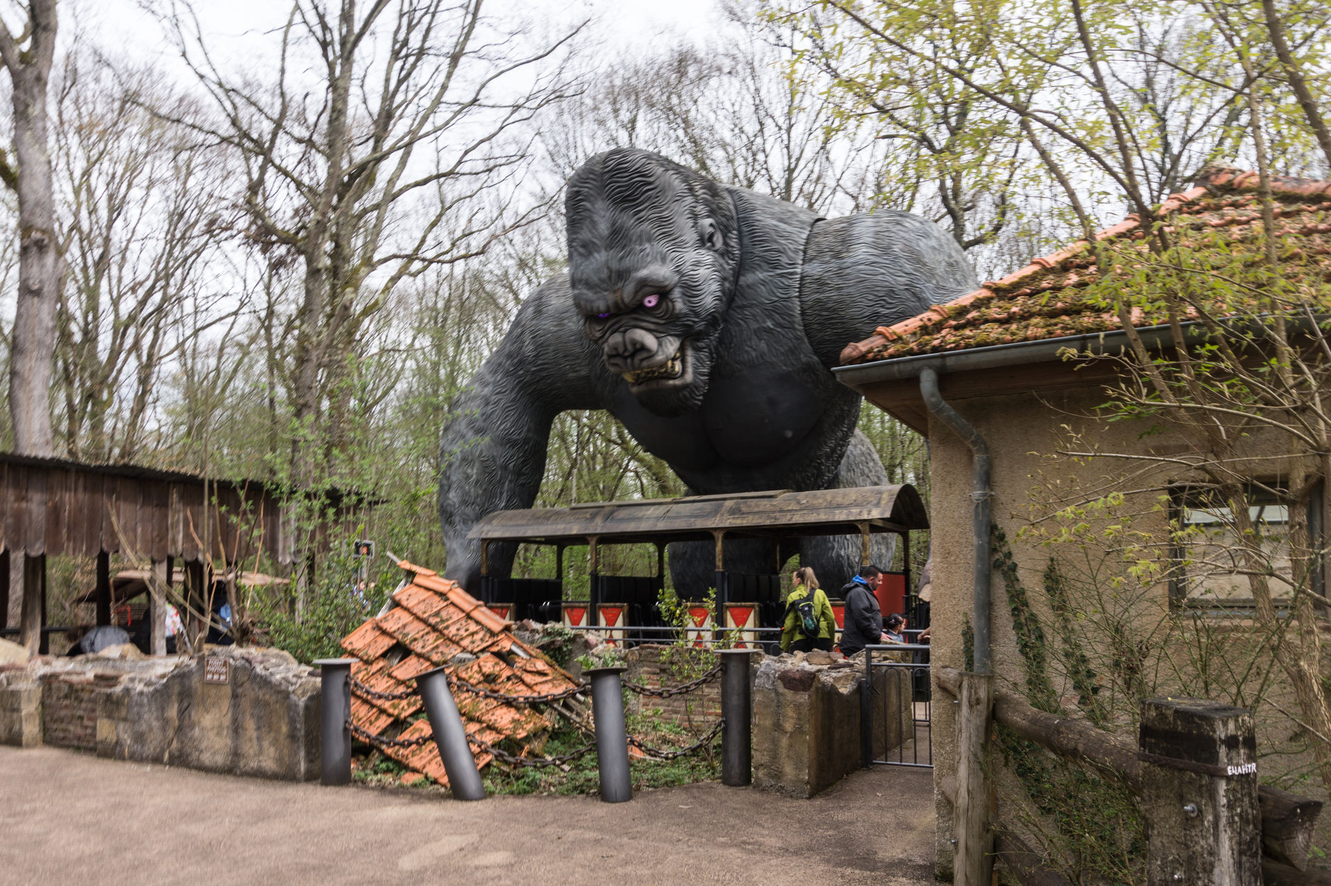 Bei der nächsten Anlage hingegen kann man sich über eine solche Aussage streiten. Ich mache es mir diesmal relativ einfach und konzentriere mich auf die historische Bedeutung eines King Kong Fahrgeschäfts in Le Pal, wonach der Park eben jene Neuauflage des Herstellers HUSS brauchte, da ja viele Kunden sich an die typisch französische Aussichtsfahrt (ein aktives Exemplar befindet sich auch heutzutage noch im Freizeitpark Cigoland) aus ihrer Kindheit erinnerten und es schade fanden, eben jene Anlage nicht mehr im Park anzutreffen. Auch ist die Gestaltung der Warteschlange mit den verkrümmten Eisenbahnwagons im Wald überaus gelungen. Die Anlage wirkt hier – im Gegensatz zum belgischen Freizeitpark Bobbejaanland – stimmig inszeniert und passend. Doch ob diese Punkte über das belanglose Herumgewackel in luftiger Höhe hinwegsehen lassen, ich weiß es nicht.