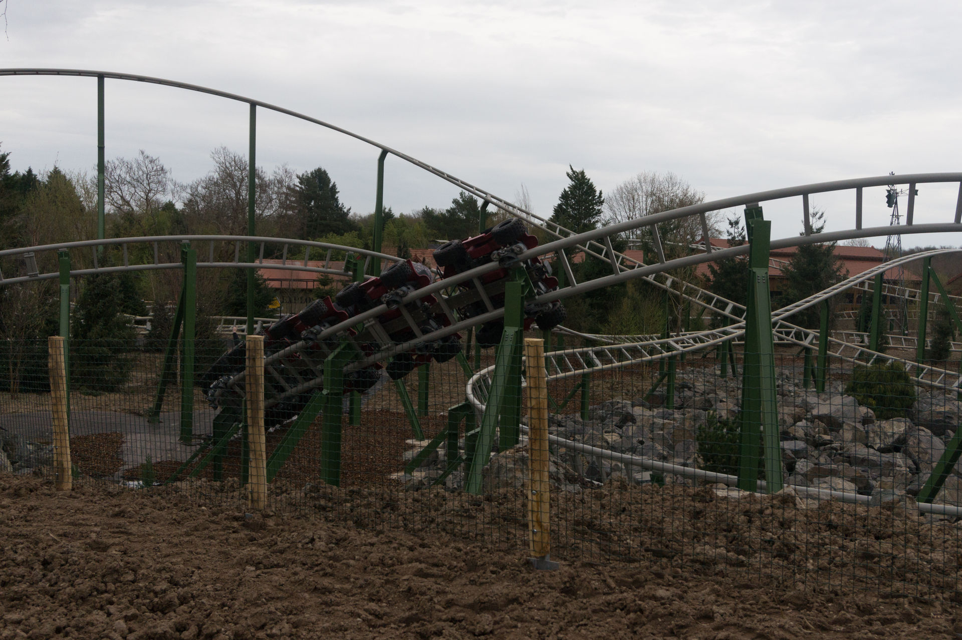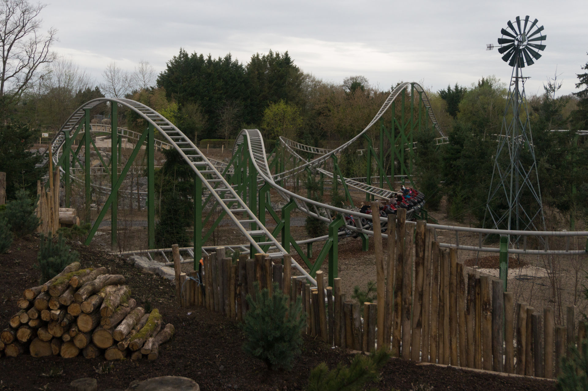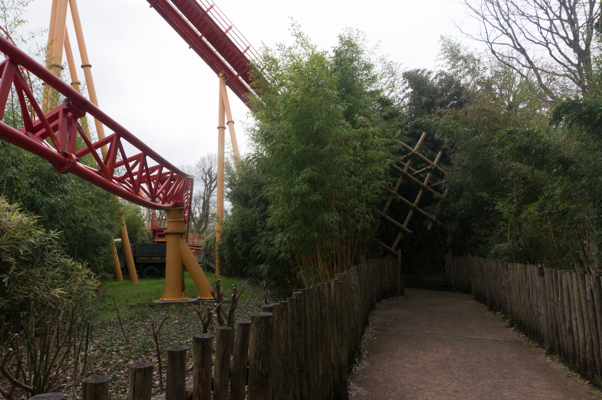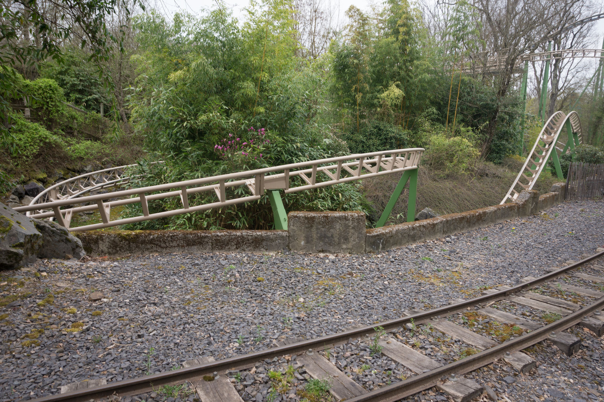 Bei der nächsten Anlage hingegen kann man sich über eine solche Aussage streiten. Ich mache es mir diesmal relativ einfach und konzentriere mich auf die historische Bedeutung eines King Kong Fahrgeschäfts in Le Pal, wonach der Park eben jene Neuauflage des Herstellers HUSS brauchte, da ja viele Kunden sich an die typisch französische Aussichtsfahrt (ein aktives Exemplar befindet sich auch heutzutage noch im Freizeitpark Cigoland) aus ihrer Kindheit erinnerten und es schade fanden, eben jene Anlage nicht mehr im Park anzutreffen. Auch ist die Gestaltung der Warteschlange mit den verkrümmten Eisenbahnwagons im Wald überaus gelungen. Die Anlage wirkt hier – im Gegensatz zum belgischen Freizeitpark Bobbejaanland – stimmig inszeniert und passend. Doch ob diese Punkte über das belanglose Herumgewackel in luftiger Höhe hinwegsehen lassen, ich weiß es nicht.
