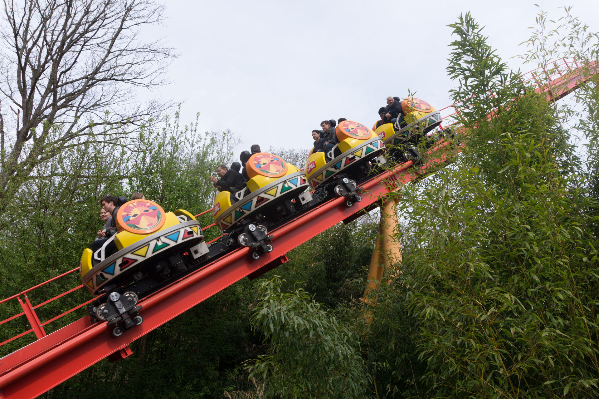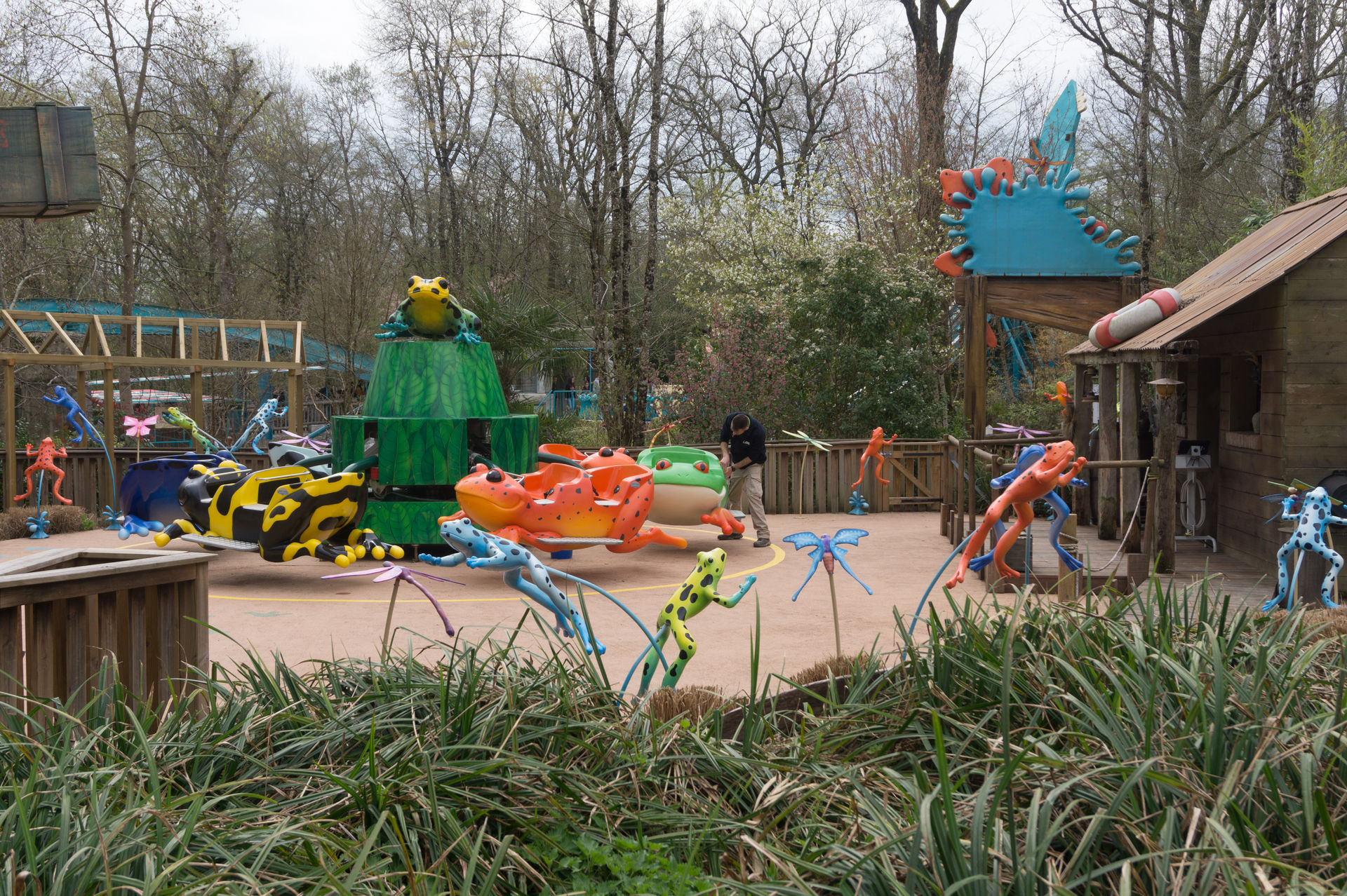 Während andere noch darüber nachdenken dürfen, widmen wir uns ganz schnell mal zwei Dauerbrennern aus Italien. Mit der Ronde des Grenouilles erwartet uns ein Jump Around für die kleineren Parkgäste und mit der Disque du Soleil ein Disk’o Coaster im schnittigen Aztekenlook. Beide Anlagen machen Spaß, aber was anderes erwartet man von Zamperla ja auch nicht. Interessant an der Disque du Soleil ist die Evakuierungsplattform im zweiten Tal; da sind die Franzosen wohl etwas vorsichtiger unterwegs.