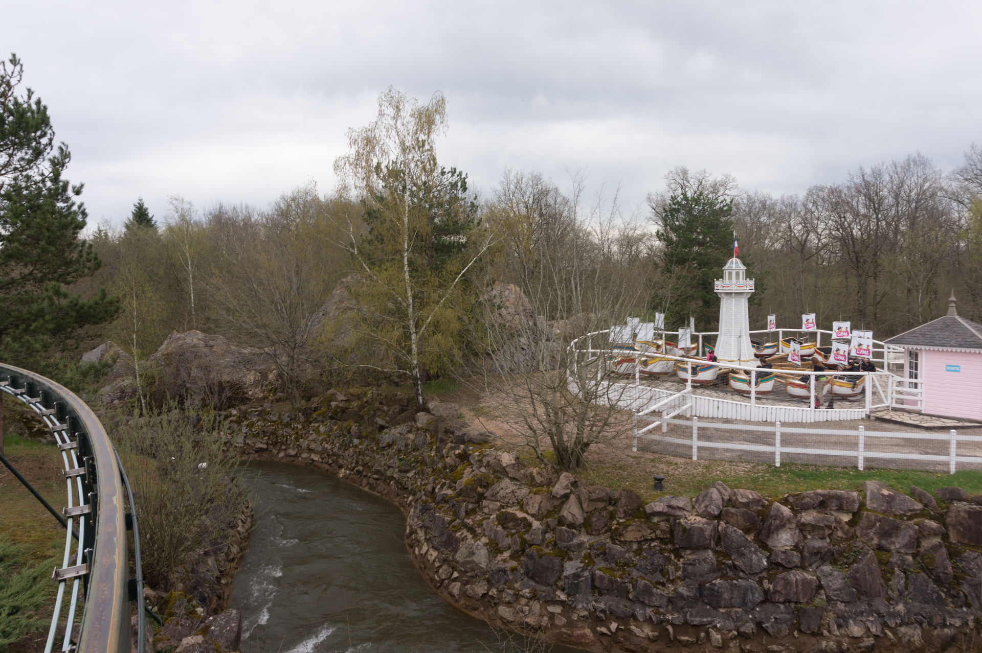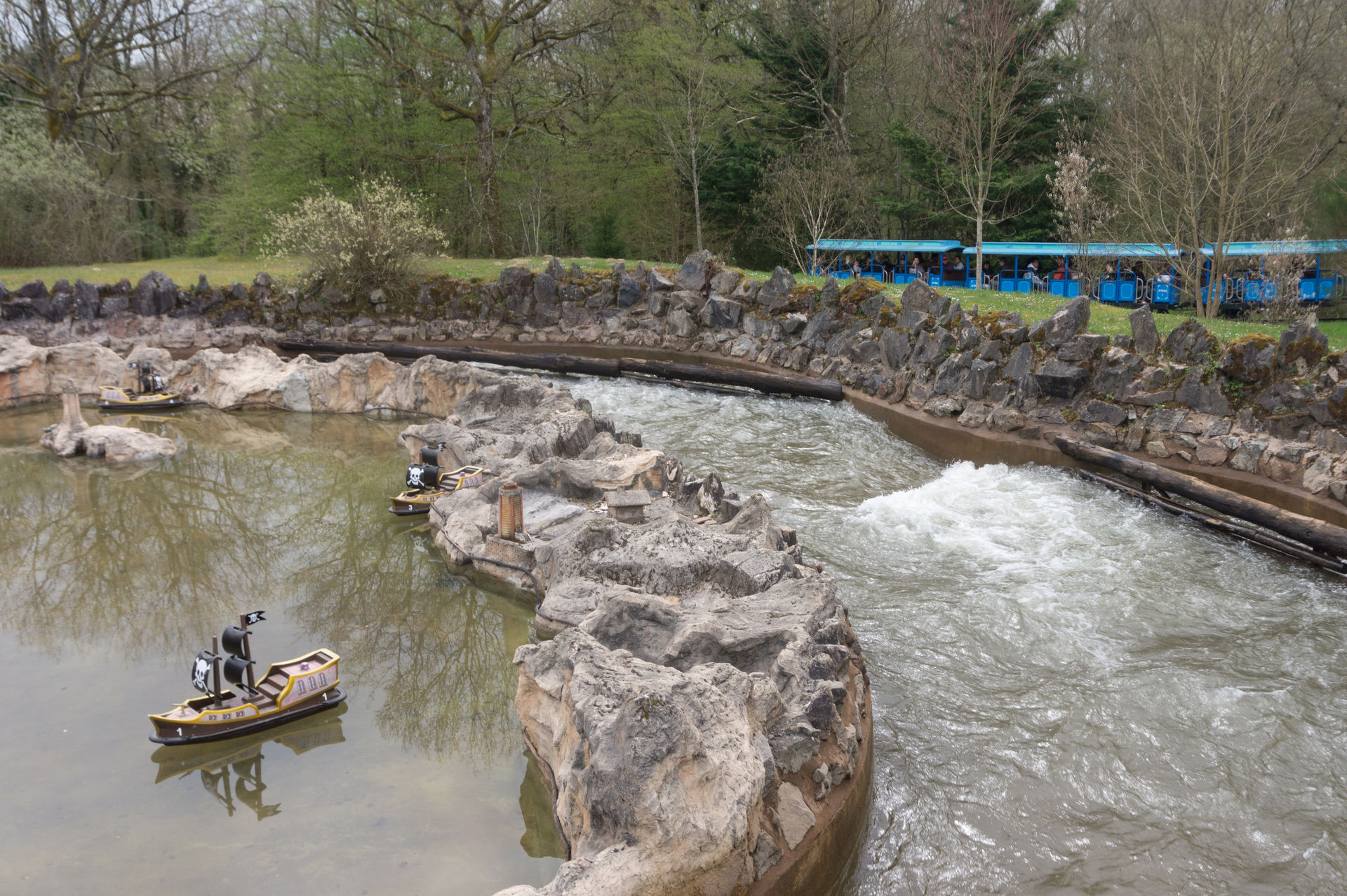 Wenn man jetzt nicht aufpasst landet man beim Forêt Enchantée in einer Sackgasse. Da uns die Kleinkinderthemenfahrt weniger interessiert als die Anlage, deren Fahrgastträger bereits öfters an uns vorbeigefahren sind, suchen wir uns schnell einen anderen Weg. Auf einer Insel treffen wir dann auf die Koggenfahrt Les Caravelles, welche sowohl vor- als auch rückwärts eine echt gute Figur macht.