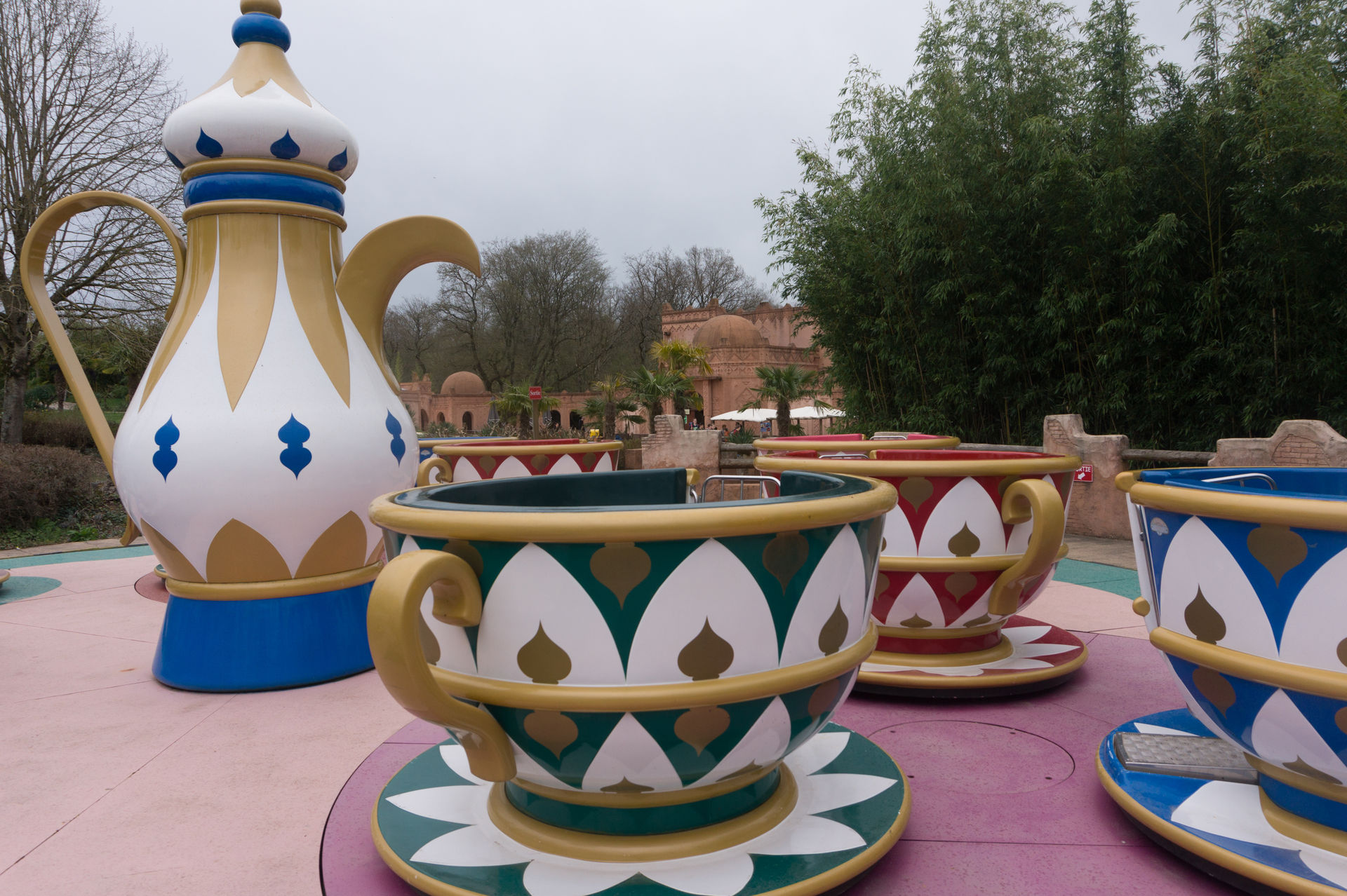 Vorbei an der Station des Train Aventiers, einer Parkeisenbahn mit Spezialeffekten, geht es weiter in einen orientalisch anmutenden Bereich. Hier findet man zahlreiche Fahrgeschäfte aus dem Hause Zamperla, darunter eine Teetassenfahrt und ein Kinderfreifallturm, eine Schiffschaukel von Fabbri, sowie dem 4D Simulator Ciné Dinamique 3D. Letzter interessierte mich sehr, denn er zeigt den 4D Film der