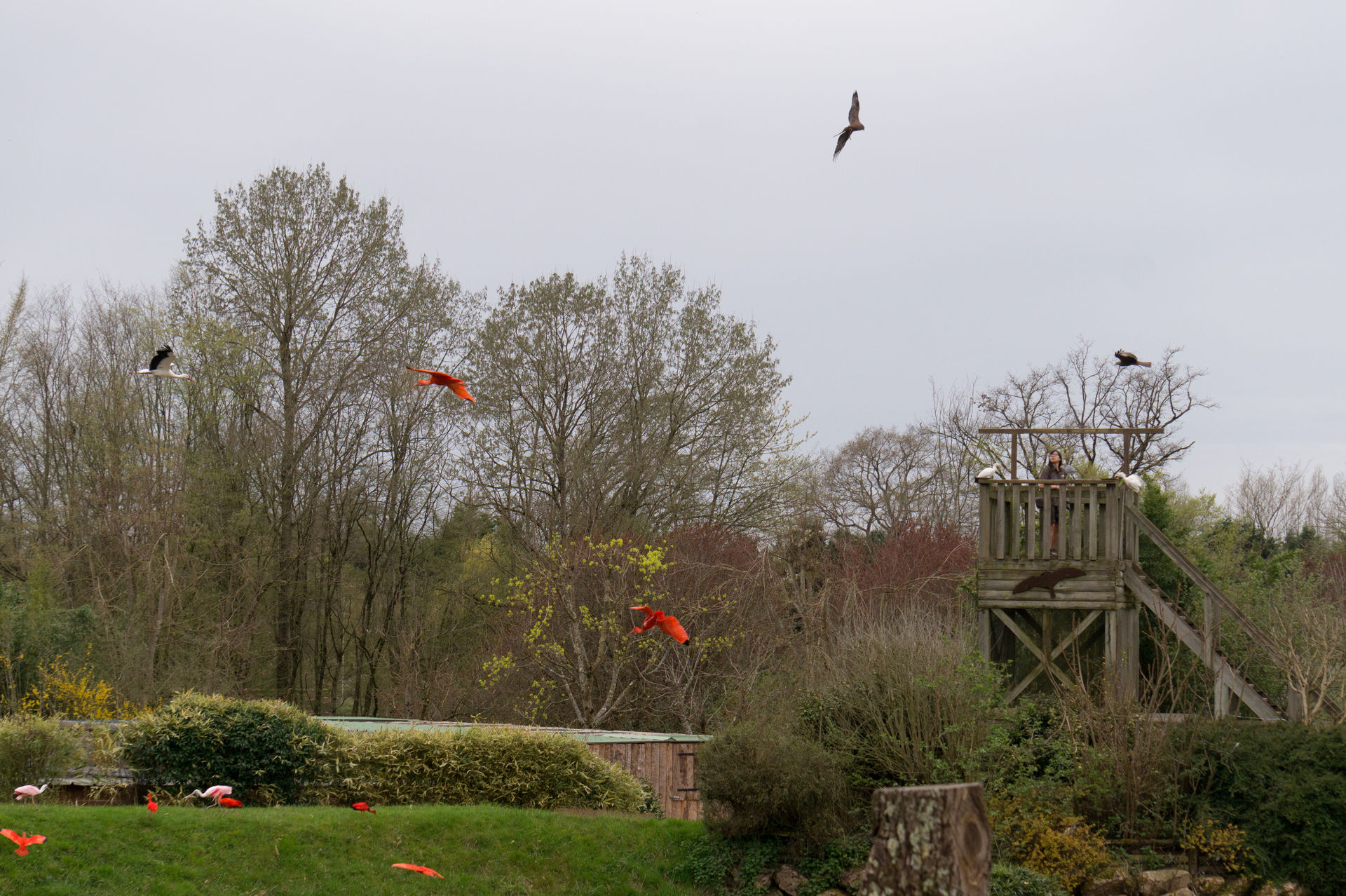 Zeit also für eine Show. Entlang der Gehege der Roten Pandas, Gibbons und Dscheladas führt uns der Weg zur großen Greifvogelschau. Diese schauen wir uns vom Eingangsweg aus an, denn in Le Pal werden die Wege pünktlich zu Showbeginn versperrt. Ein spätes erscheinen lohnt sich also nicht. Was sich hingegen sehr lohnt ist die Show an sich. Nach und nach werden zahlreiche Greifvögel vorgestellt, ehe der Park zum fulminanten Finale übergeht und sämtliche vorhandenen Großvögel auf die Showbesucher entlässt. Auf einmal befinden sich Störche, Ibisse und Kuhreiher mitten in den Besucherrängen. Diese Show sollte man nicht verpassen!