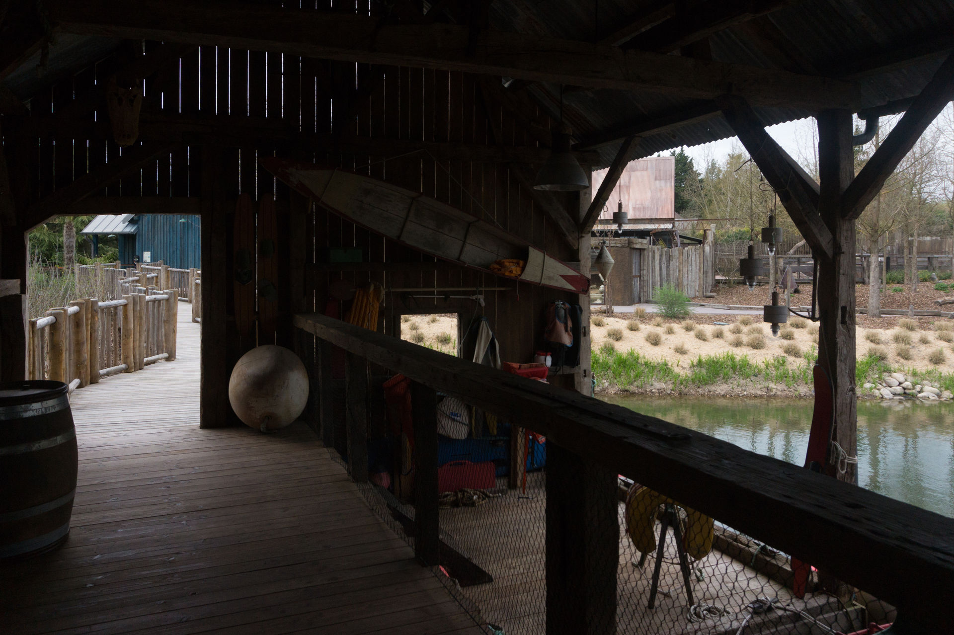 Was mich persönlich sehr fasziniert hat ist die Station der Anlage, da hier auch die ungenutzten Boote gelagert werden. Hierfür steht ein Kran zur Verfügung, der über eine Zahnstange in Position gefahren werden kann. Verblüffend dabei ist die Anpassung der Stegüberdachung, damit der Kran ohne große Umbauten genutzt werden kann. Ein weiterer Funfact ist die Tatsache, dass die Anlage früher mal Boote mit Einzelsitzen genutzt hatte und sie später gegen die bewährten 8er Boote des Herstellers getauscht hat.