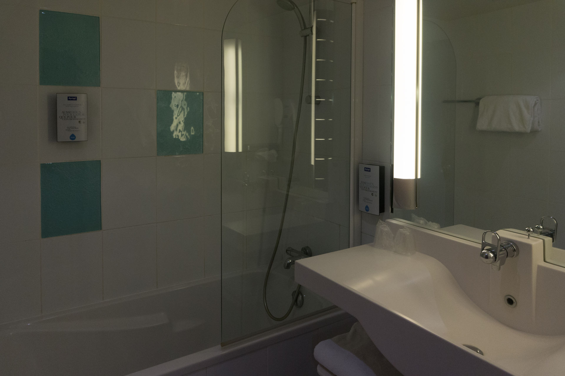 Auch am zweiten Abend der Achterbahnreise zog es mich in ein Kyriad Hotel. Dieses Mal jedoch bei Le Creusot. Nachdem ich Ewigkeiten an der Rezeption warten durfte – da es wohl niemand für nötig hielt eine stetig besetzte Rezeption auch mal zu besetzen – konnte ich endlich auf mein Zimmer. Im Vergleich zum Vorabend war das Zimmer riesig und glich denen eines typischen 4* Hotels. Auch das Bad konnte sich sehen lassen.