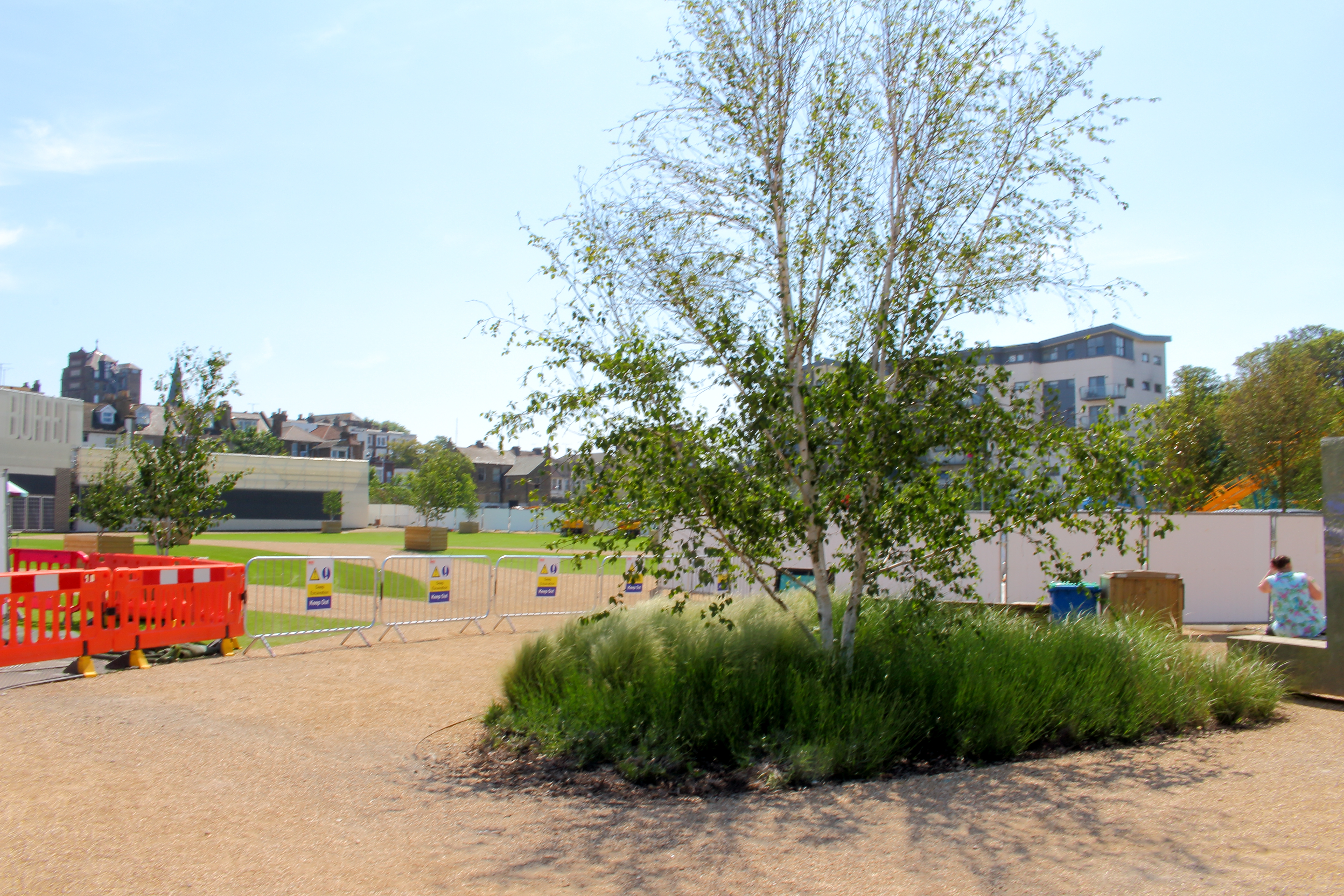 Dahinter schließt sich eine große Grünfläche an, die Tivoli Gardens, an deren Parkbegrenzung eine große Bühne steht.