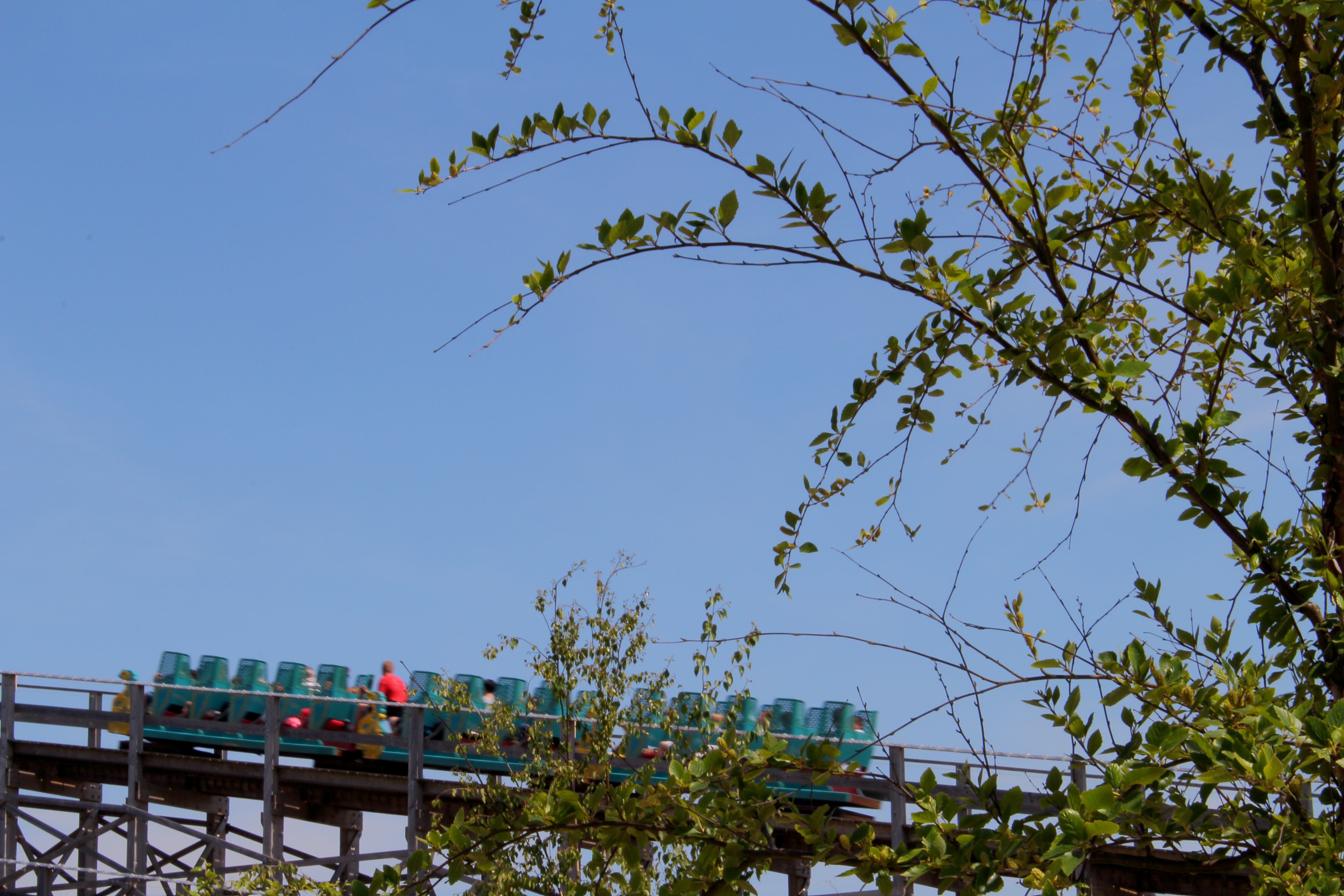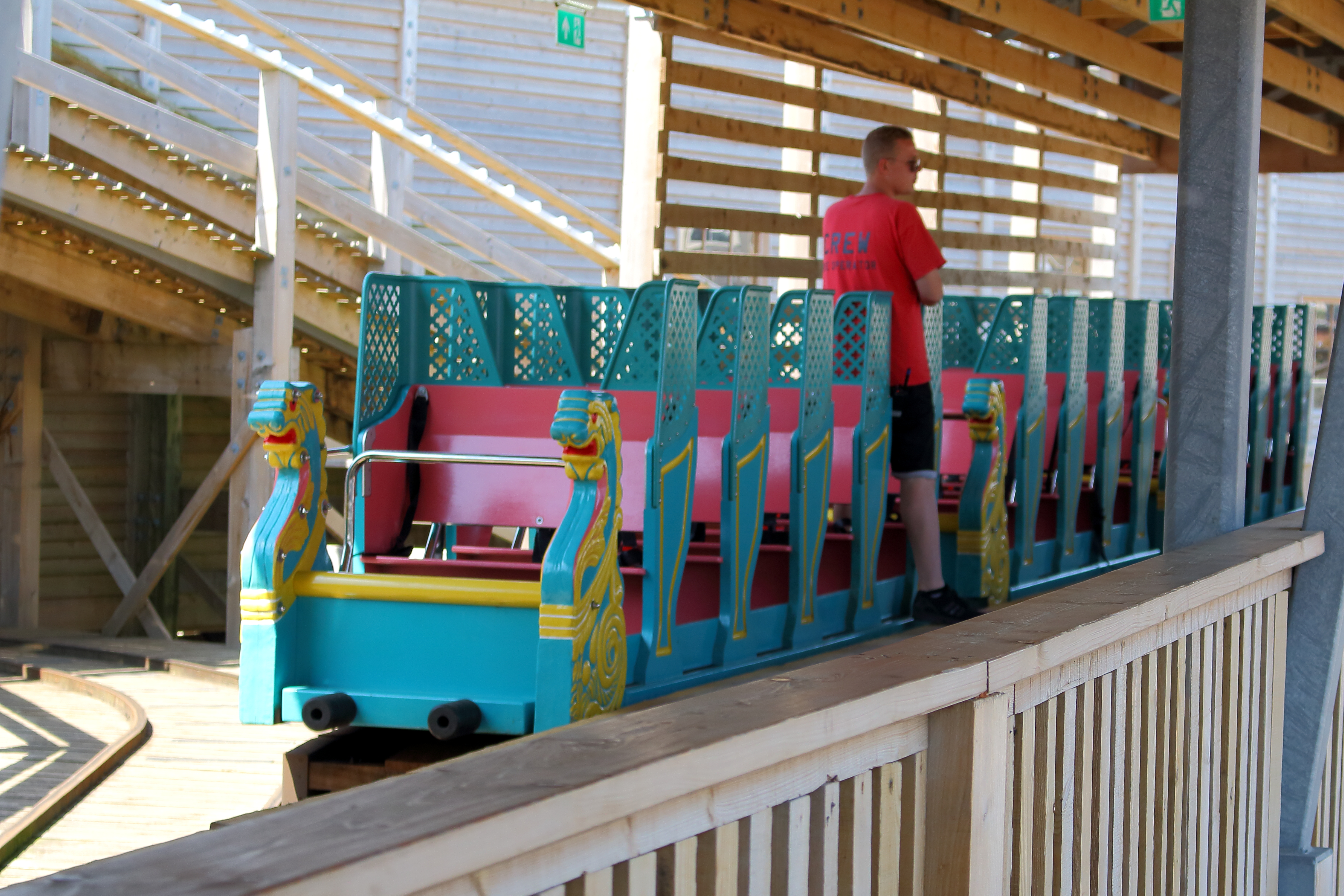Airtime an die Bahn herantritt, sondern sie als das nimmt, was sie ist, nämlich eine frisch renovierte sehr alte und überaus familienfreundliche Dame, bereitet sie sehr viel Spaß. V.a. wenn der gewaltige Aufwand des Parks mit eingerechnet wird. Wir sind sie knapp ein halbes Dutzend Mal gefahren und es machte auch aufgrund des lustigen Hüpfers im zweiten Double-Down immer noch Spaß. Die Strecke ist fast komplett mit Lichterketten versehen, daher sollte sie bei Nacht ein wohl noch schöneres Bild abgeben. Bei einer unserer Fahrten ist dann auf dem zweiten Lift vermutlich das Kabel aus seiner Führungsschiene gehüpft, weswegen wir eine kurze Aussichtspause auf dem Lift einlegen durften.