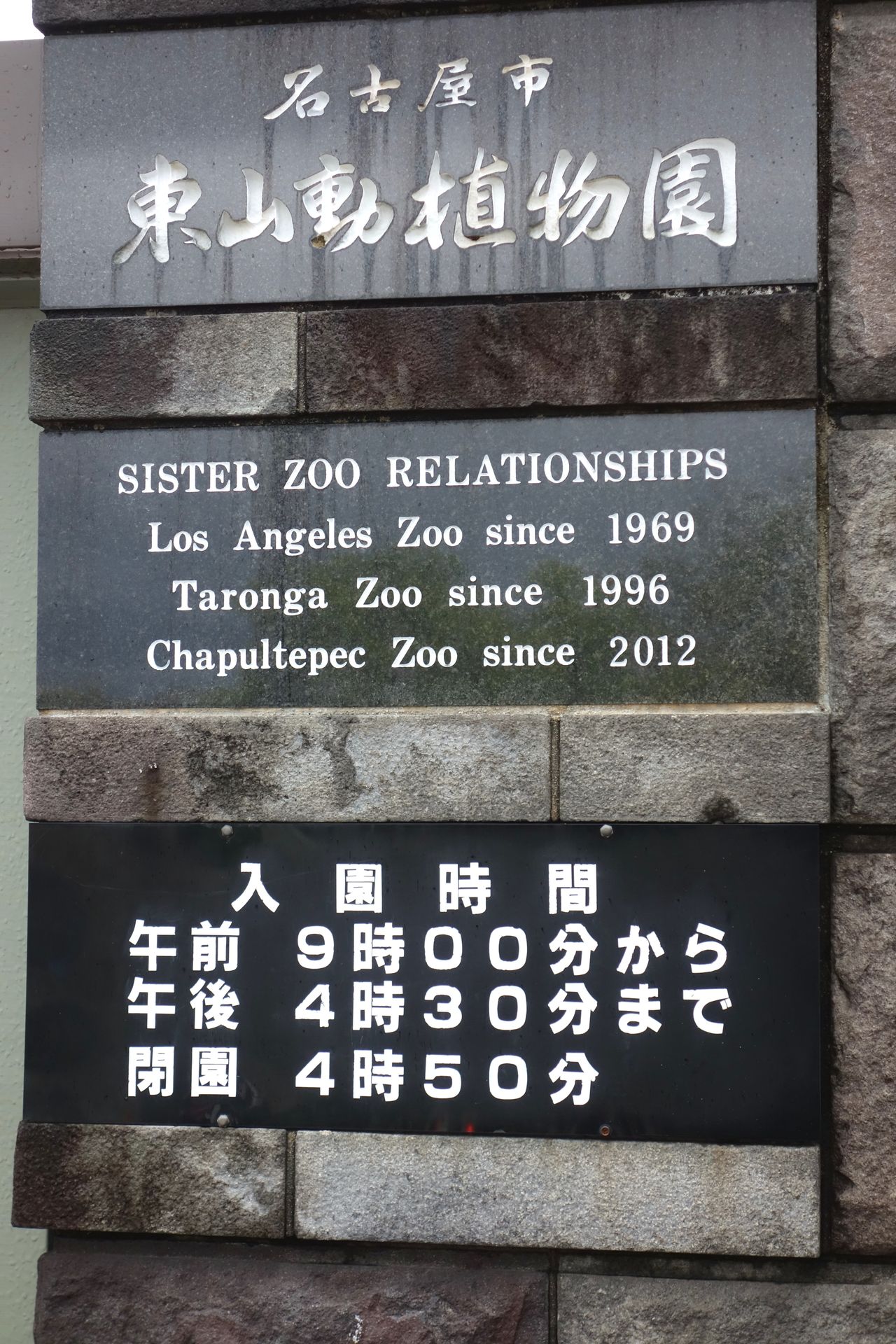 Zeit genug, die Info über die Schwesterzoos zu finden. Darunter die in Stein gemeißelten Öffnungszeiten: von 9 Uhr bis 16:50 Uhr, der letzte Einlass ist um 16:30 Uhr.