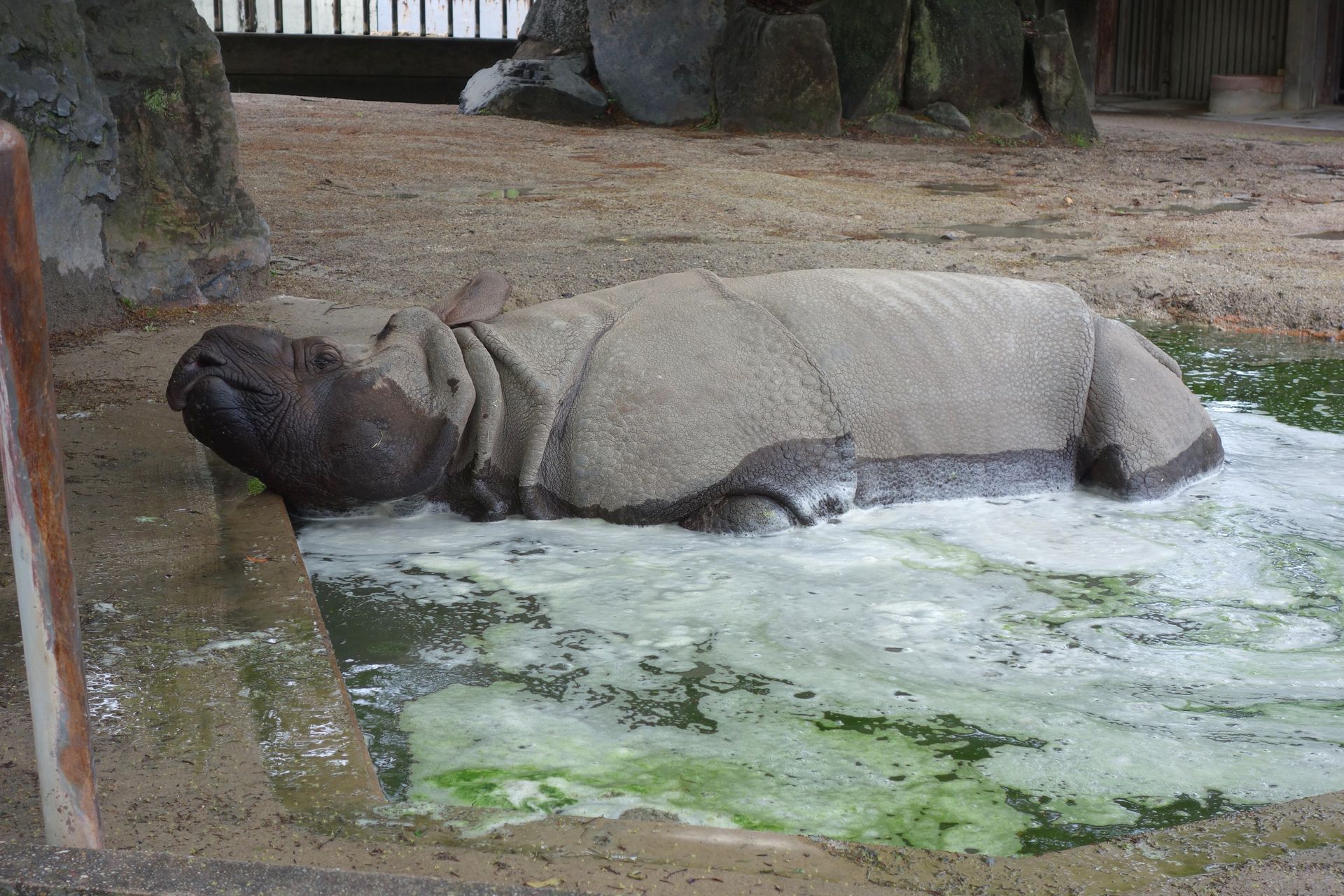 Ein Stück weiter gönnte sich ein Nashorn ein Bad im leider recht grünen Wasser.