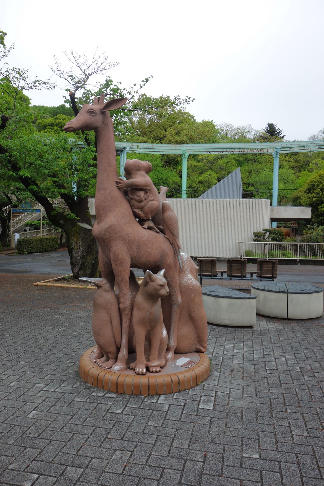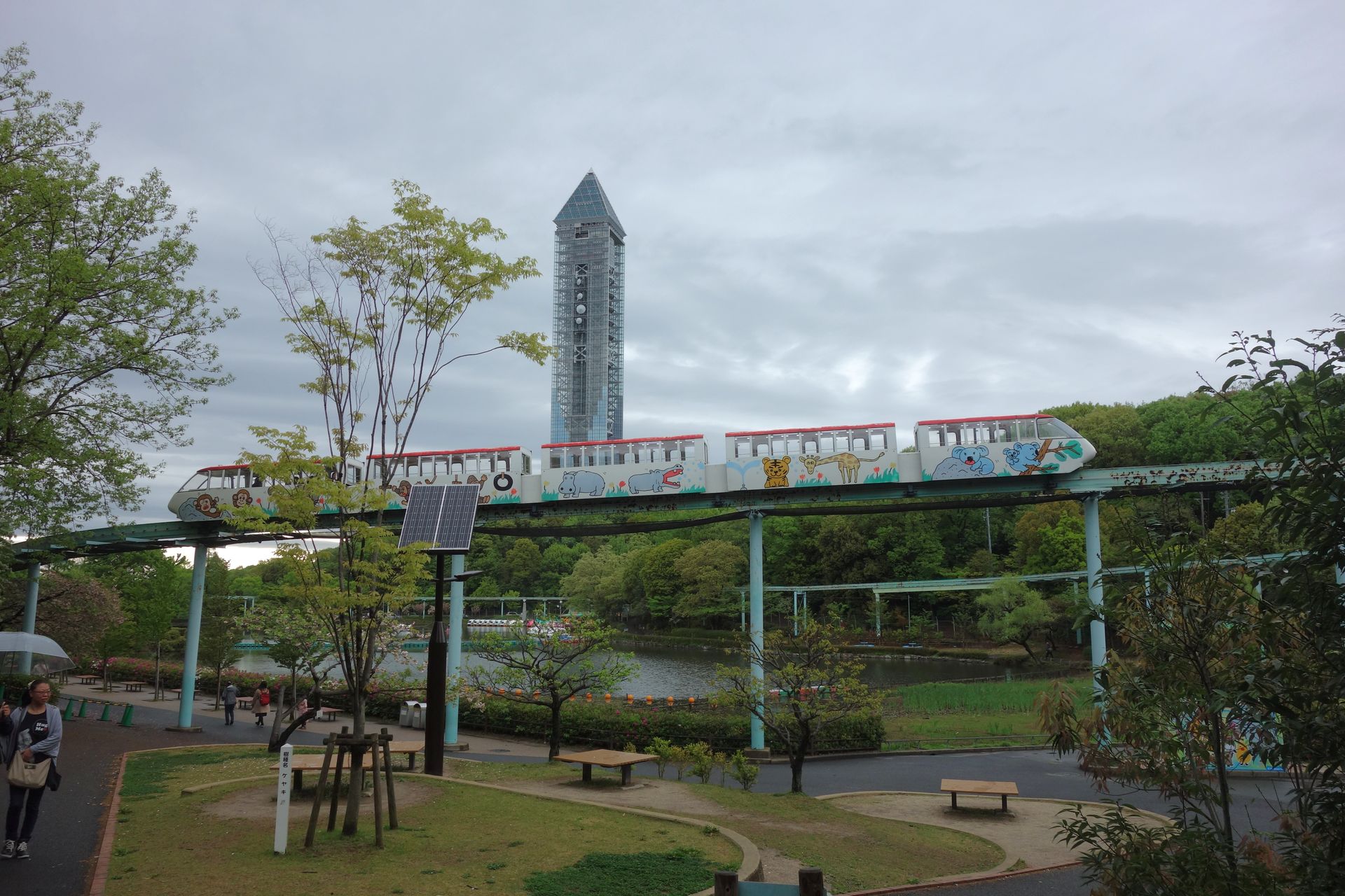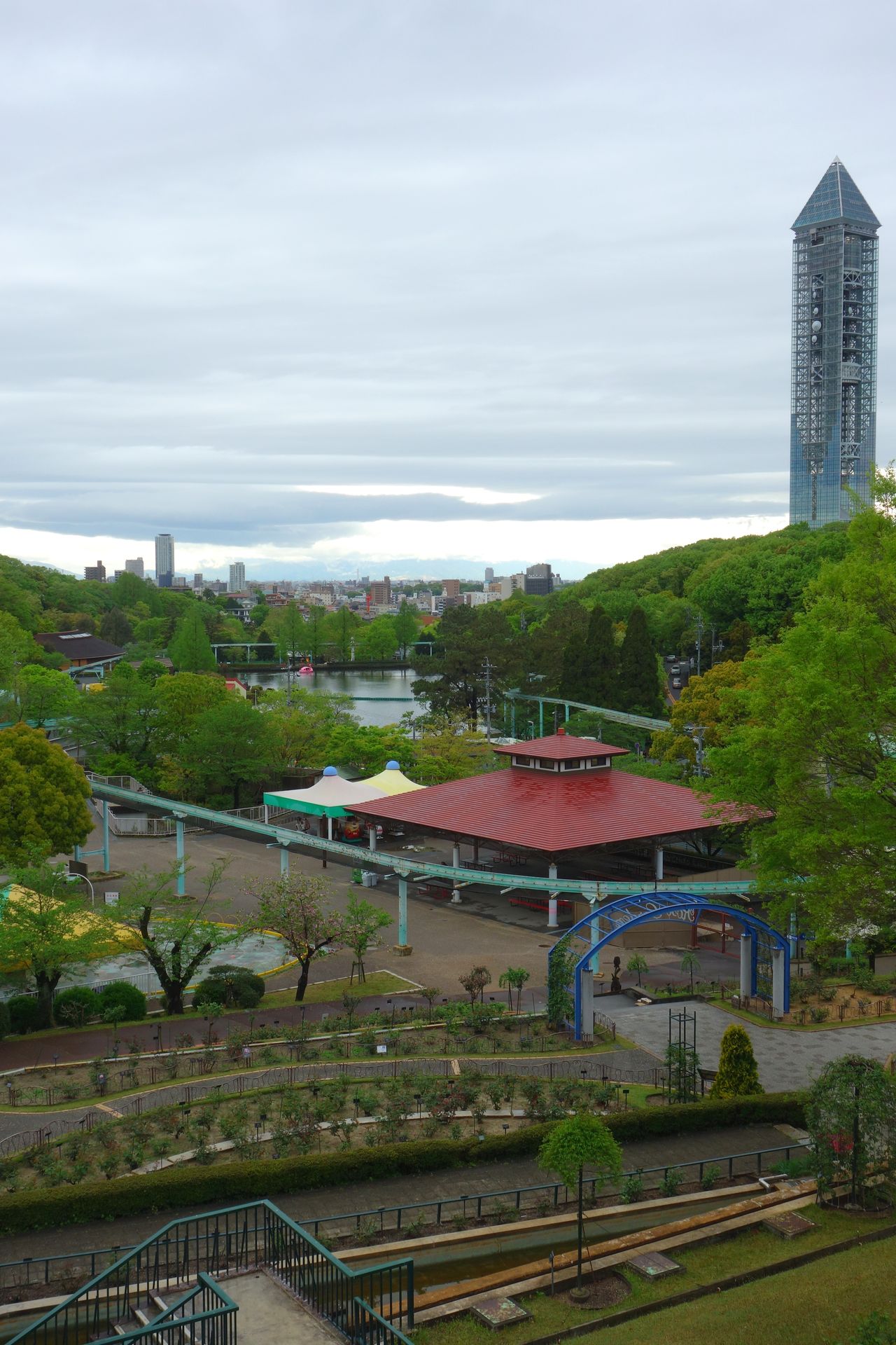 Der Aussichtsturm wurde im Jahr 1989 eröffnet und dient mit 14 Parabolantennen zusätzlich als Relaisstation für Radioübertragungen des Katastrophenschutzes. Der Turm selbst ist 134 Meter hoch, steht aber auf dem Berg. So befindet sich die Spitze quasi in einer Höhe von 214 Metern. Die Aussichtsplattform liegt in einer Höhe von 100 Metern (180 mit Berg). Wer diese besuchen möchte, zahlt für das Kombiticket 140 Yen mehr als für das reine Eintrittsticket in den Park. Ob man nachträglich überhaupt noch ein separates Ticket für den Sky Tower bekommt, kann ich jetzt nichtmal mehr sagen. Wir haben nämlich verzichtet, auch wenn der unverbaute Ausblick - insbesondere bei Nacht - sehr sehenswert sein soll. Auch das gegenüberliegende Reptilienhaus sahen wir nur von außen, denn allmählich wurde es doch Zeit, sich in Richtung Ausgang zu begeben.