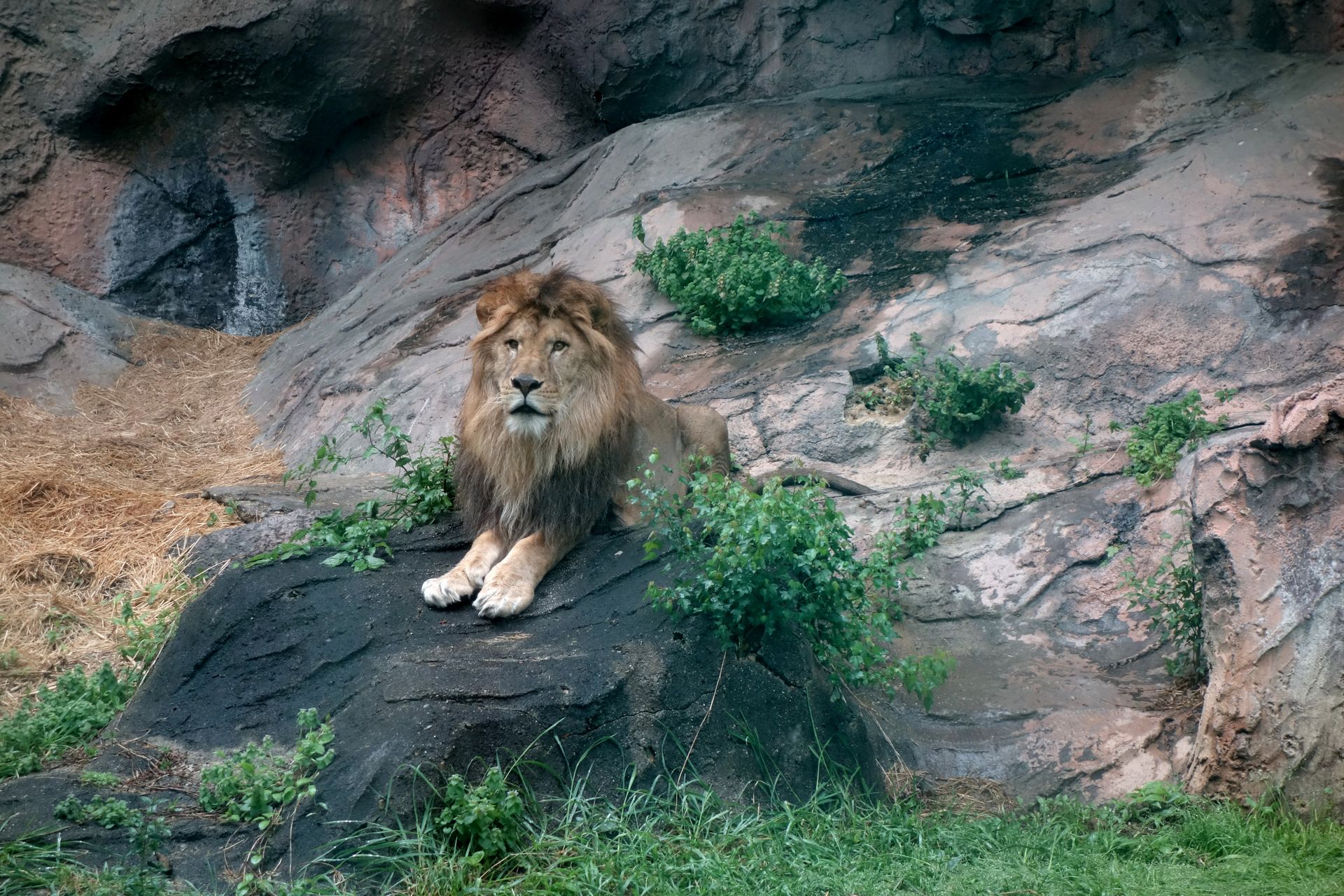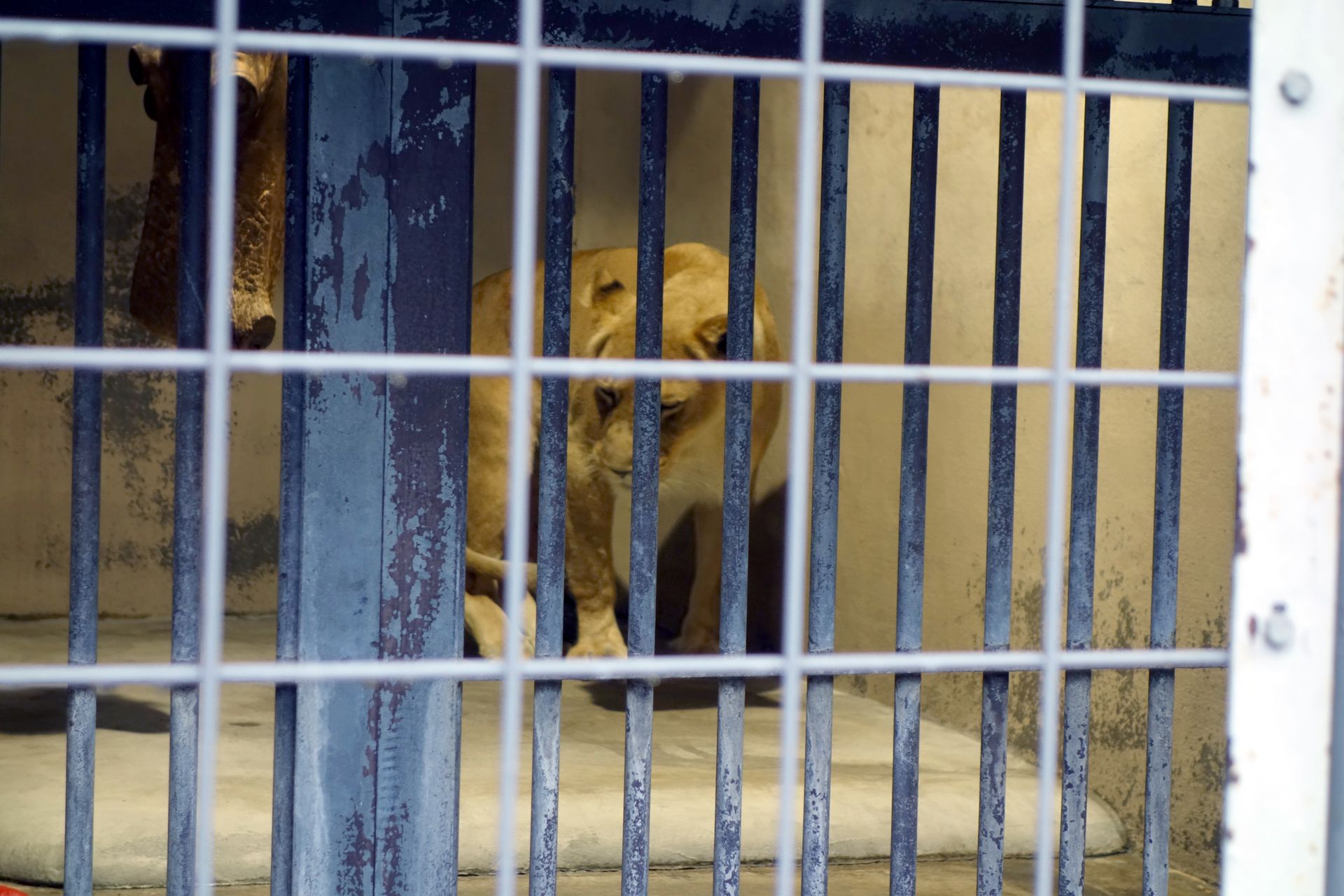 Frau Löwe kauerte im kleinen Käfig auf der Rückseite der Felswand.