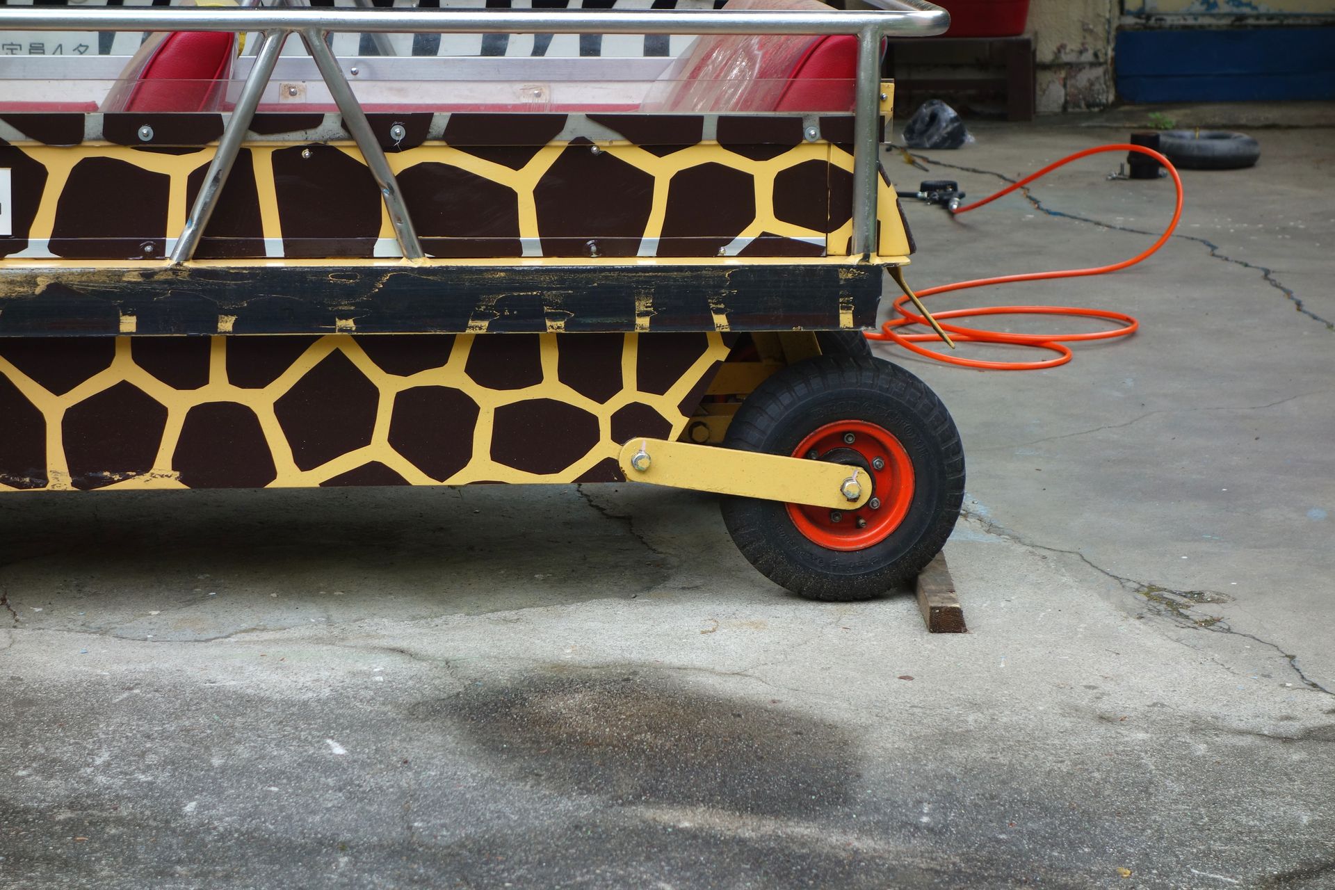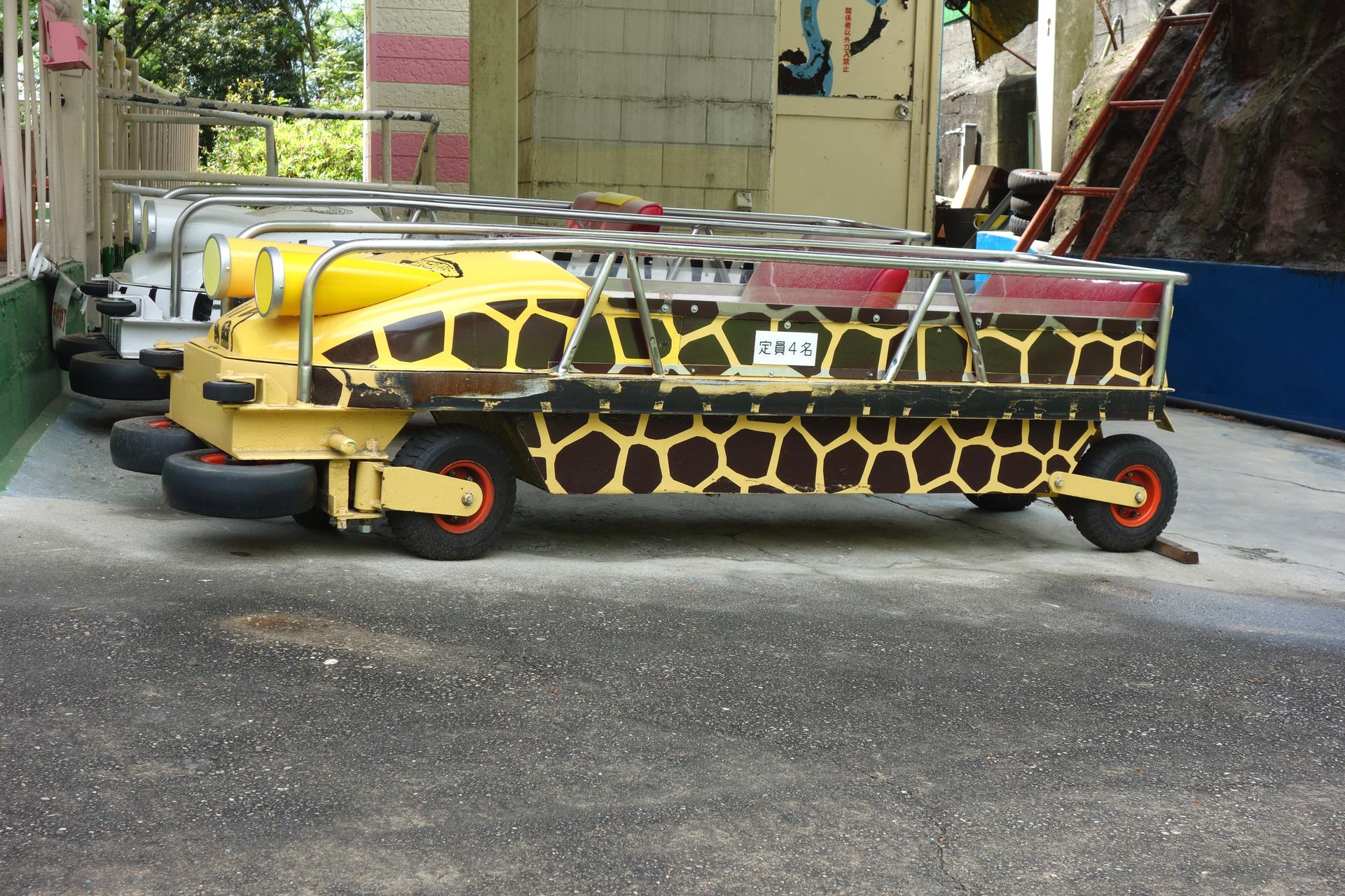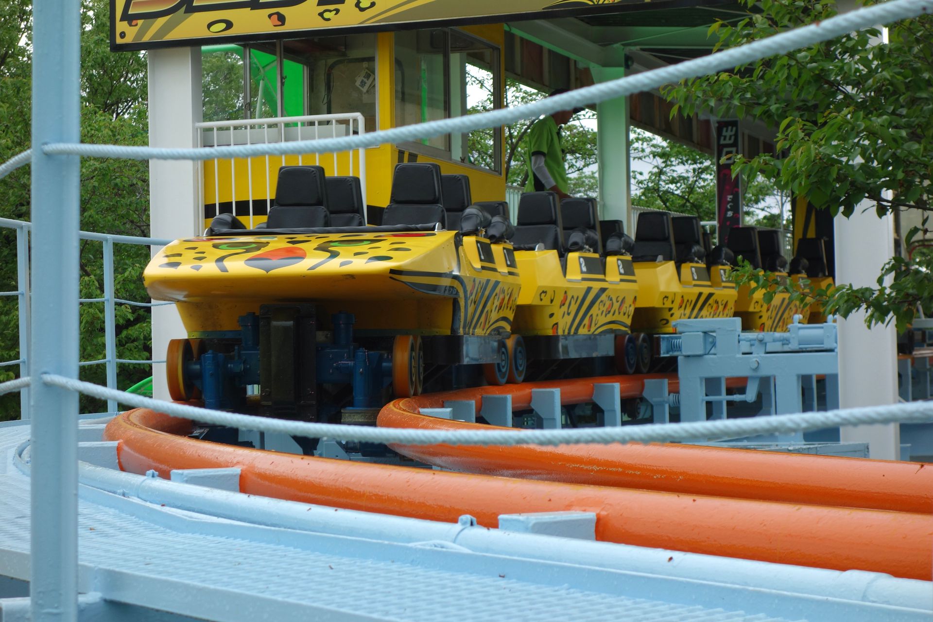 Überraschenderweise hat man hier auf die sonst in Japan weit verbreiteten Schulterbügel verzichtet und stattdessen einen simplen Schoßbügel installiert. Das Einsteigen in die recht tiefen Chaisen mit wenig Platz für lange Beine erforderte dennoch etwas Übung, wie bei allen bisher getesteten Bahnen aus dem Hause Meisho. Übrigens trug der Zug bis zum März 2018 noch einen simplen roten Zierstreifen an der Seite. Das neue Leopardenmuster war wohl erst gute drei Wochen vor unserem Besuch aufgebracht worden. Und auch die Strecke war im Frühjahr frisch lackiert worden.