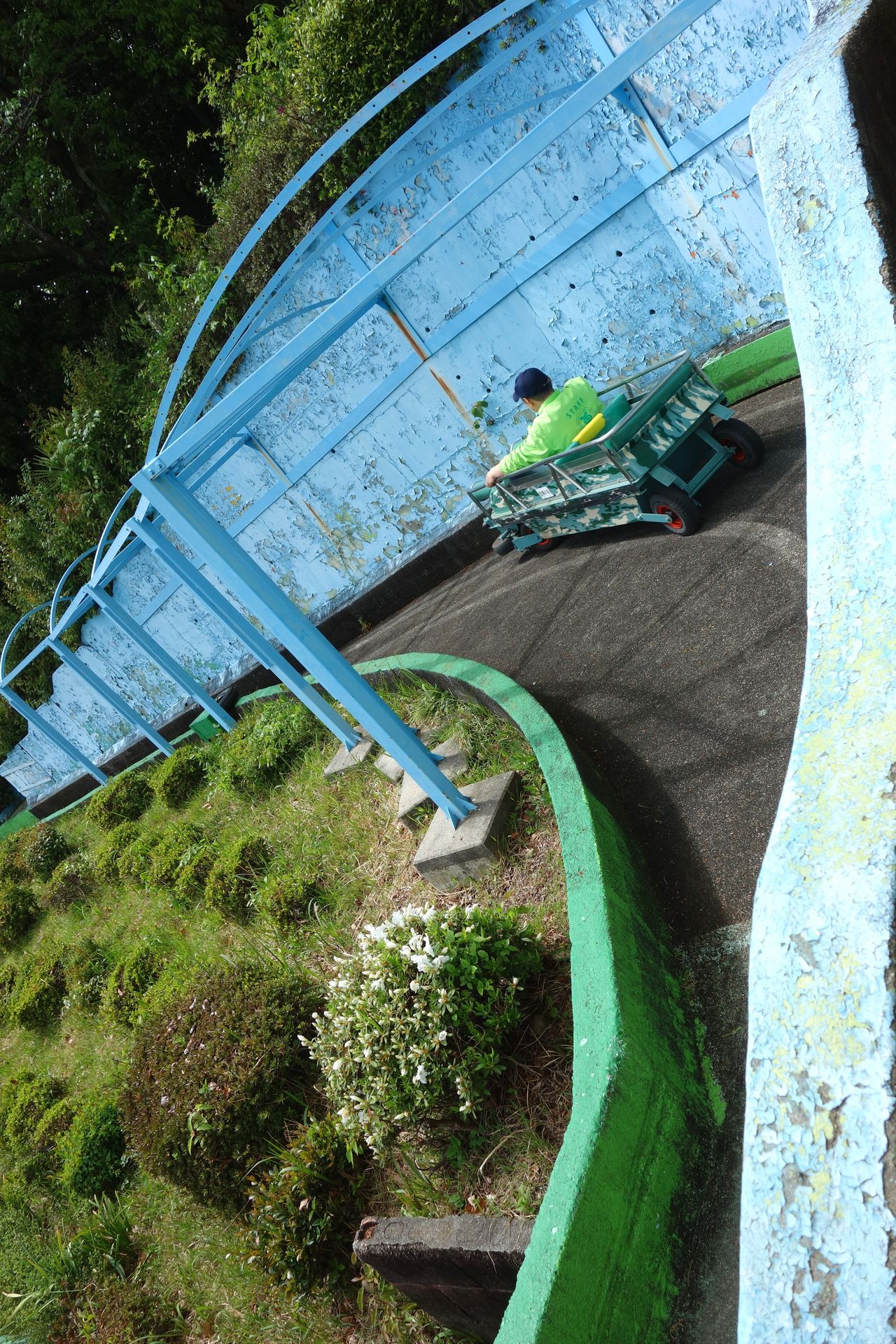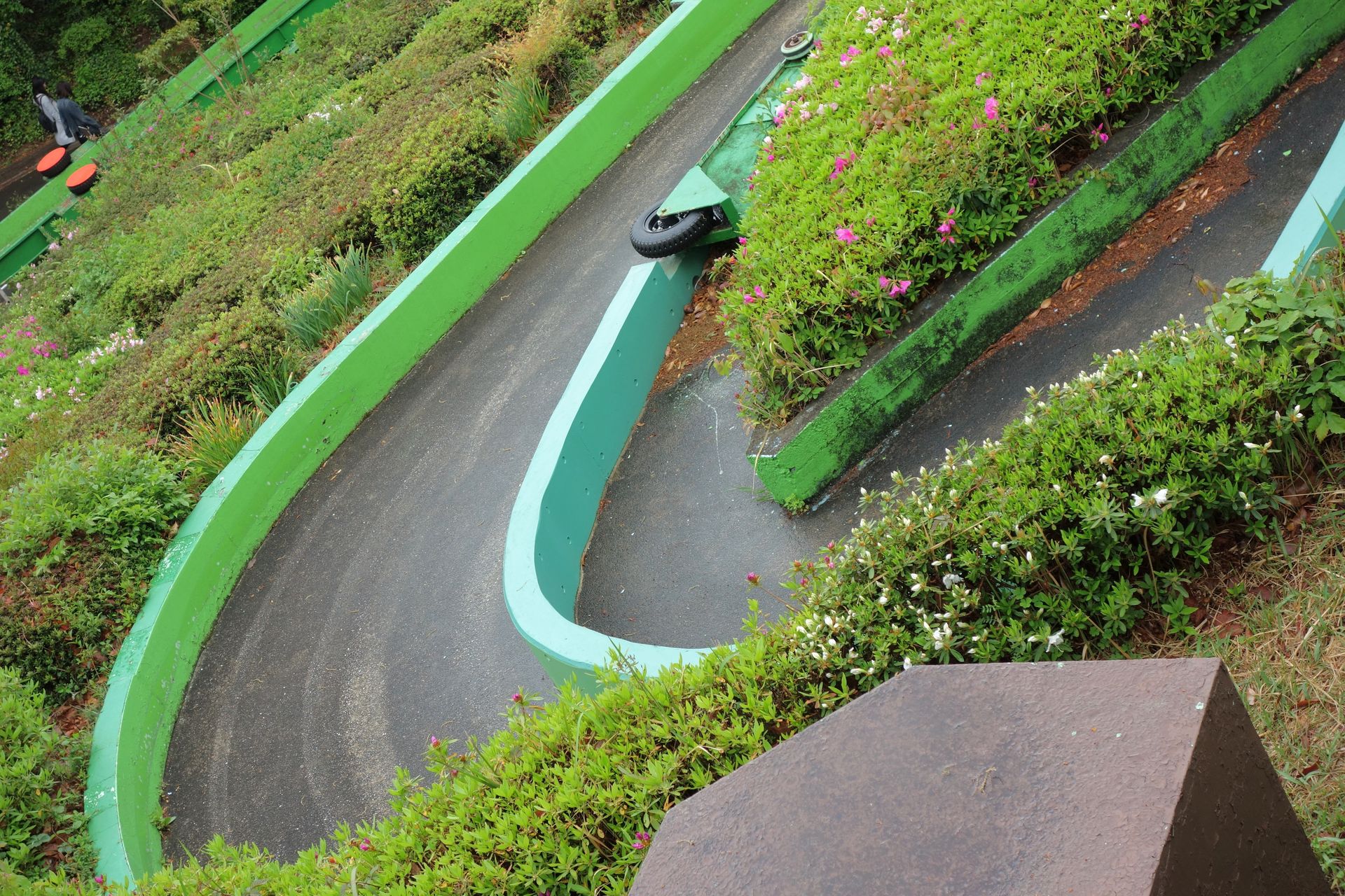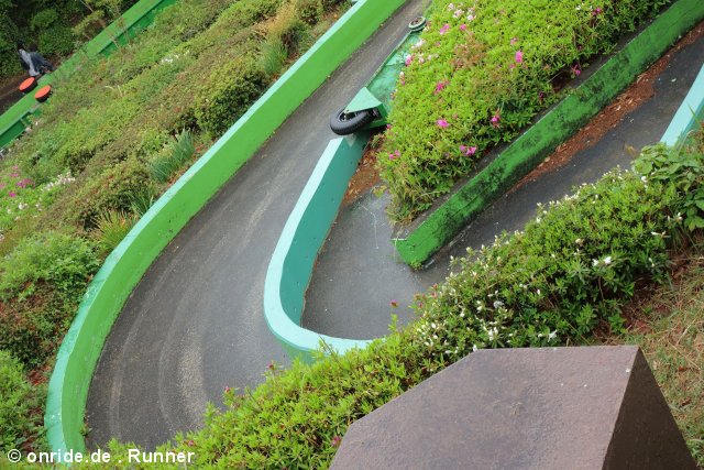 Wie man sieht, besteht die Strecke aus einem recht simplen, in den Hang gebauten Serpentinen-Layout. Die oberste Ebene und sämtliche Kurven sind schlicht asphaltiert und werden von Betonmäuerchen begrenzt, die übrigen Geraden bestehen aus schmalen Metallwannen. Abgesehen von einem kleinen Steilstück ist das Gefälle sehr überschaubar.