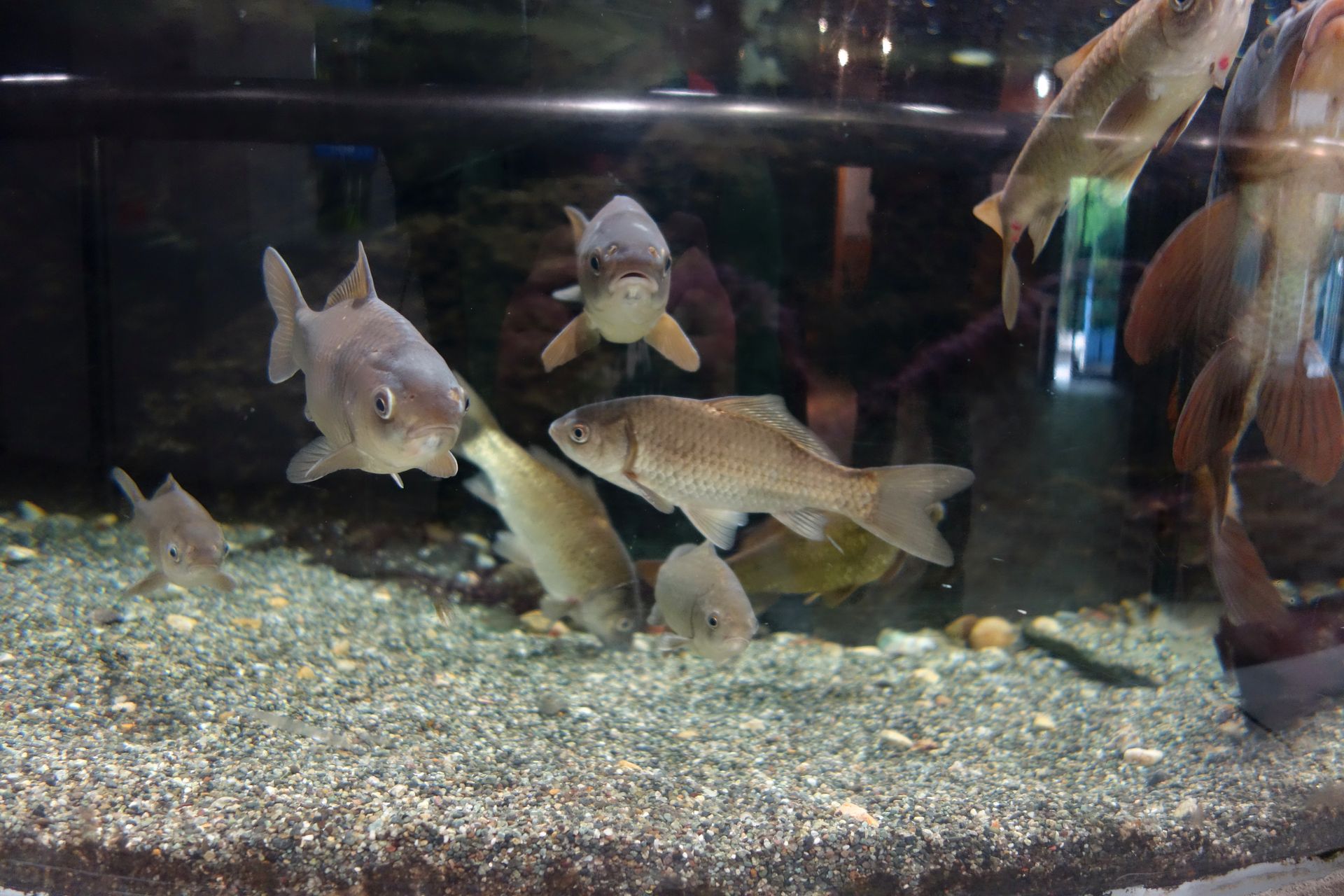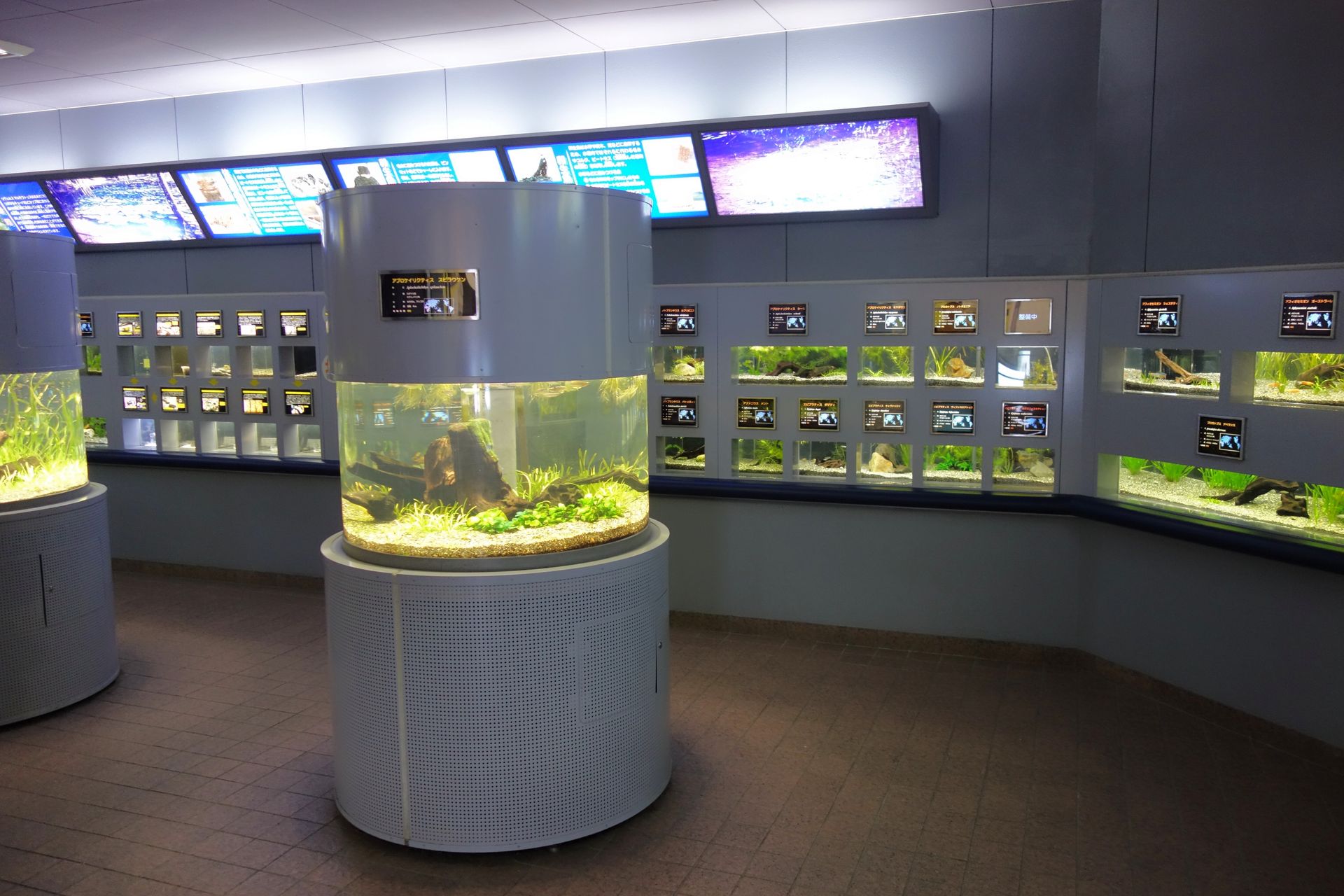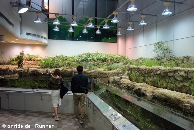 Wenn ich mich recht entsinne, hatten sich unsere Wege zwischenzeitlich mal kurz getrennt, weil mico seiner Nikotinsucht nachgehen musste. Wir drei anderen schauten uns derweil die 2010 renovierte Medaka World an. Wer jetzt noch weiß, dass der Medaka auch als Japanischer Reisfisch bekannt ist und unter anderem eben in Reisfeldern lebt, der kommt schnell auf den Trichter, dass es sich hierbei um ein Aquarium handelt.