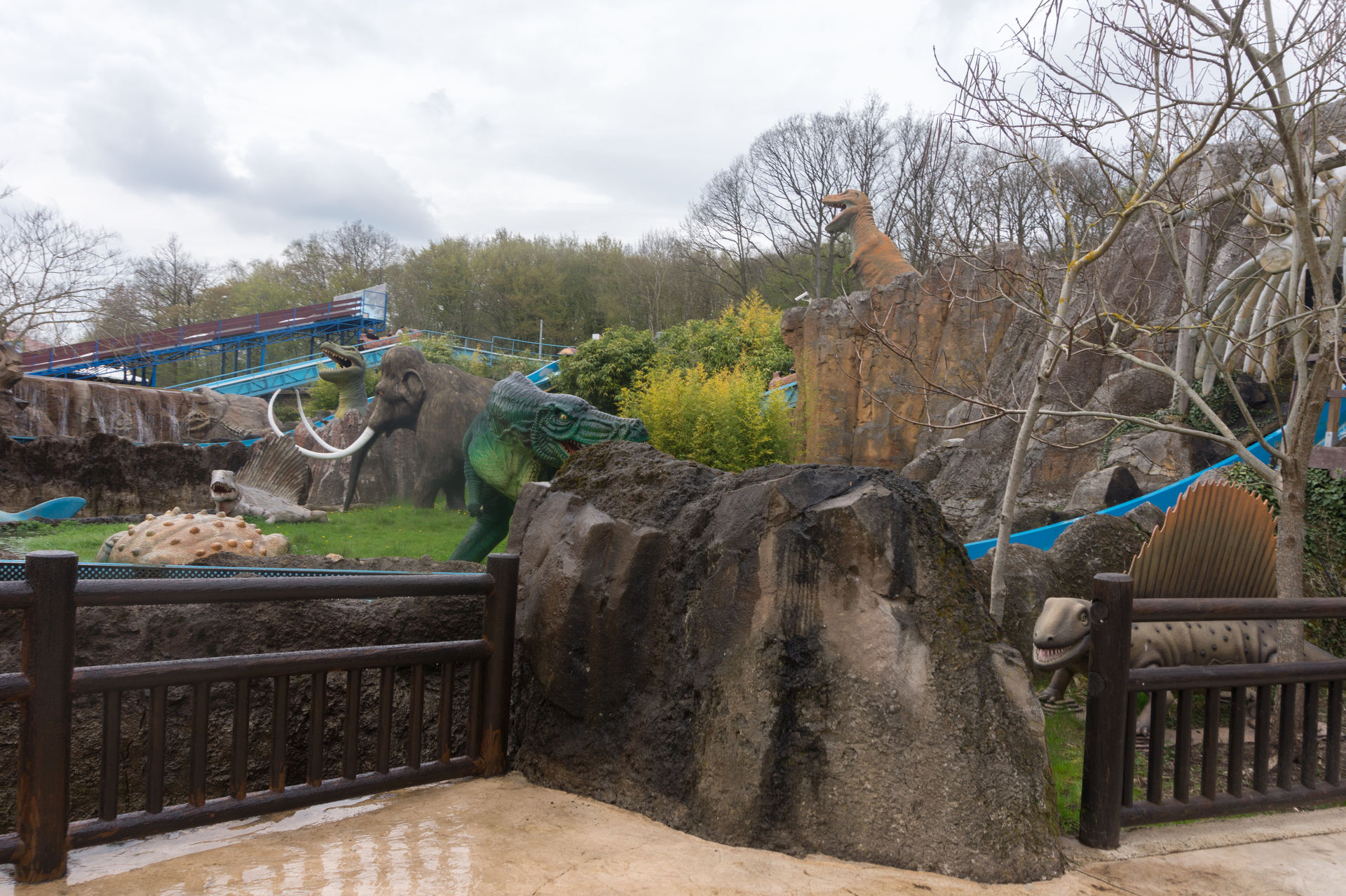 Direkt nebenan befindet sich die aufwändig gestaltete Wildwasserbahn Dino Splash des Herstellers Interlink. Bereits die Warteschlange der Anlage ist überraschend ansprechend gestaltet und lässt auf eine aufregende Fahrt hoffen.