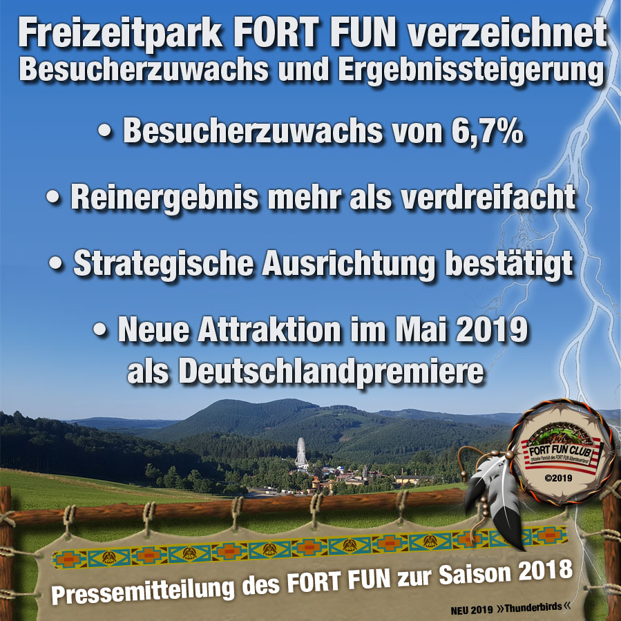 Bestwig, 5. Februar 2019 – Das Team vom FORT FUN Abenteuerland blickt auf eine erfolgreiche Saison 2018 zurück. Trotz des schwierigen Sommers mit extremer Hitzeperiode im August konnte die Besucherzahl um 6,7% gesteigert und das Reinergebnis sogar mehr als verdreifacht werden. Die Parkleitung freut sich über dieses sehr gute Ergebnis und sieht dies als Bestätigung der Strategie „der kleinen Schritte“. Diese beinhaltet zunächst Investitionen in die bestehende Infrastruktur und die alten Klassiker des Parks, wie beispielsweise die vollständige Sanierung der Westernstadt, die Umsiedlung der Kinderfahrgeschäfte vor den Indoorspielplatz FORT FUN L.A.B.S., die Überarbeitung der Strecke der Marienkäferbahn und die Eröffnung von Family Plus Blockhäusern im FORT FUN Abenteuercamp. Diese stetigen Investitionen bewirken eine kontinuierliche Steigerung der Qualitätsstandards und führen zu einem insgesamt frischeren Erscheinungsbild des Parks. Neben diesen Maßnahmen sorgten aber auch neue Events wie der Kids Day oder das Oktoberfest für höhere Kundenzufriedenheit und ein abwechslungsreiches Angebot vor allem auch für wiederkehrende Gäste. Der nächste Schritt der strategischen Weiterentwicklung ist nun schon ein etwas größerer, denn der Freizeitpark im Sauerland wird seinen Gästen in der Saison 2019 eine neue Attraktion bieten können und das sogar als Deutschlandpremiere. Mit „Thunderbirds“, einem Air Race 8.2 von Zamperla, investiert das FORT FUN erstmalig seit über 10 Jahren über eine Million Euro in eine einzelne Attraktion und einen neuen indianischen Themenbereich.