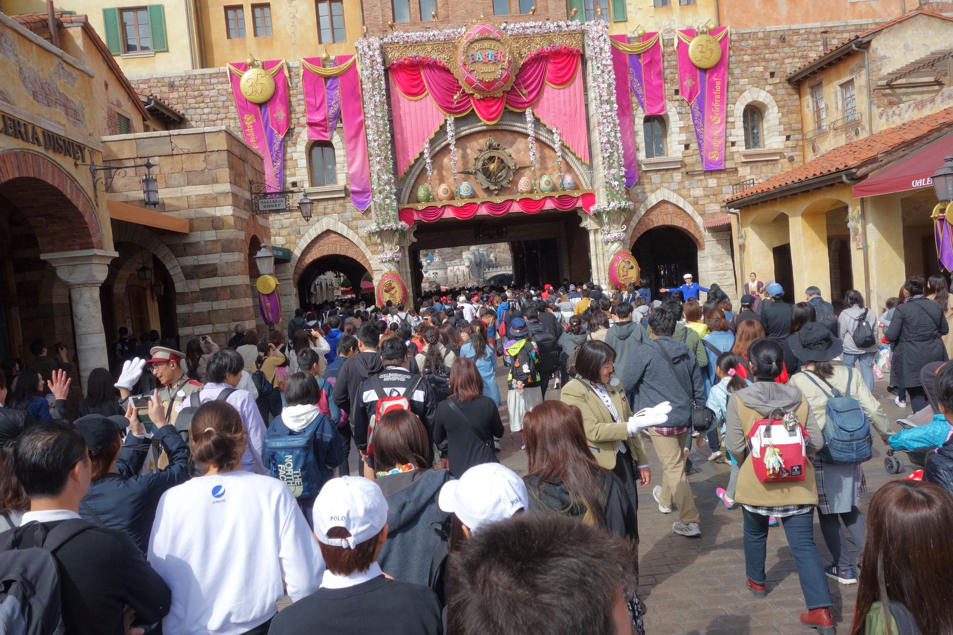 Nach einer flotten Taschenkontrolle wird man auf die DisneySea Plaza entlassen, wo sich die Besucherströme von Nord- und Südeingang treffen.