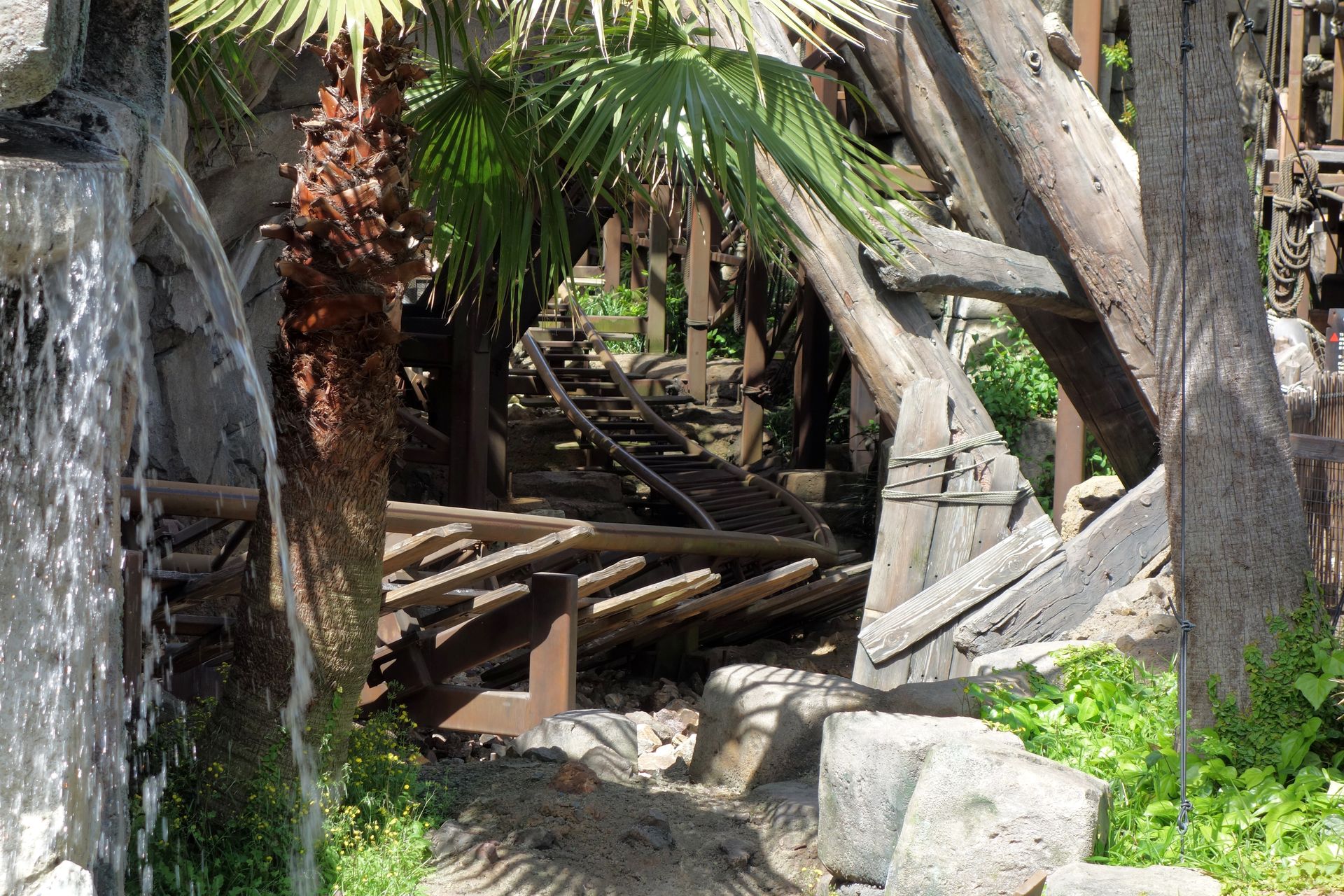 Eine schnöde Treppe führt vom Ausstiegsbereich hinunter zu den Wegen von Mysterious Island. Übrigens werden auch die Abenteurer aus der Romanvorlage von einer Eruption an die Erdoberfläche zurückgebracht. Man hat sich also nur die spektakulärsten Passagen des Romans herausgesucht und in einer völlig eigenen Geschichte verbaut. Und die hat uns tatsächlich ziemlich vom Hocker gehauen. Also jetzt weniger die Geschichte an sich muss ich sagen. Der Darkride-Part ist absolut nicht schlecht, aber irgendwie fehlt mir noch etwas. Im Endeffekt sind die einzelnen Szenen doch quasi nur Lückenfüller auf dem Weg zum großen Finale. Andererseits ist genau jener rasante Sprint zurück an die Erdoberfläche der Grund, weshalb ich die Reise zum Mittelpunkt der Erde so genial fand - neben der Monster-Animatronic und der Queue mit den perfekt umgesetzten Terravatorn. Als Darkride fand ich die Radiator Springs Racers doch noch eine Spur besser, aber dieser unerwartete