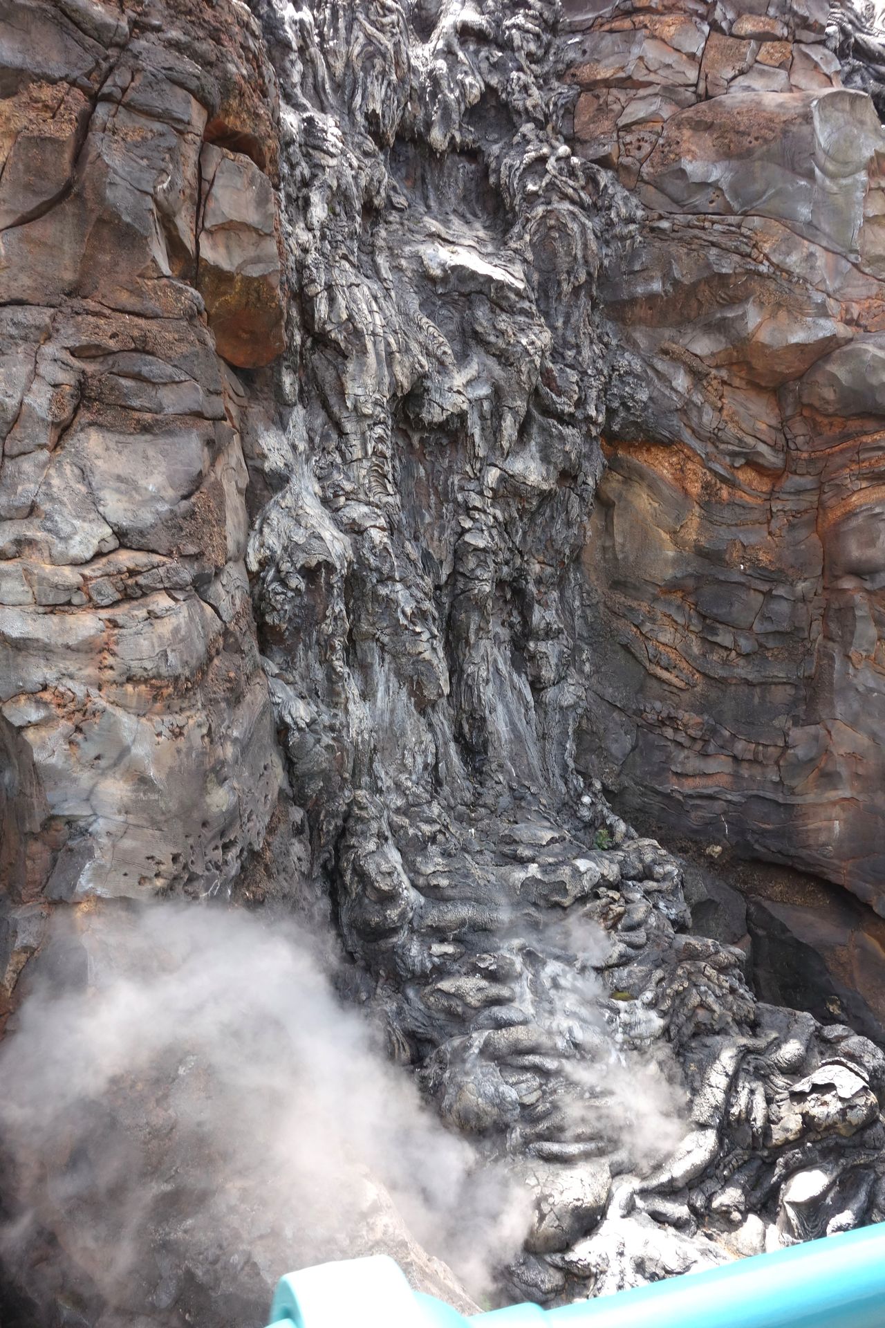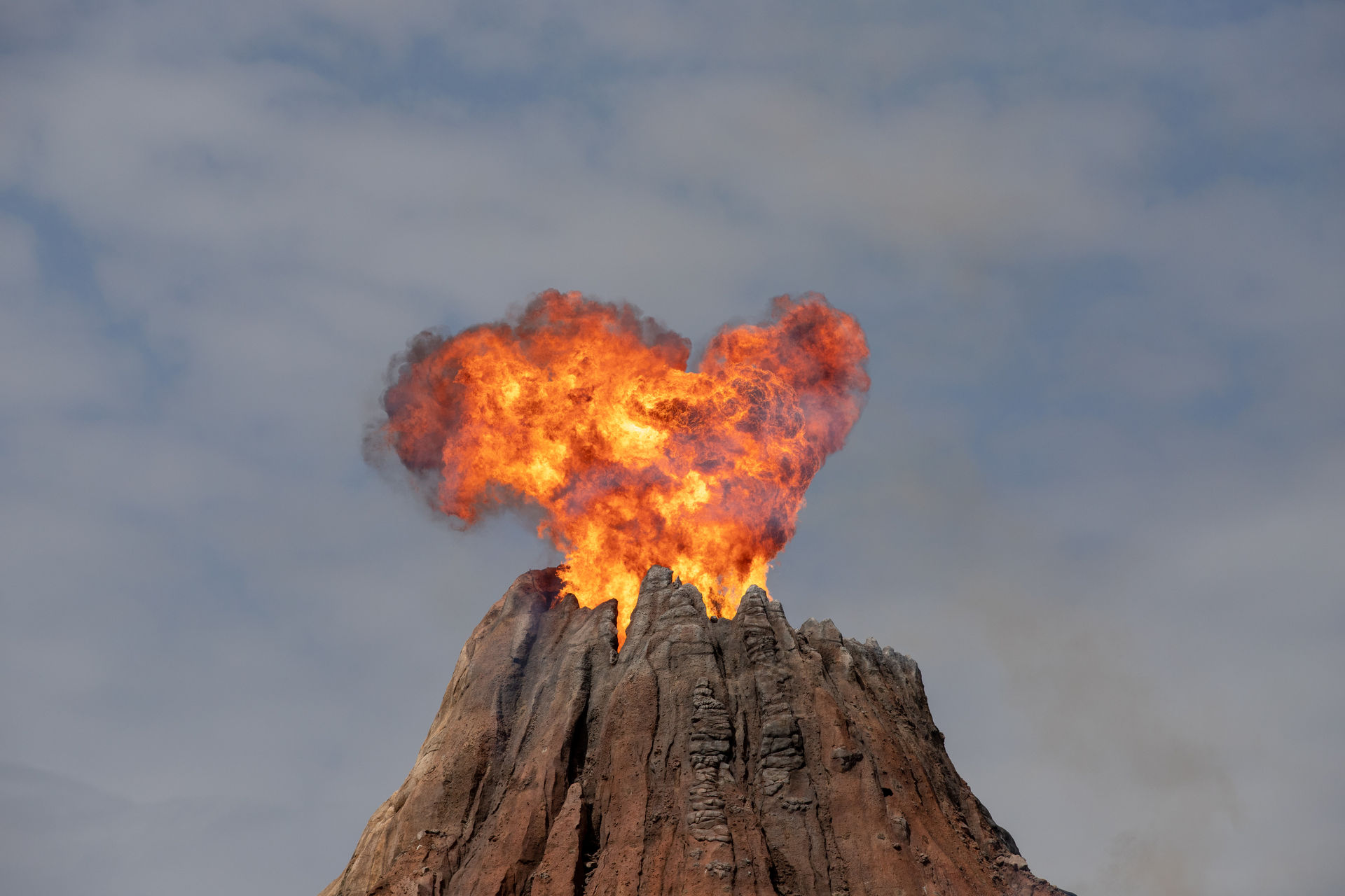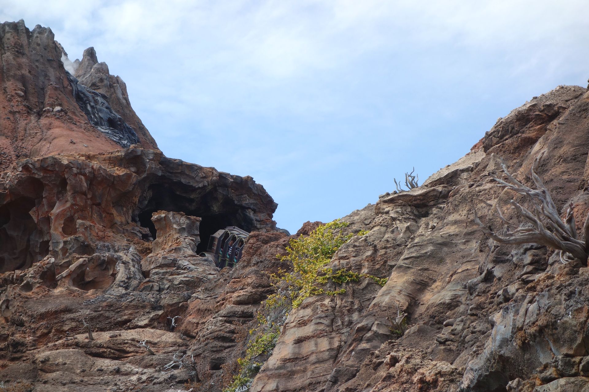 Der Angriff des Monsters ist aber nicht unser einziges Problem. Die Lage spitzt sich zu, wenn immer mehr Rauchschwaden um uns herum aufsteigen. In diesem Moment dreht der Motor des Fahrzeugs kräftig auf und beschleunigt uns in die Dunkelheit hinein. In einer engen Spirale winden wir uns wieder nach oben. Plötzlich sieht man Licht am Ende des Tunnels und erwartet instinktiv, dass das Fahrzeug nun allmählich abbremst. Doch es beschleunigt einfach weiter, bis es mit einer Geschwindigkeit von 76 km/h aus einer seitlichen Öffnung des Vulkans ans Tageslicht herausschießt.