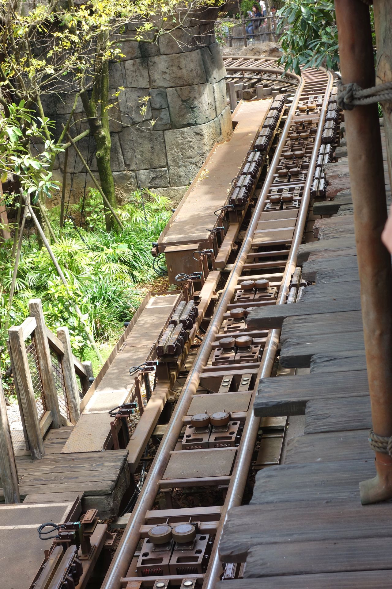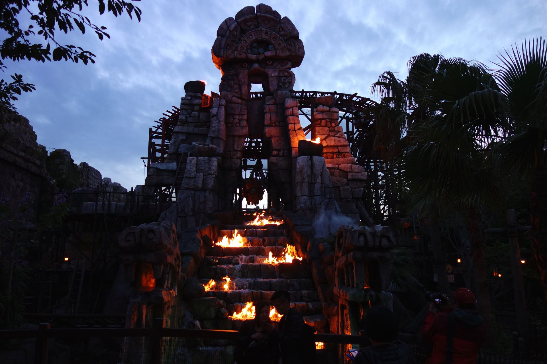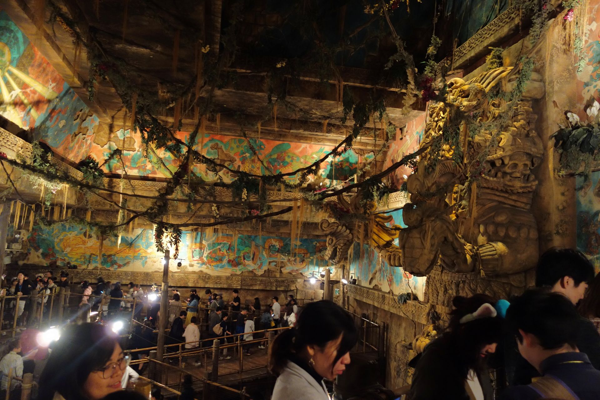 Als Indiana Jones Adventure: Temple of the Forbidden Eye hatte im dortigen Disneyland 1995 das Original den Betrieb aufgenommen. Hier in Tokio wurde mit der Eröffnung von DisneySea 2001 die erste und bislang einzige Kopie des rasanten Darkrides eröffnet. Hier und da gibt es natürlich kleine Unterschiede, aber im Großen und Ganzen sind die beiden Versionen baugleich. Man steigt also in die gleichen 12-sitzigen Jeeps mit ihren ausgedehnten Bewegungsmöglichkeiten ein und erlebt weitestgehend identische Szenen. Mit dem bisher neuesten Film aus dem Jahr 2008 hat die Fahrt also nix zu tun, obgleich sie hier in Tokio "Indiana Jones Adventure: Temple of the Crystal Skull" getauft wurde. Nachdem ich 2013 dank Onride schon das Original erleben durfte, konnte mich die Kopie genauso begeistern. Vielleicht sogar noch ein bisschen mehr dank deutlich niedrigerer Wartezeit. Denn selbst die am Morgen angeschriebenen 10 Minuten konnten wir umgehen, indem wir die Single-Rider-Line nutzten. Dort ging es direkt bis zur Station vor und nach kurzer Zeit saßen wir in den Jeeps.