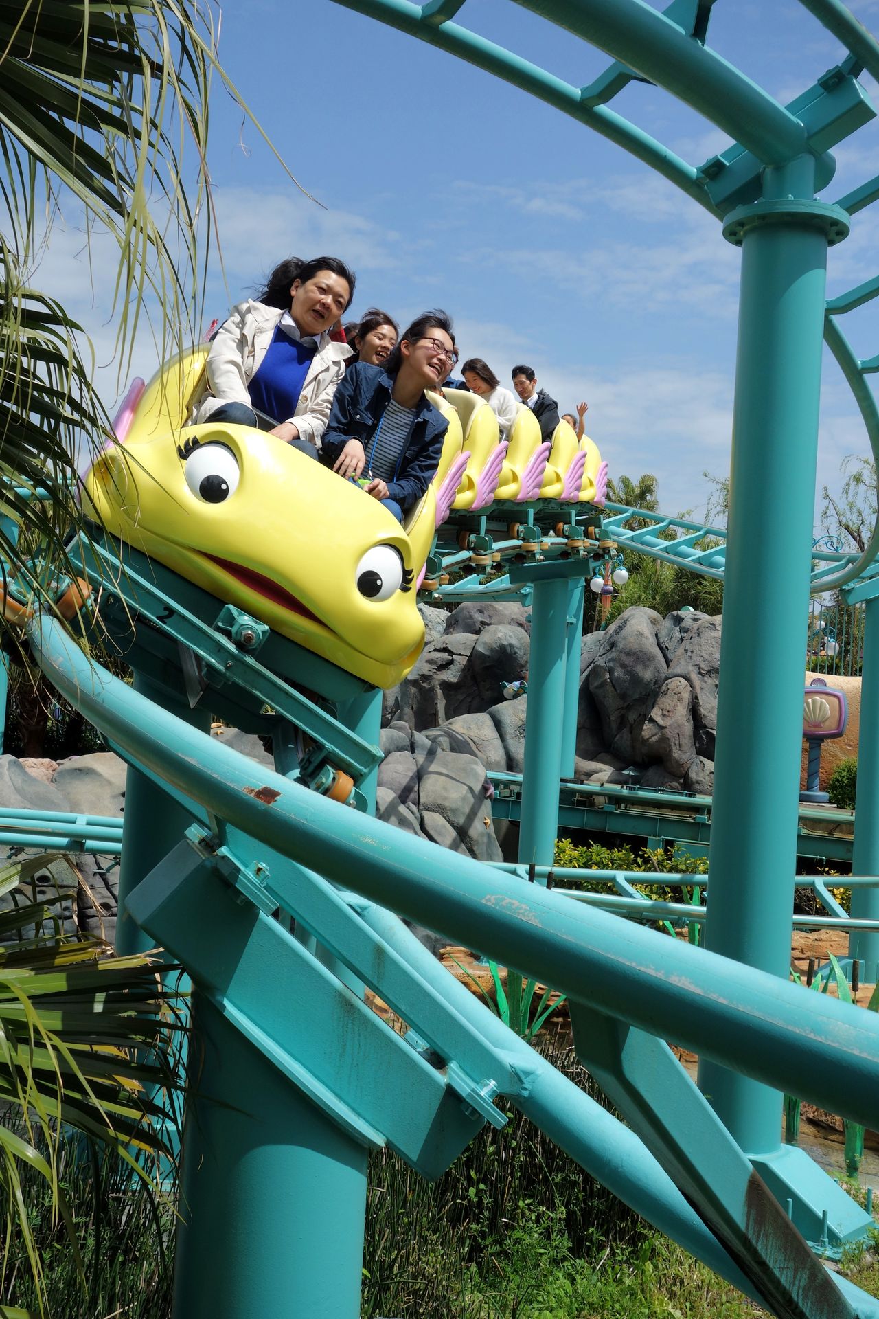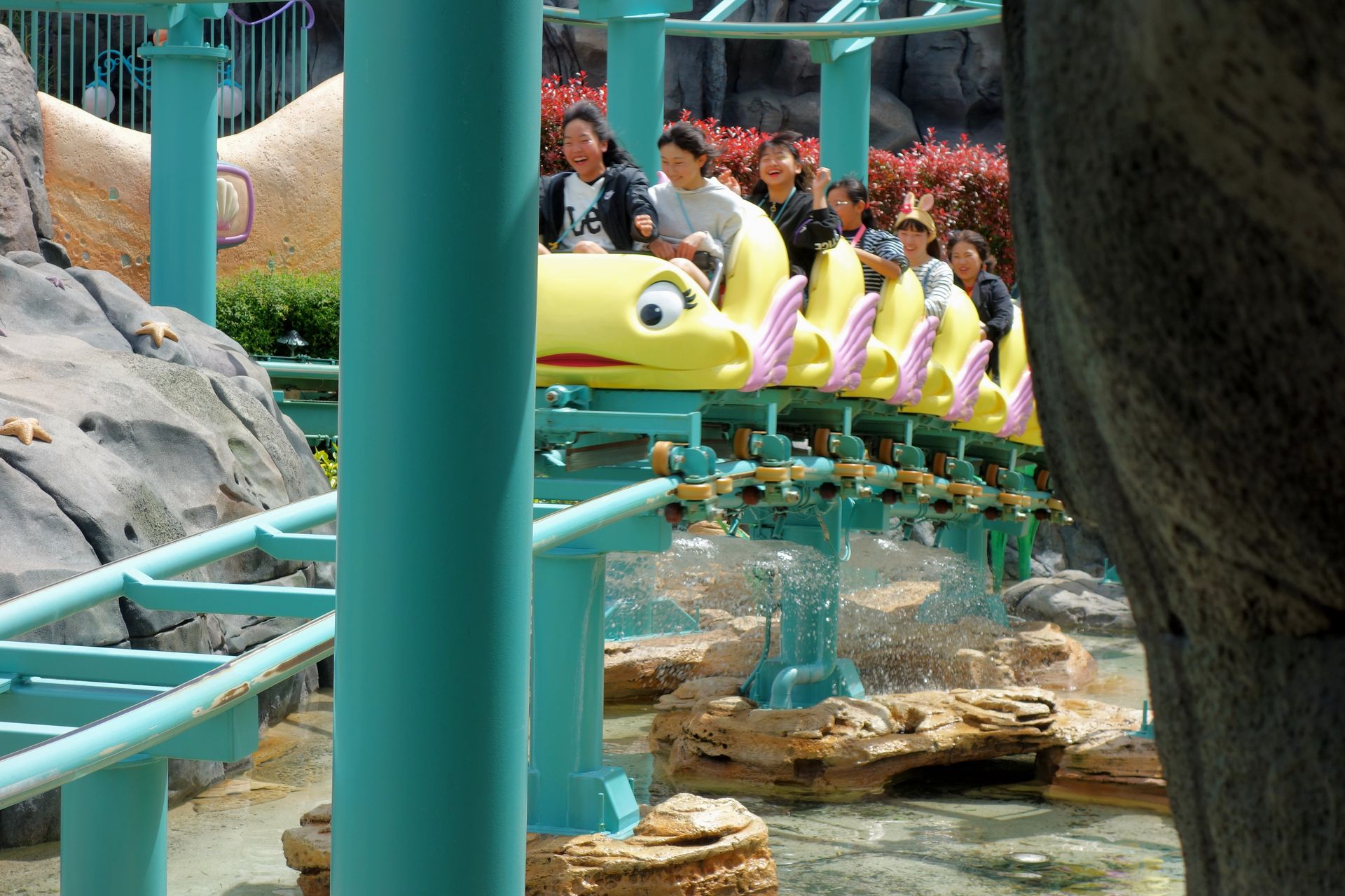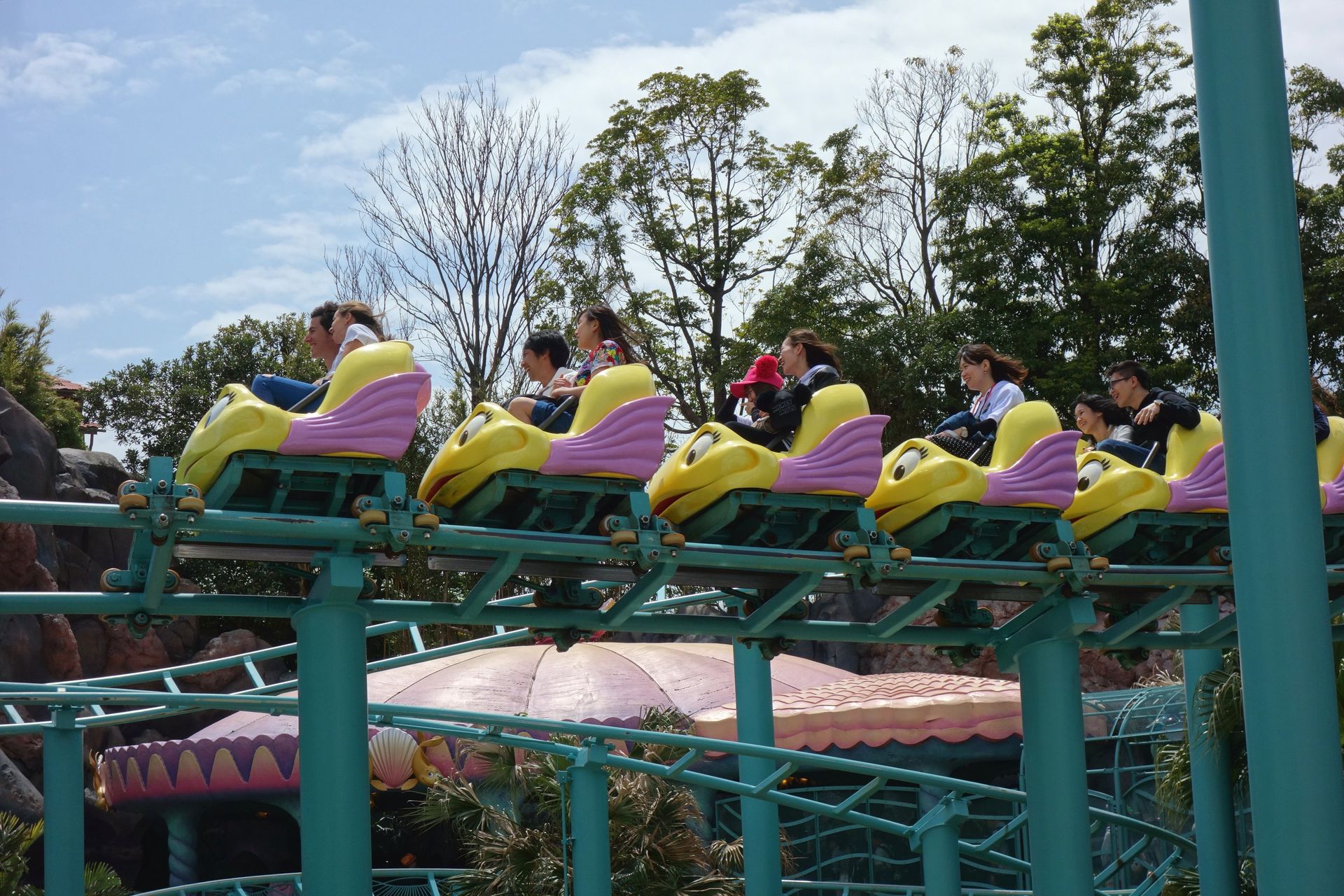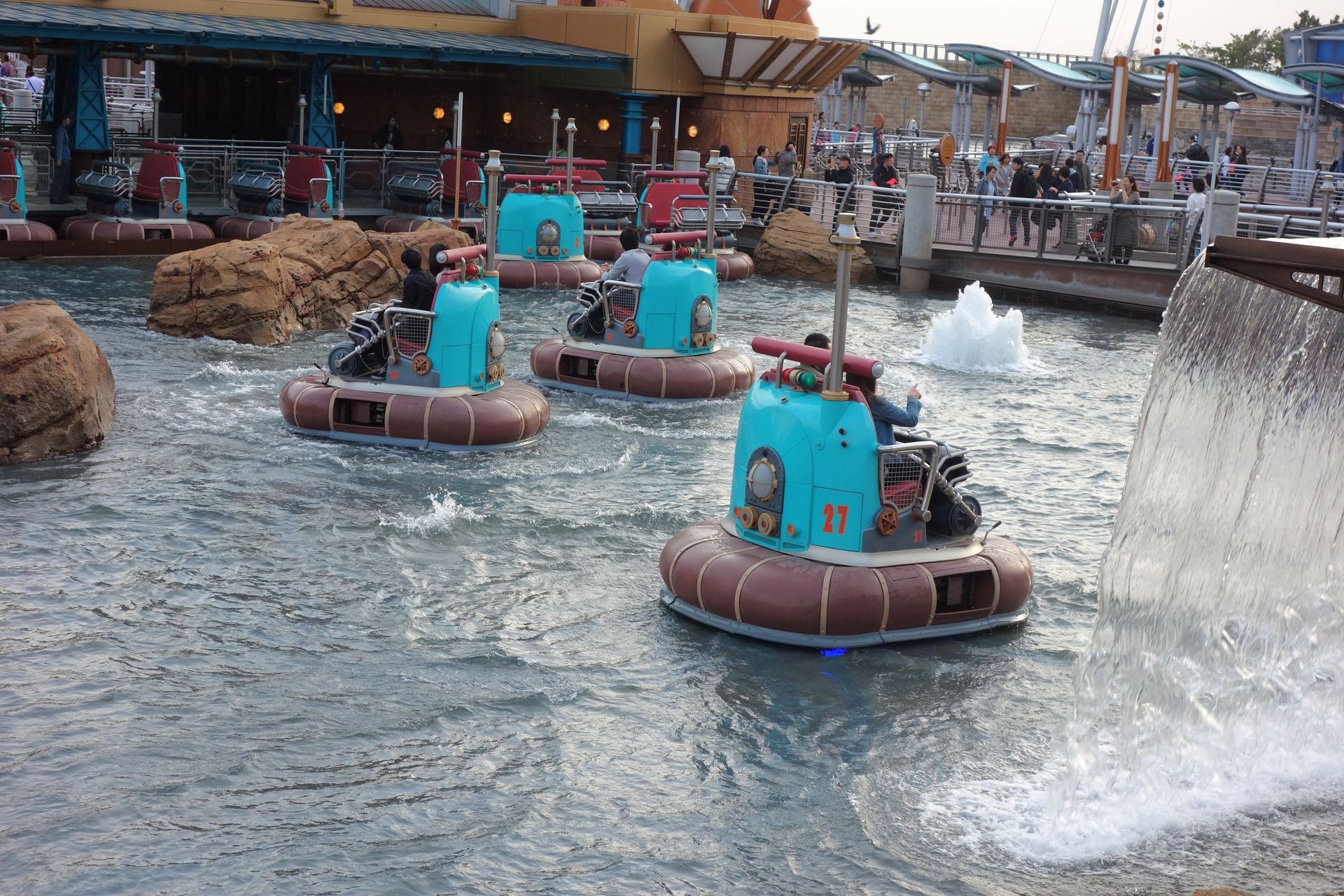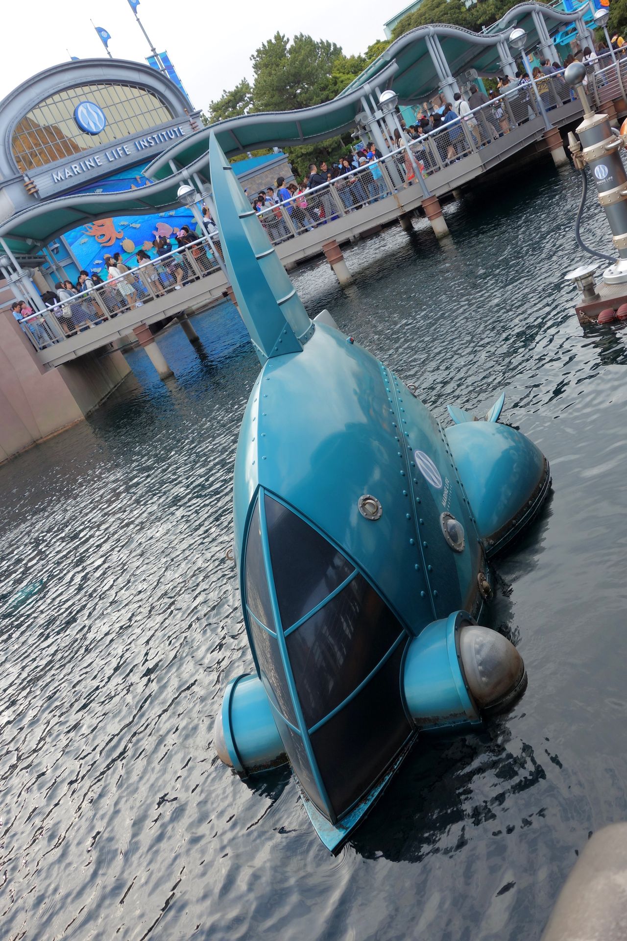 Fast 250 Personen werden schließlich zur Pre-Show eingelassen. Dort erzählt man uns von einem neuen Metall, welches durch die Zuführung von Elektrizität schrumpft. In der Mitte des Raumes ist ein Modell des SeaRider ausgestellt. Ein U-Boot in Form eines Fischs. Ähnlich beeindruckend wie die verschwindende Statue im Tower of Terror schrumpft das Modell nach ein paar rosa Blitzen innerhalb von Sekundenbruchteilen auf Fischgröße. Und dann dürfen jeweils 122 Besucher einen der beiden richtigen SeaRider betreten. Es handelt sich hierbei um Simulatoren, ziemlich ähnlich zu StarTours, nur größer. Die Fahrt selbst führt uns dann also im geschrumpften Fisch-U-Boot in die Tiefen des Meeres zu Nemo und seinen Freunden. Zusätzliche Monitore seitlich an der Decke erweitern den Aktionsradius, man starrt nicht nur stur auf die Leinwand vorne. Erfreulicherweise kommt man auch ohne 3D-Technik aus, als zusätzlichen Effekt gibt es ein paar Wasserspritzer. Eine weitere Ähnlichkeit zu StarTours ist der modulare Aufbau der Story. Der Film besteht aus insgesamt fünf Teilen, die jeweils unterschiedlich sein können. Leider versteht man auch hier kein Wort, da alles auf japanisch ist. Wer die beiden Filme kennt, sollte dem Geschehen aber weitestgehend auch ohne Worte folgen können. Die Szenen scheinen allesamt vertraut, obwohl keine davon direkt aus den Filmen entnommen wurde. Stattdessen handelt es sich um die längsten Animationen der Pixar-Zeichner, die nicht Teil eines ihrer Filme waren. Ein richtig guter Simulator mit schön sanften Bewegungen. Sollte man bei ausreichend Zeit definitiv mal mitnehmen.