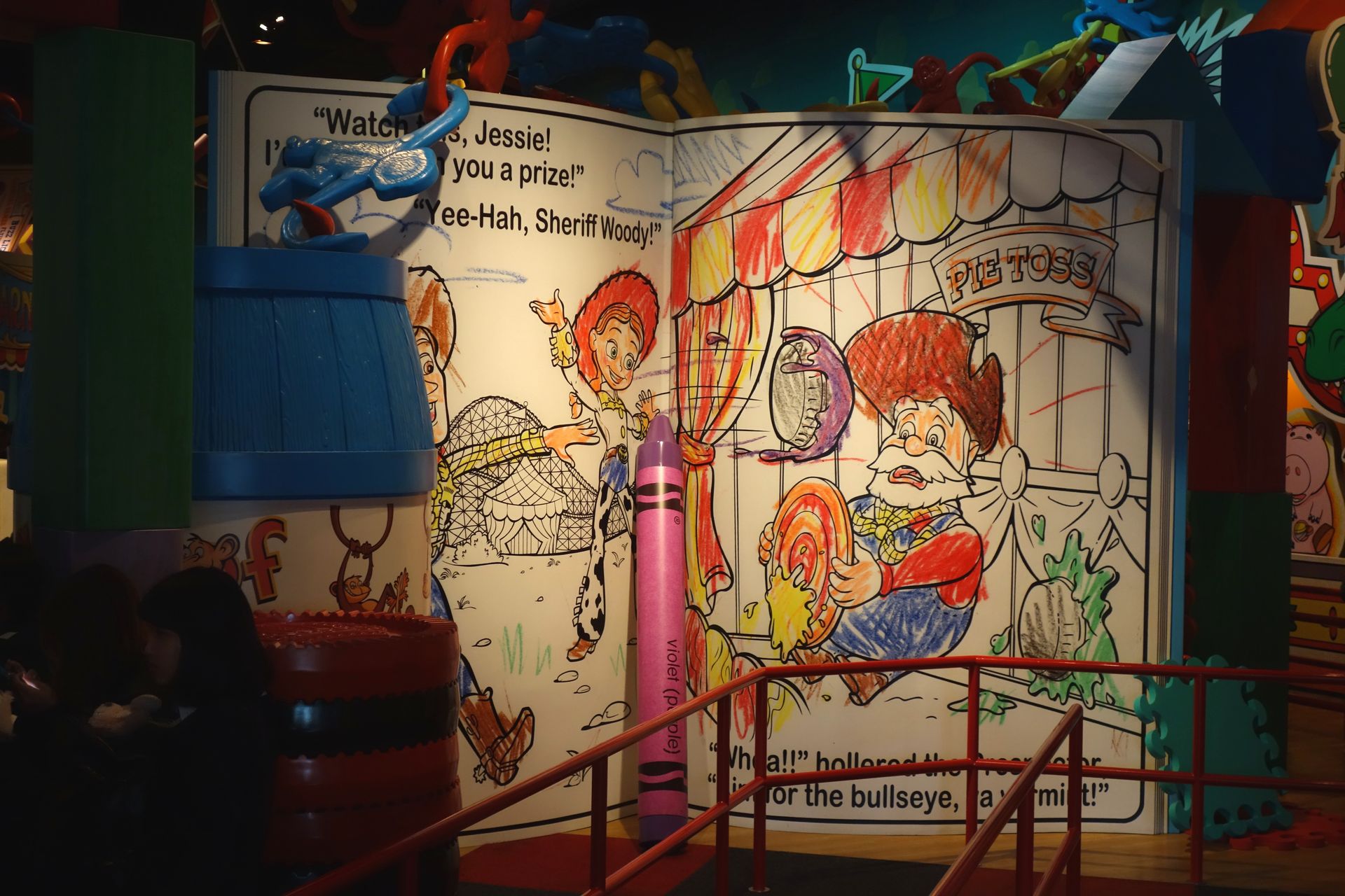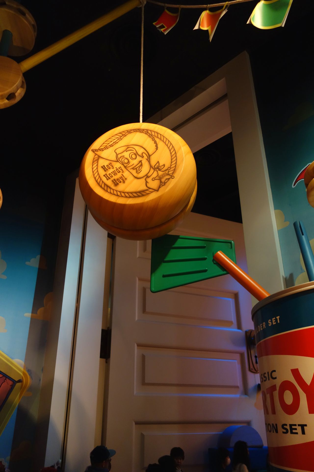 Bis man durch eine gigantische Tür in Andys Zimmer gelangt. Dort befindet sich die Station des Darkrides, die Strecke verschwindet dann unter dem Bett.