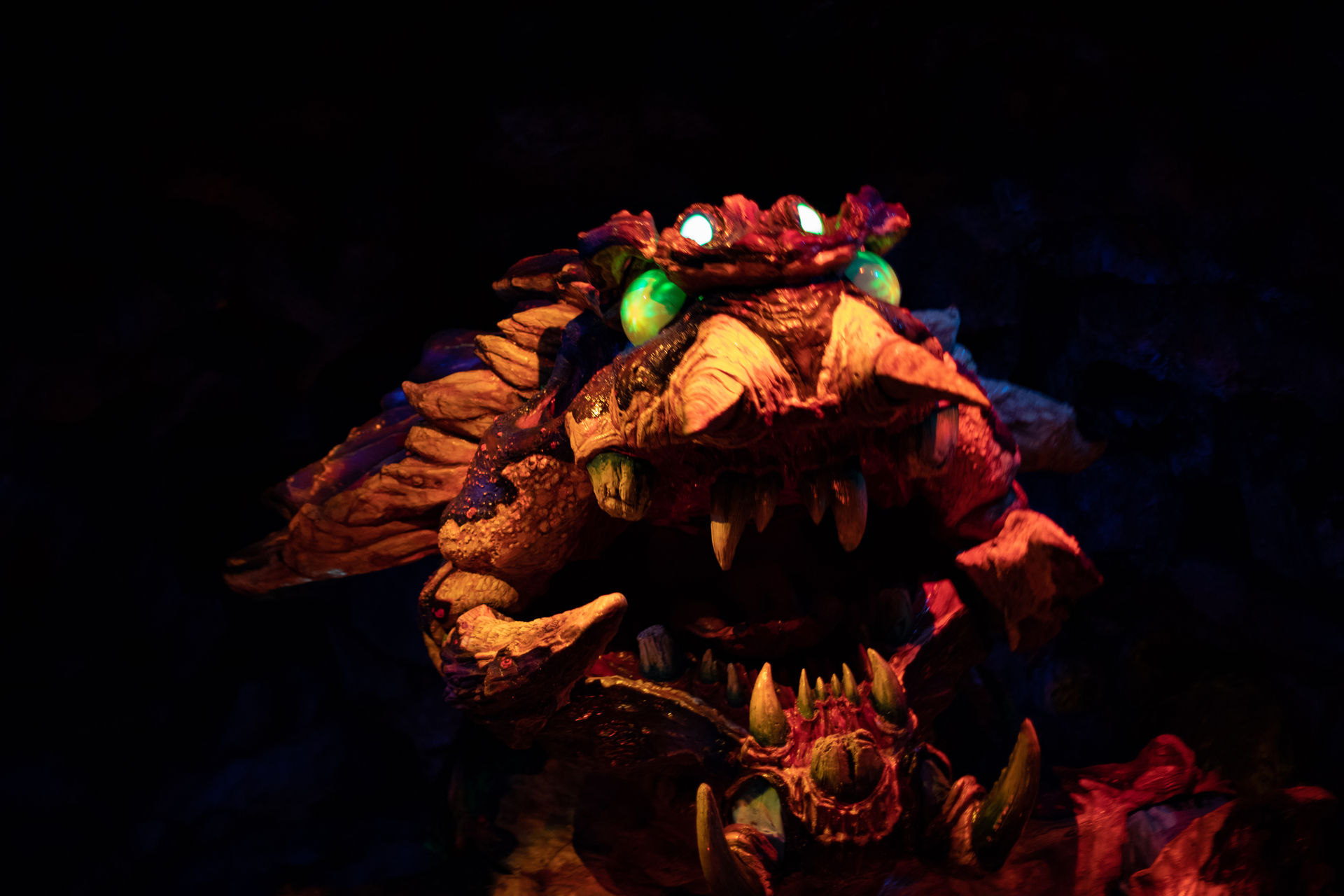 Nach vielleicht fünf Minuten Wartezeit konnten wir in einem der Fahrzeuge Platz nehmen und die Reise zum Mittelpunkt der Erde antreten. Zunächst geht es ganz gemütlich an unzähligen bunt leuchtenden Kristallen in der Crystal Cavern vorbei, ehe uns der Biolumescent Tunnel in den Giant Mushroom Forest führt. Zwischen all den überdimensionalen Pilzen - die auch in der Romanvorlage Erwähnung finden - tummeln sich diverse seltsame Kreaturen, die man nur schwer beschreiben kann. Natürlich alles in bunten Neonfarben leuchtend, da gemäß Story biolumineszierendes Moos und phosphoreszierendes Plankton im Wasser tief unter der Erdoberfläche als Lichtquellen dienen. Und die urzeitlichen Wesen leuchten natürlich, weil sie die leuchtenden Pflanzen fressen. Schon in der Base Station hatte man Warnungen vor steigender vulkanischer Aktivität hören können. Aber der Forscher im Communication Center war gerade in der Pause und hatte davon entsprechend nichts mitbekommen. Das wird uns nun zum Verhängnis, denn ein kleines Erdbeben hat zum Einsturz des weiterführenden Tunnels geführt, sodass die Fahrzeuge in einen anderen Tunnel ausweichen müssen. Dort hängen grün leuchtende Eier an den Wänden, die der aufmerksame Besucher bereits von Zeichnungen in der Queue kennen könnte. Sie scheinen zu einer unbekannten Spezies monströser, prähistorischer Kreaturen zu gehören, die Nemo selbst aber noch nicht weiter erforschen konnte. Bevor man sich aber darüber Gedanken machen kann, erreicht man ein unterirdisches Meer, wie es auch im Roman eine große Rolle spielt. Eine Höhle so gigantisch, dass sie ihr eigenes Wetter hat. In diesem Fall ein kräftiger Gewittersturm, der zusammen mit dem phosphoreszierenden Meer die einzigen Lichtquellen so tief unter der Erde darstellt. Einer der Blitze trifft unser Fahrzeug, woraufhin das Tempo ganz kurz leicht ansteigt. Schließlich nähert man sich mehr und mehr dem Höhepunkt der Fahrt. Orange Lava leuchtet zwischen Felsspalten und Rauch steigt auf. Der Vulkan steht kurz vor dem Ausbruch. Die Mitfahrer auf der linken Seite können sich an einem kleinen Feuereffekt wärmen, während sich auf der rechten Seite das Lavamonster in Form eines gigantischen Animatronics erhebt.