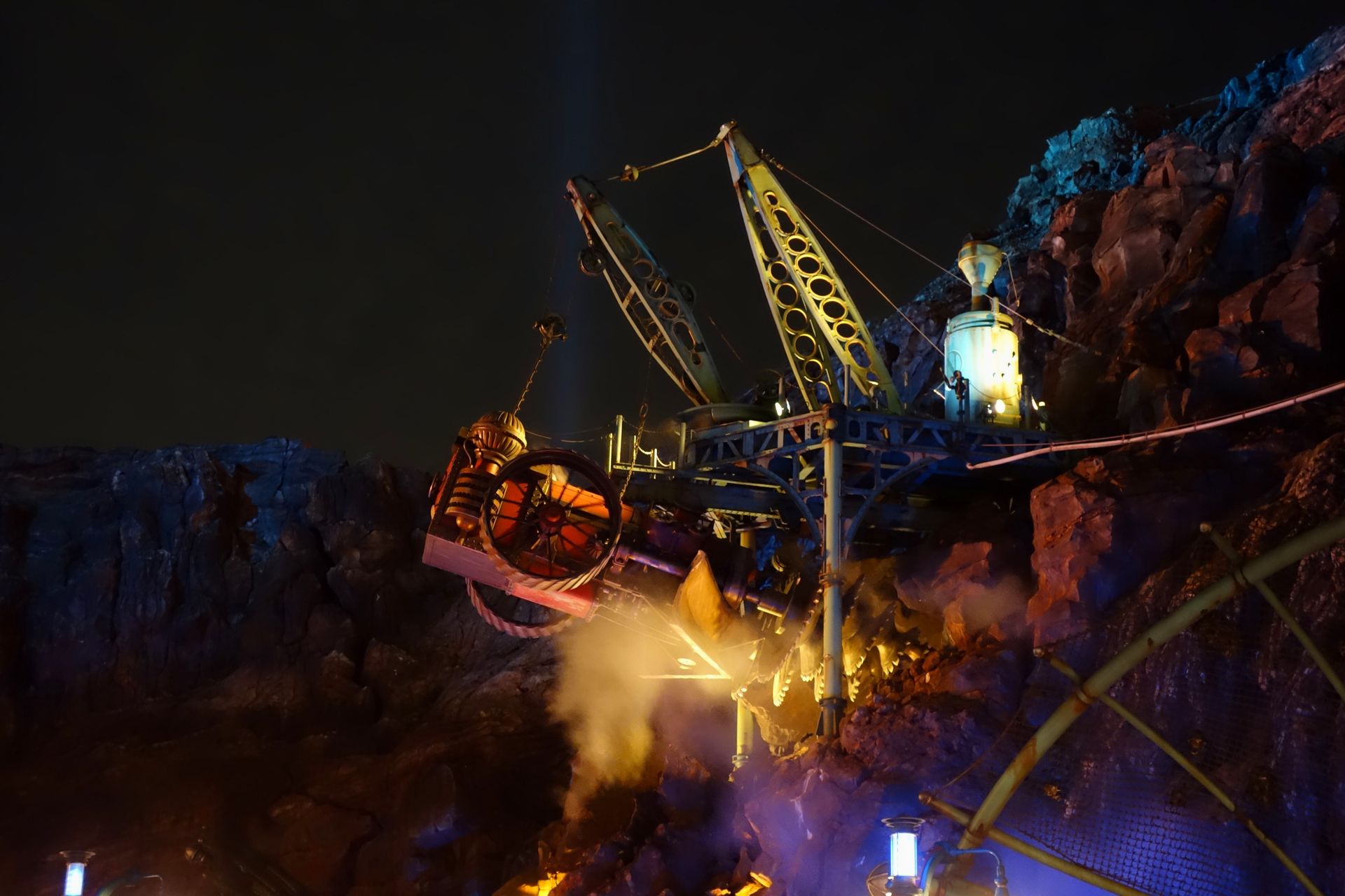 Natürlich hat man sich auch bei JttCotE von Jules Verne inspirieren lassen. Hier und da weicht man allerdings von der Vorlage ab. Während diese nämlich absolut nichts mit Kapitän Nemo zu tun hat, wird man hier von eben jenem in seinem Forschungsstützpunkt auf Mysterious Island begrüßt und zu einer Reise zum Mittelpunkt der Erde eingeladen. Dazu stellt er seine Flotte von dampfgetriebenen Minenfahrzeugen zur Verfügung, die sich mit einer großen Schaufel an der Front ihren Weg durch die vorbereiteten Gänge und Höhlen im Erdinneren bahnen. Dabei fällt dem geneigten Freizeitpark-Fan schnell auf, dass es sich hier um eine Weiterentwicklung des 1999 in Epcot eröffneten Test Track handelt. Im Gegensatz zu den offenen Autos des Originals sind die Minenfahrzeuge hier allerdings mit einem Dach ausgestattet - selbstverständlich ohne die Sicht zu sehr einzuschränken. Auch sitzen die 6 Passagiere nicht in zwei Dreierreihen. so wie man es auch bei den 2012 eröffneten Radiator Springs Racers in Kalifornien umgesetzt hat, sondern in drei Zweierreihen. Und als Sicherungssystem kommt ein richtiger Beckenbügel anstelle der einfachen Sicherheitsgurte der beiden anderen Versionen dieses Ride-Typs zum Einsatz. Aus gutem Grund...
