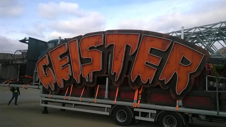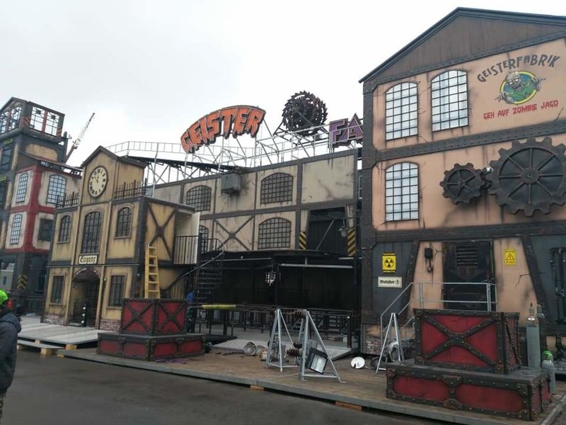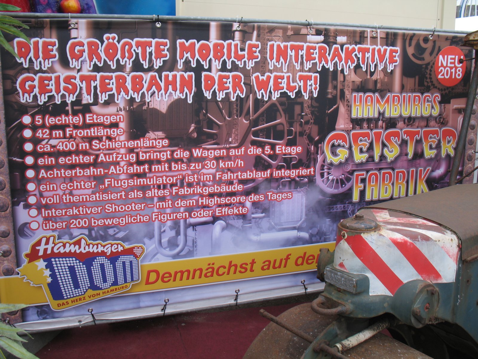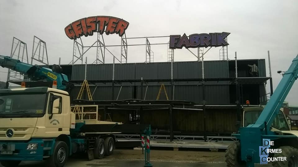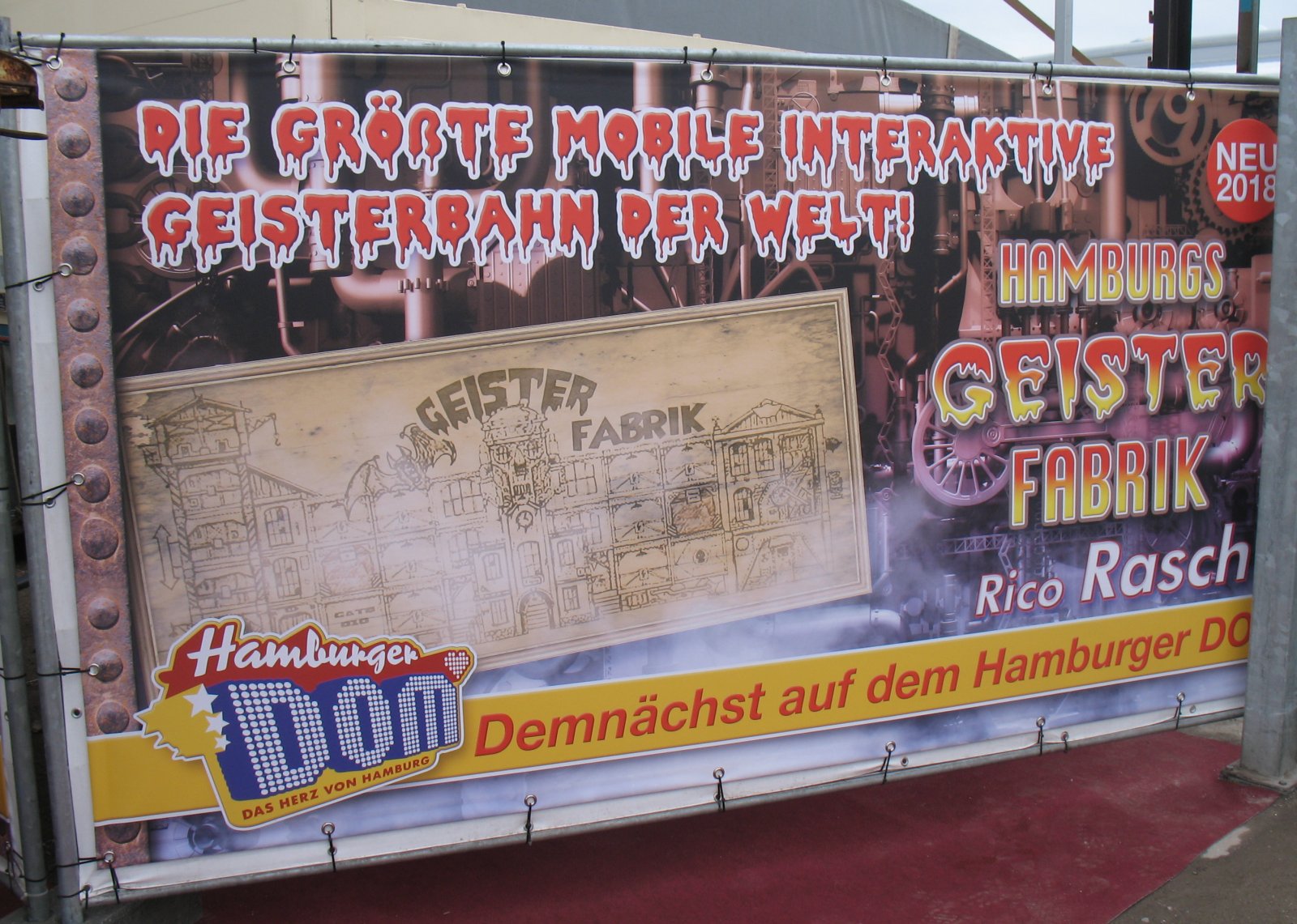 Zum Thema "Geisterfabrik" von Rasch die Info, das weiterhin mit der Premiere auf dem Sommerdom 2018 in Hamburg gerechnet wird und man die Bahn ab ca. Mai auf Herz und Nieren testen wird um gleich vom Start ein fehlerfreies Produkt präsentieren zu können. Hier noch drei Bilder von der Werbung für die Bahn, die aktuell auf dem Hamburger Frühlingsdom neben der ebenfalls zu Rasch gehörenden Geisterbahn "DOM Geister" auf zwei Bauzäunen zu finden ist: