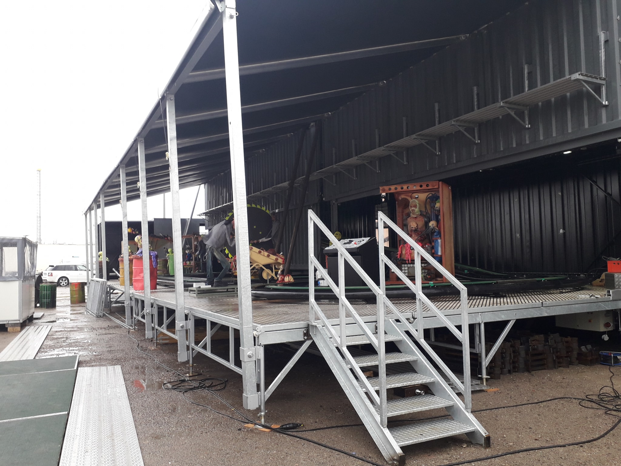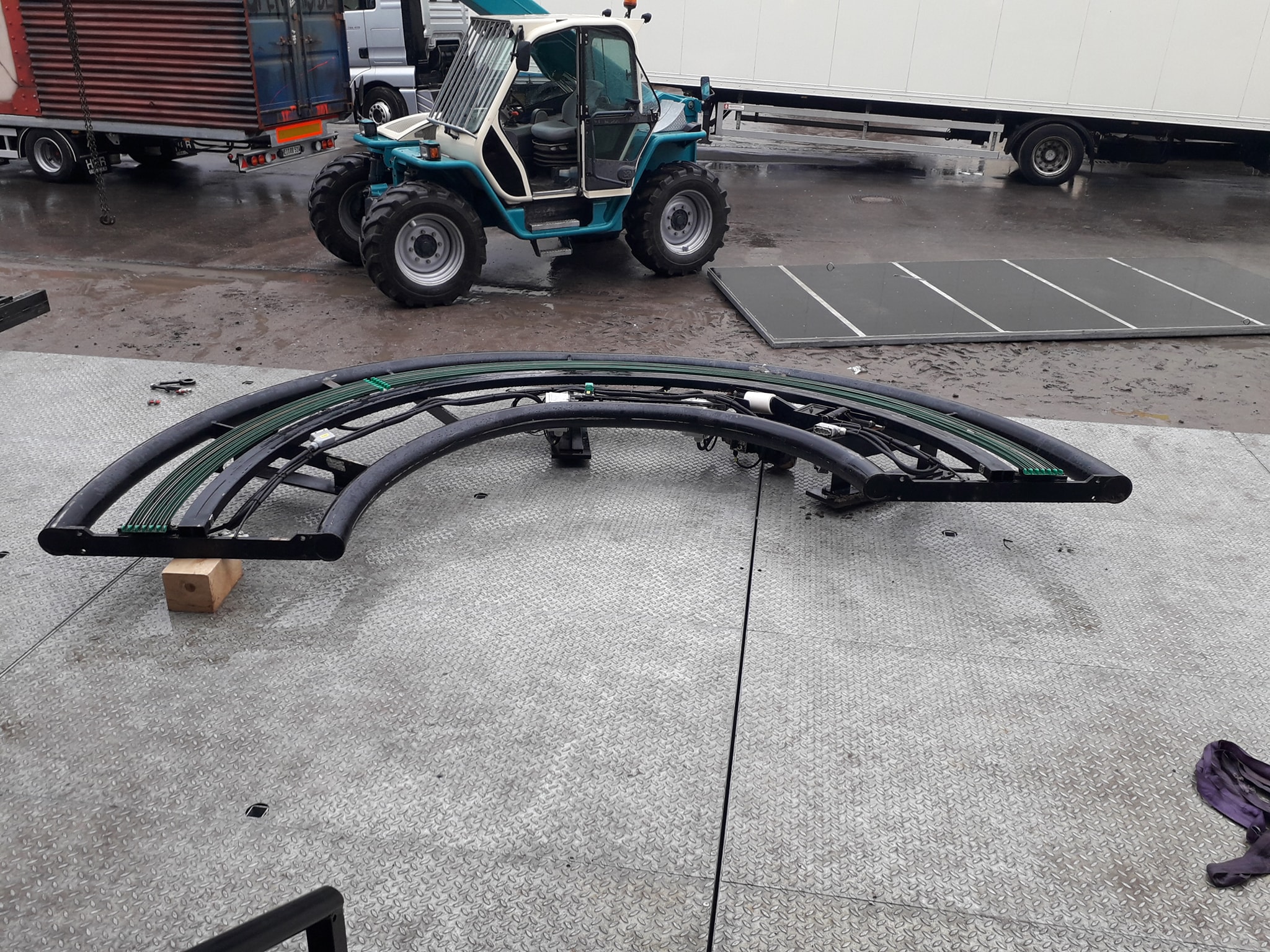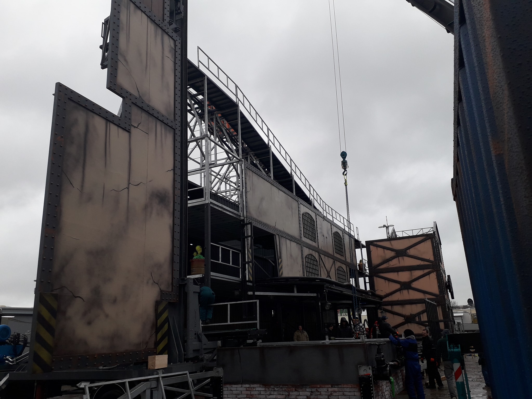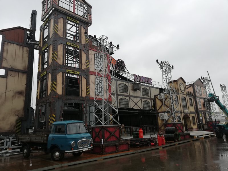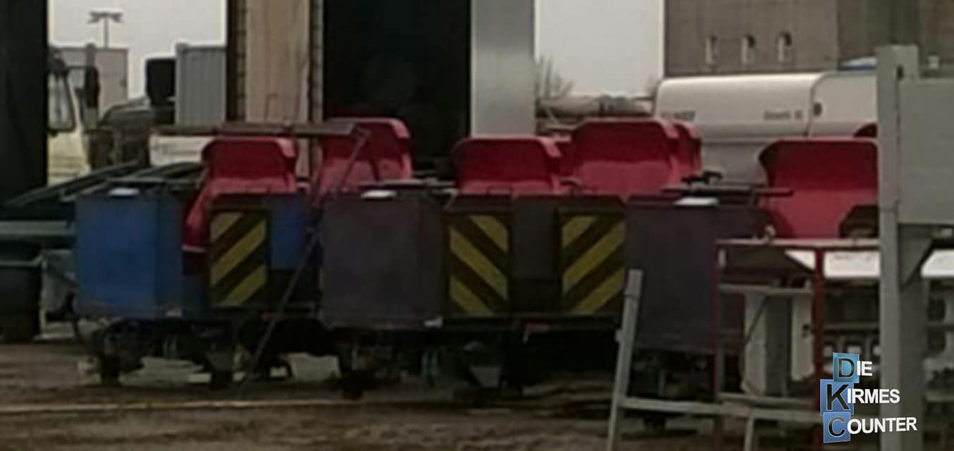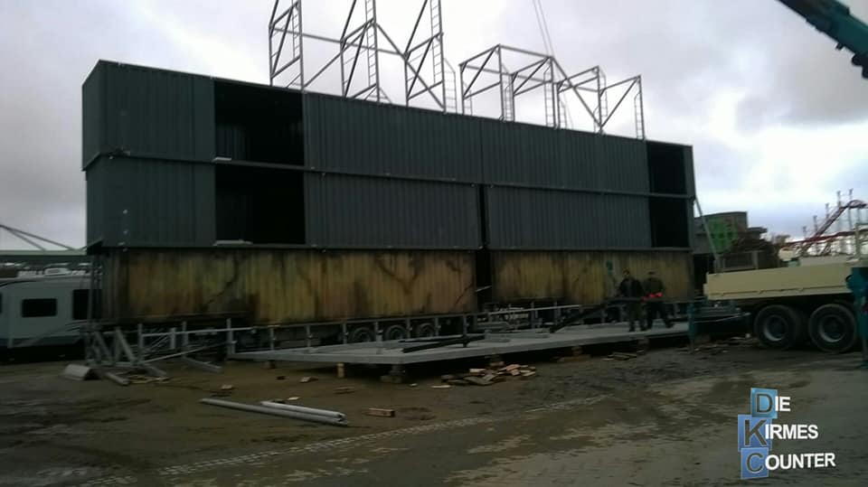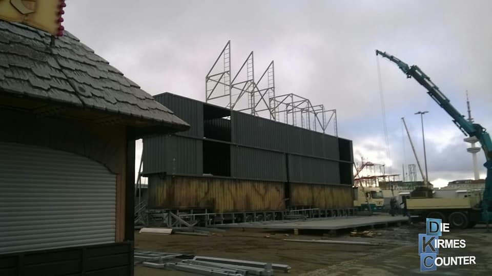 Es gibt neues Bildmaterial vom Aufbau, das von gestern stammt. Dort sind auch die Wagen sowie das Innere der unteren Halle zu sehen. Die Front sowie das Verlegen der Schienen schreitet auch voran: