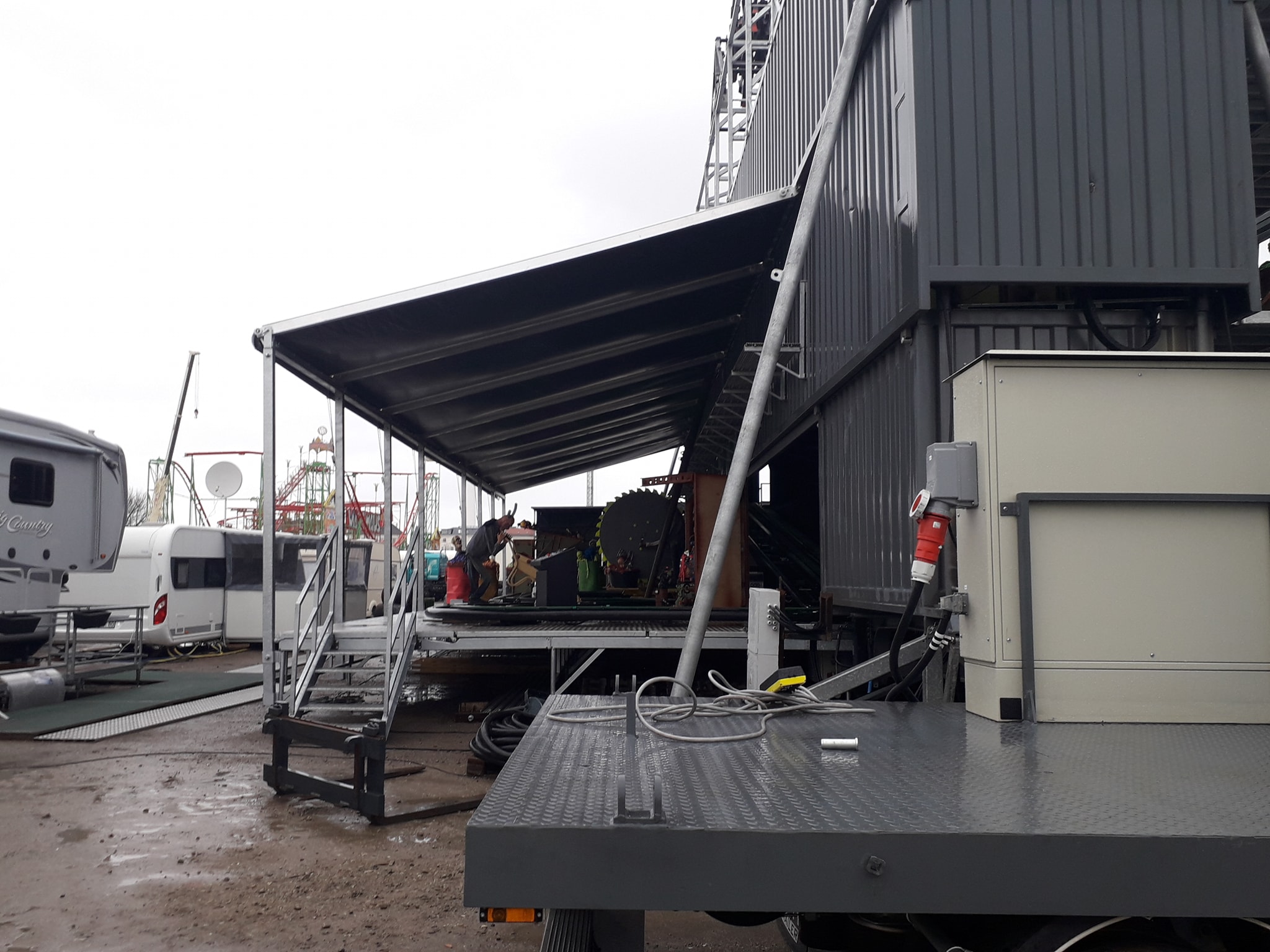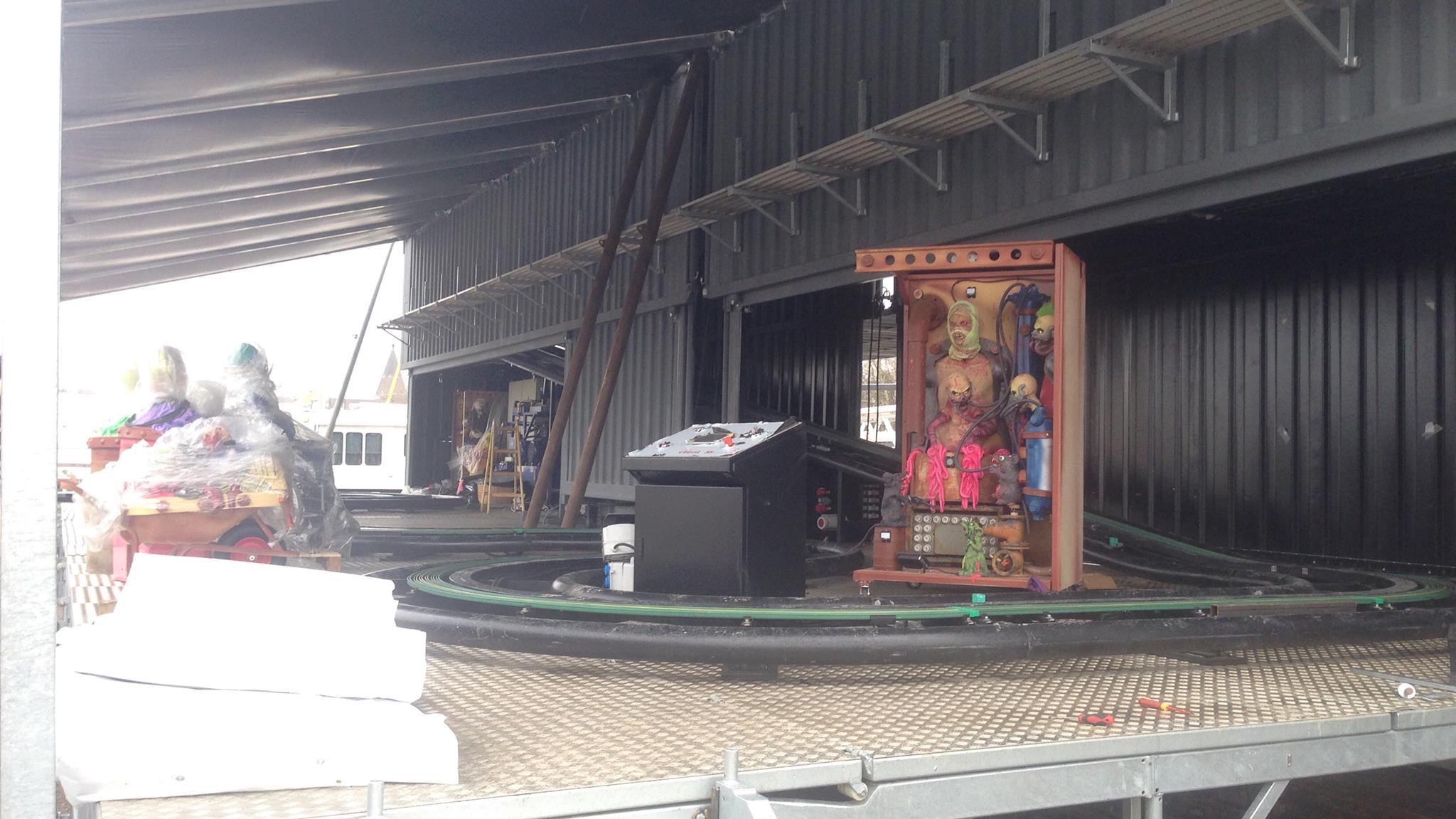 Ich vermute, das ist die Kasse und beide Container werden übereinander gestellt. Die Rutsche gehört zum Funhouse "Fuzzys Lachsaloon", der auch auf dem Frühlingsdom stehen wird.