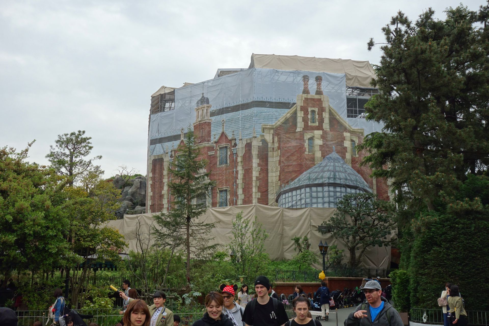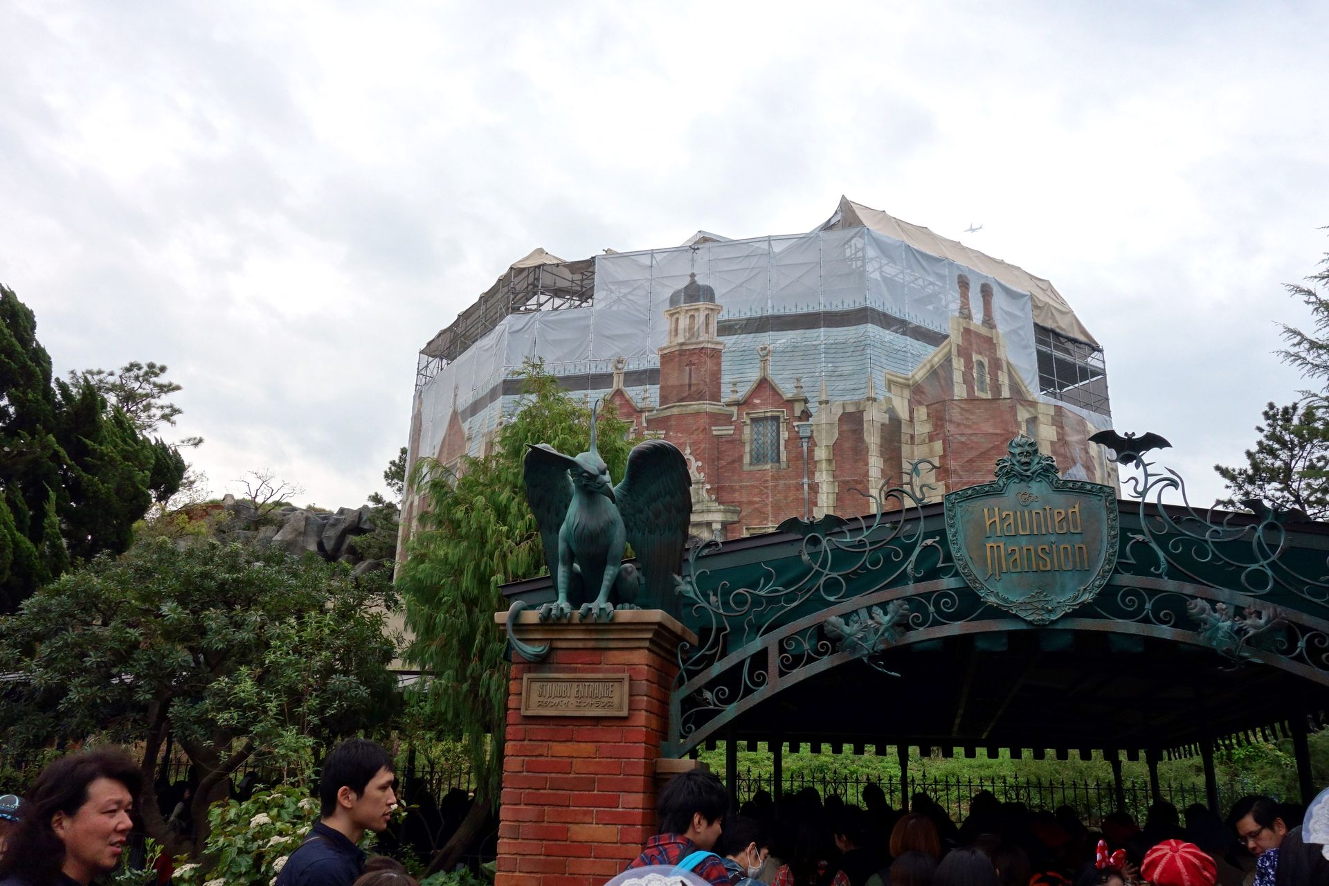 Ok, von Baustelle gab es außer der bedruckten Plane nichts zu sehen, die Queue führte hinein in die Haunted Mansion.